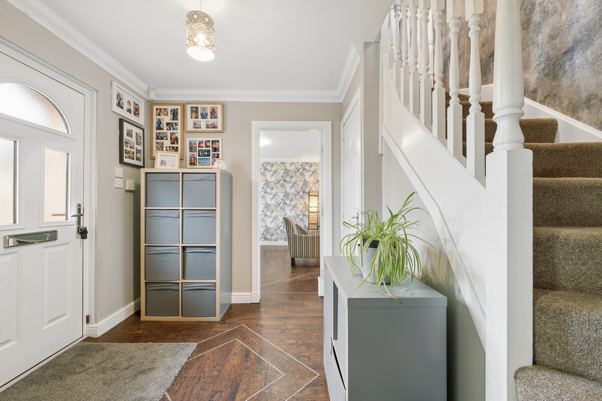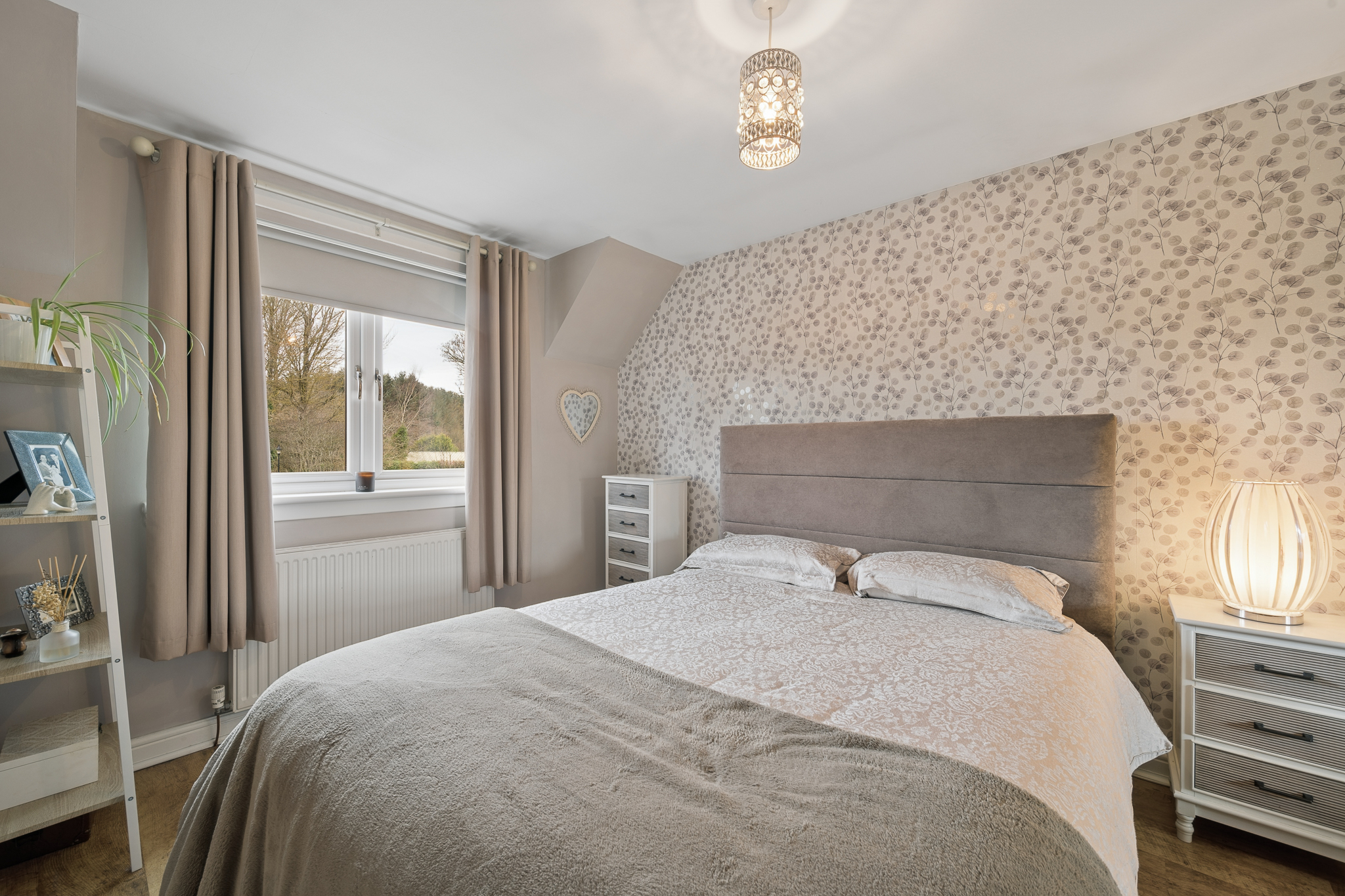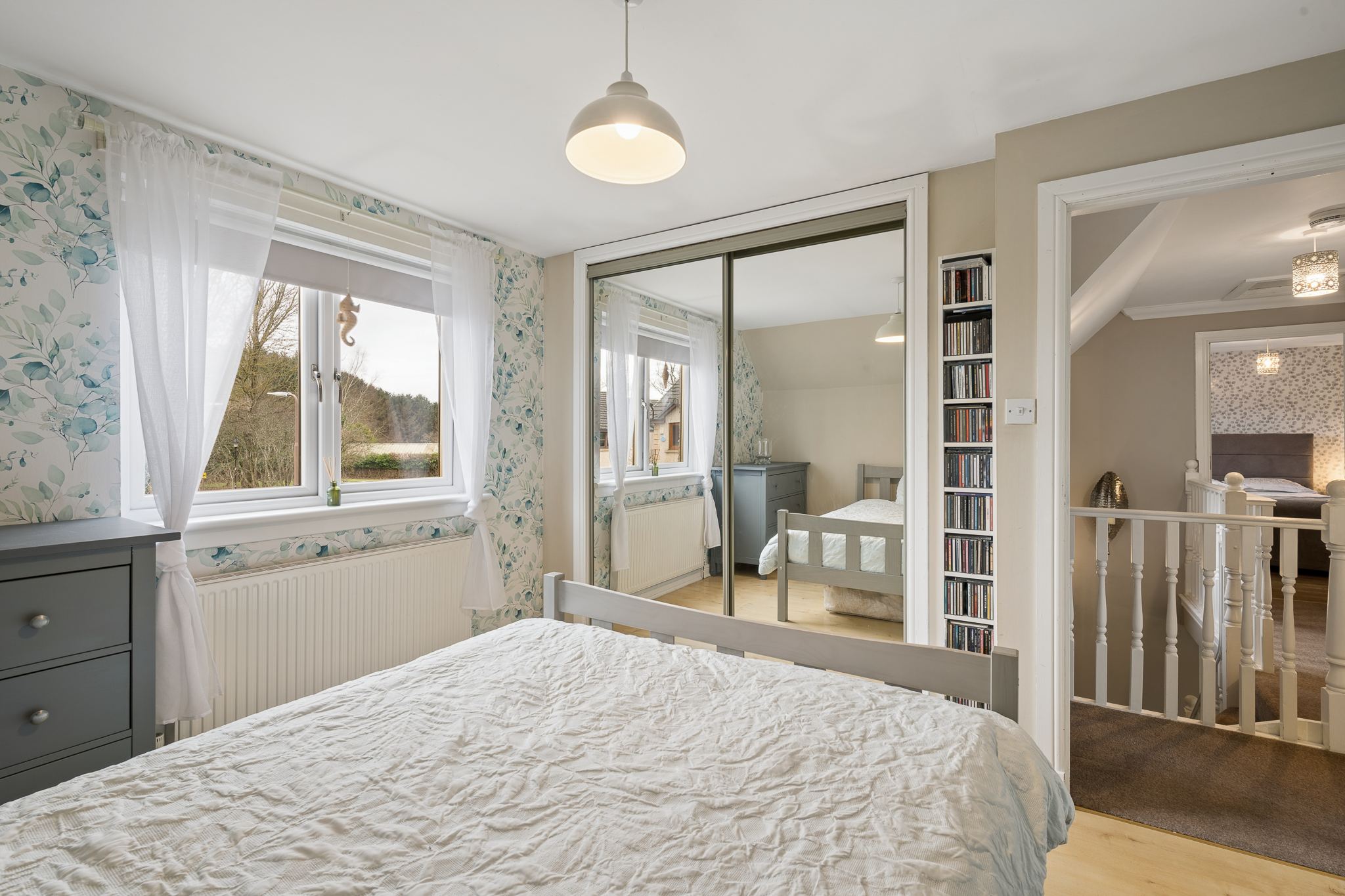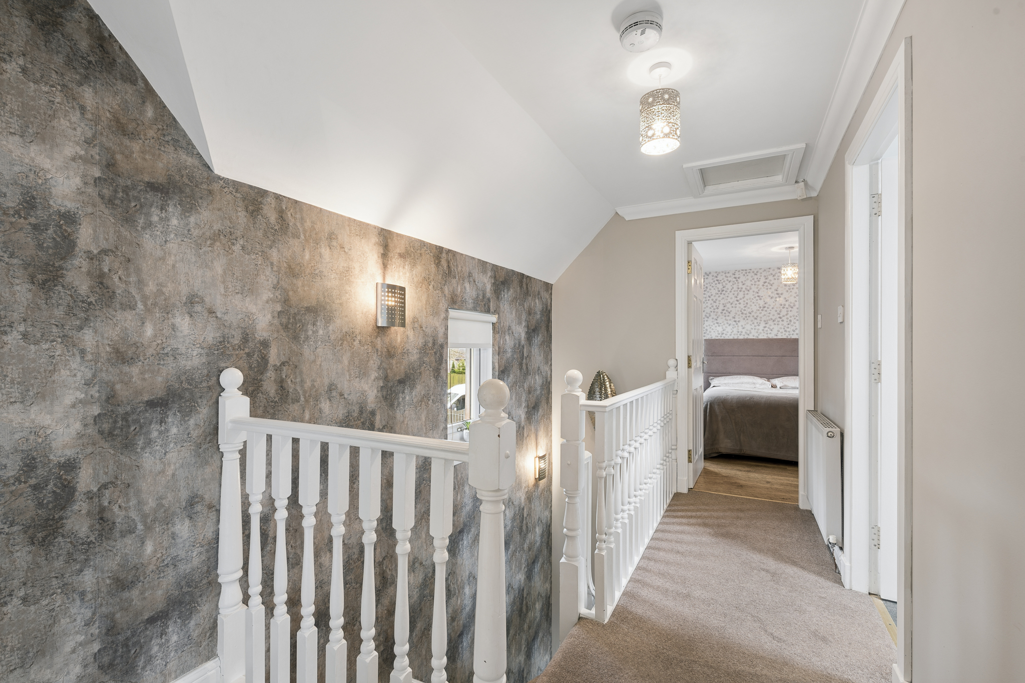 Ascending the staircase, the eye is immediately drawn to the stunning feature wallpaper lining the stairwell. Rich in texture and tone, it creates a striking design statement, beautifully enhanced by natural light from the window and the gentle glow of uplighters, which together add depth and character to this transitional space.