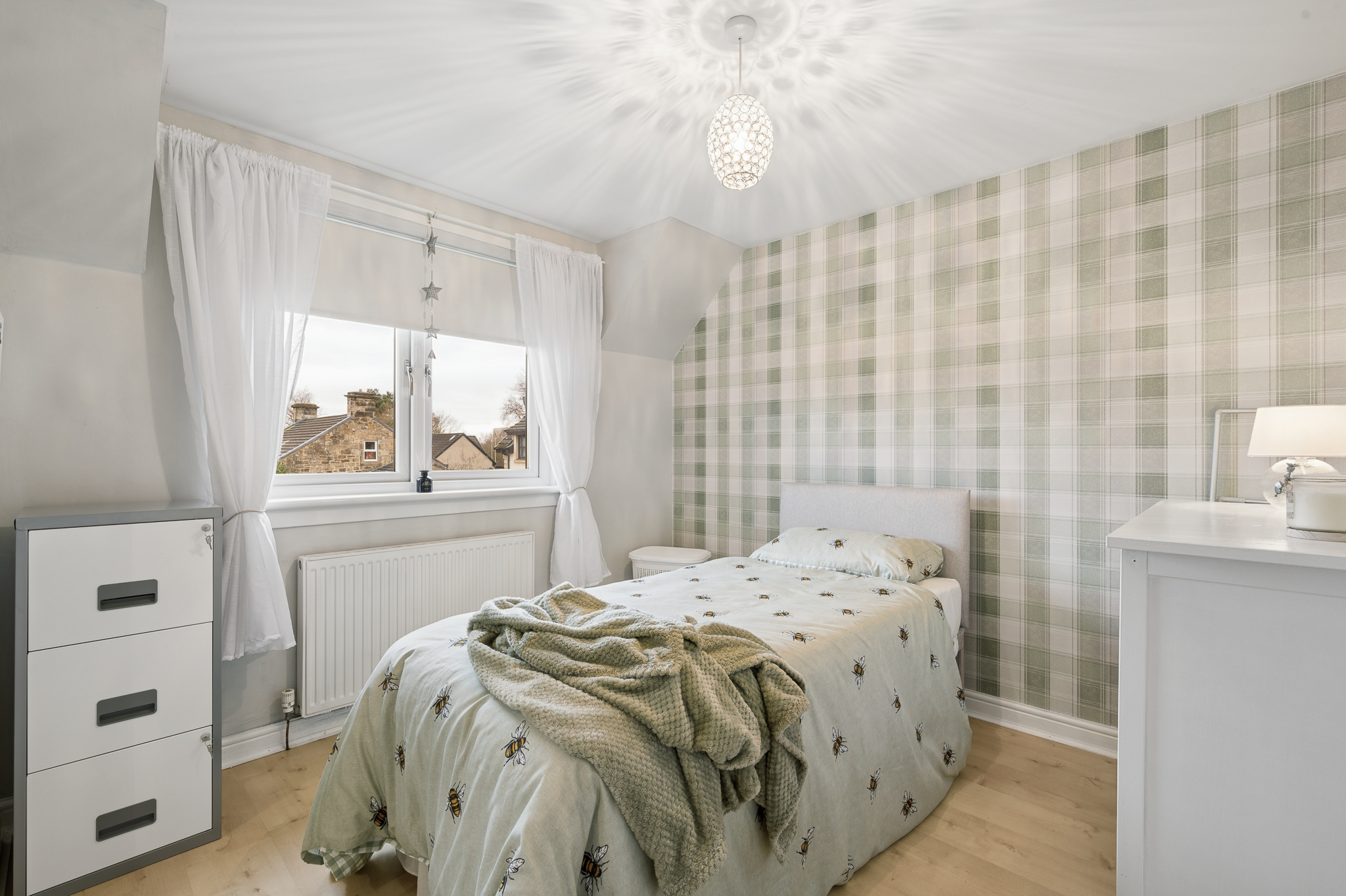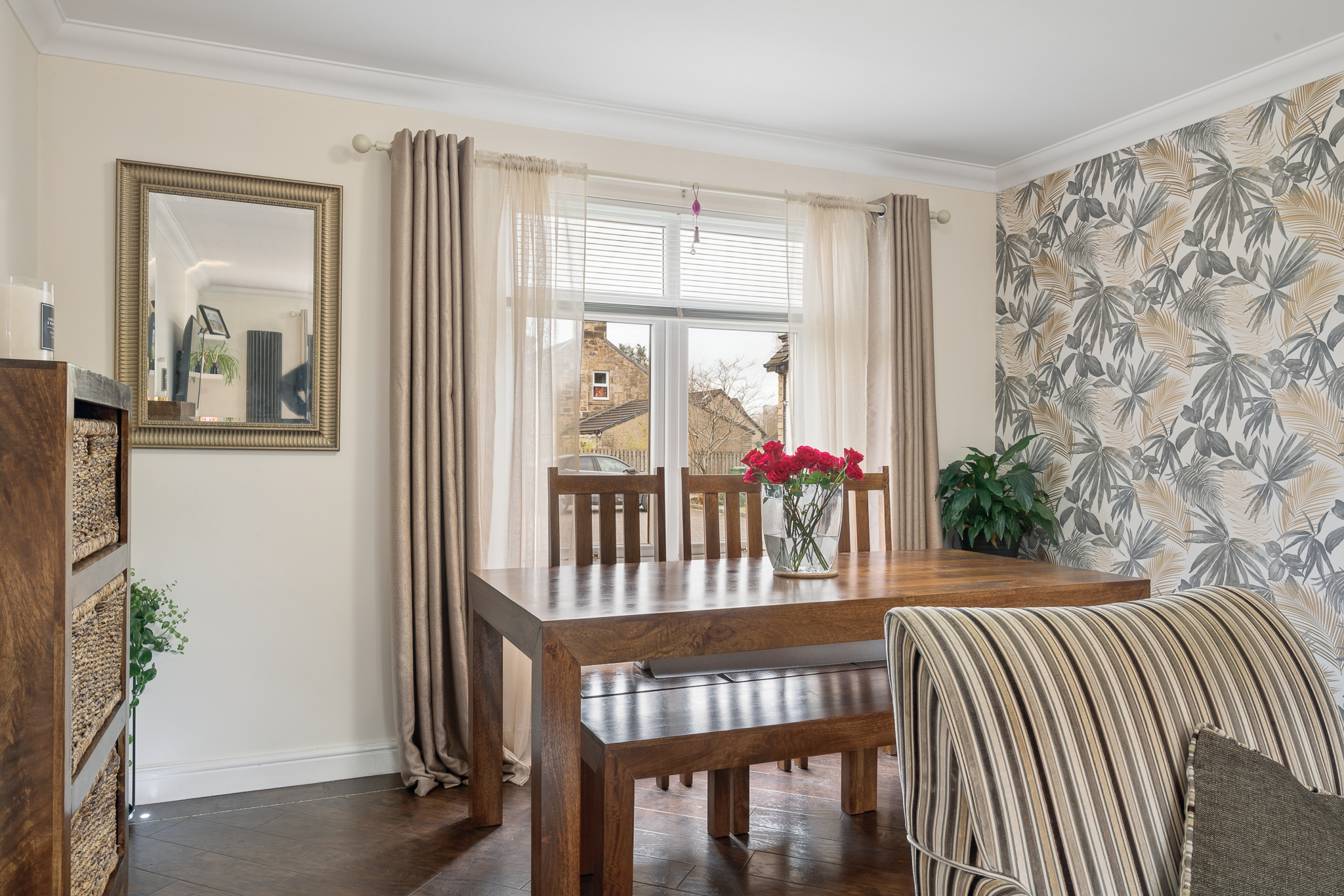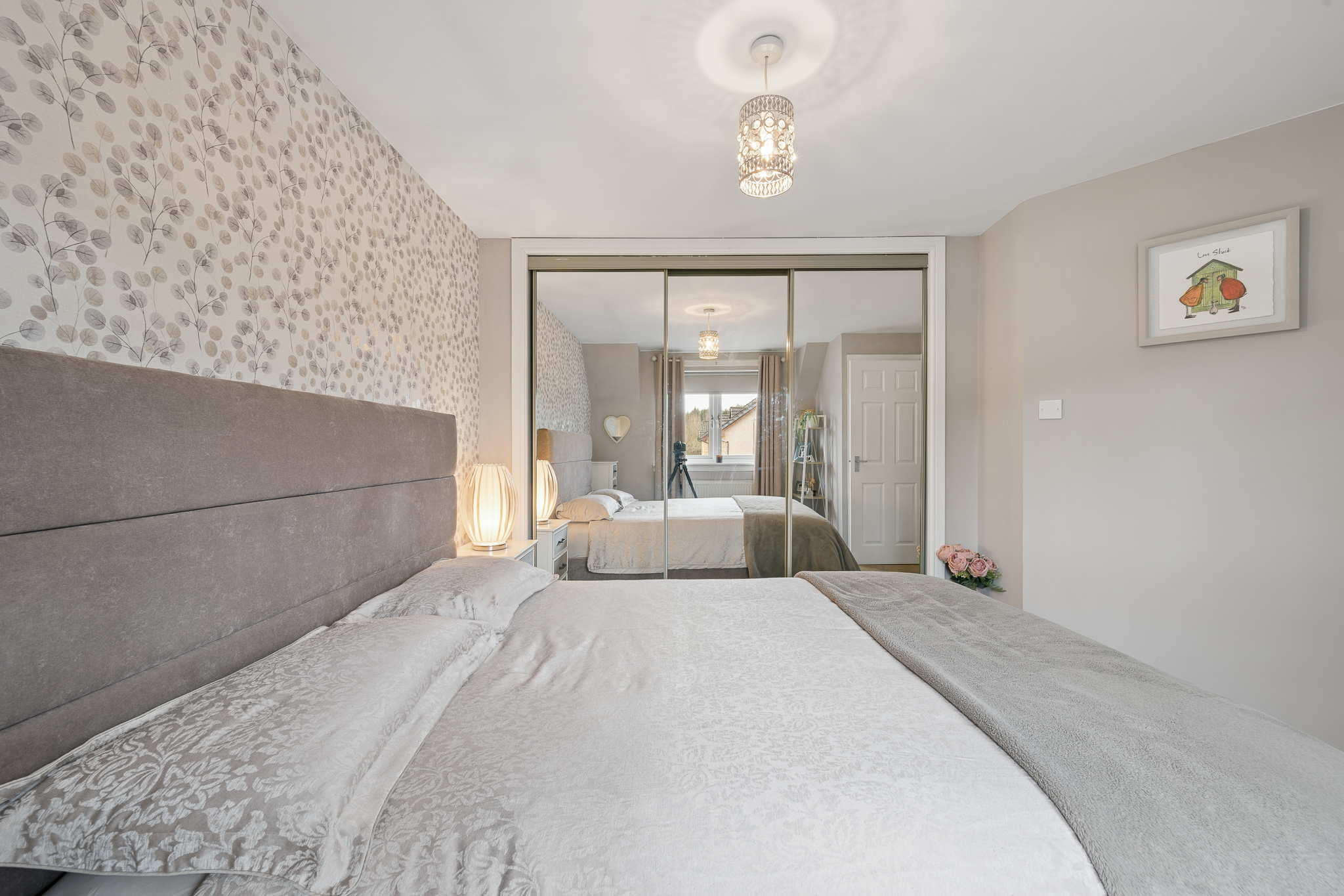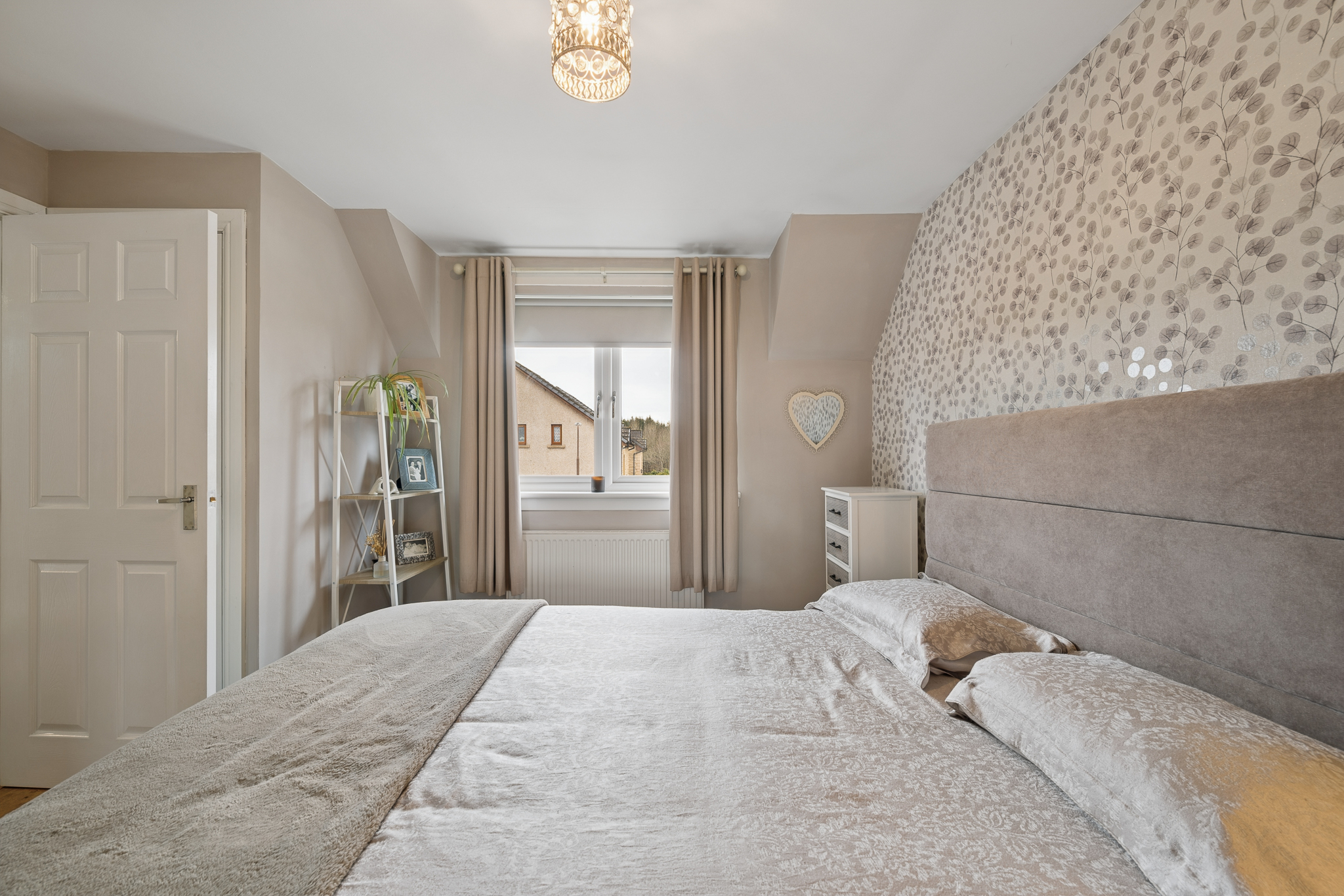 Ascending the staircase, the eye is immediately drawn to the stunning feature wallpaper lining the stairwell. Rich in texture and tone, it creates a striking design statement, beautifully enhanced by natural light from the window and the gentle glow of uplighters, which together add depth and character to this transitional space.