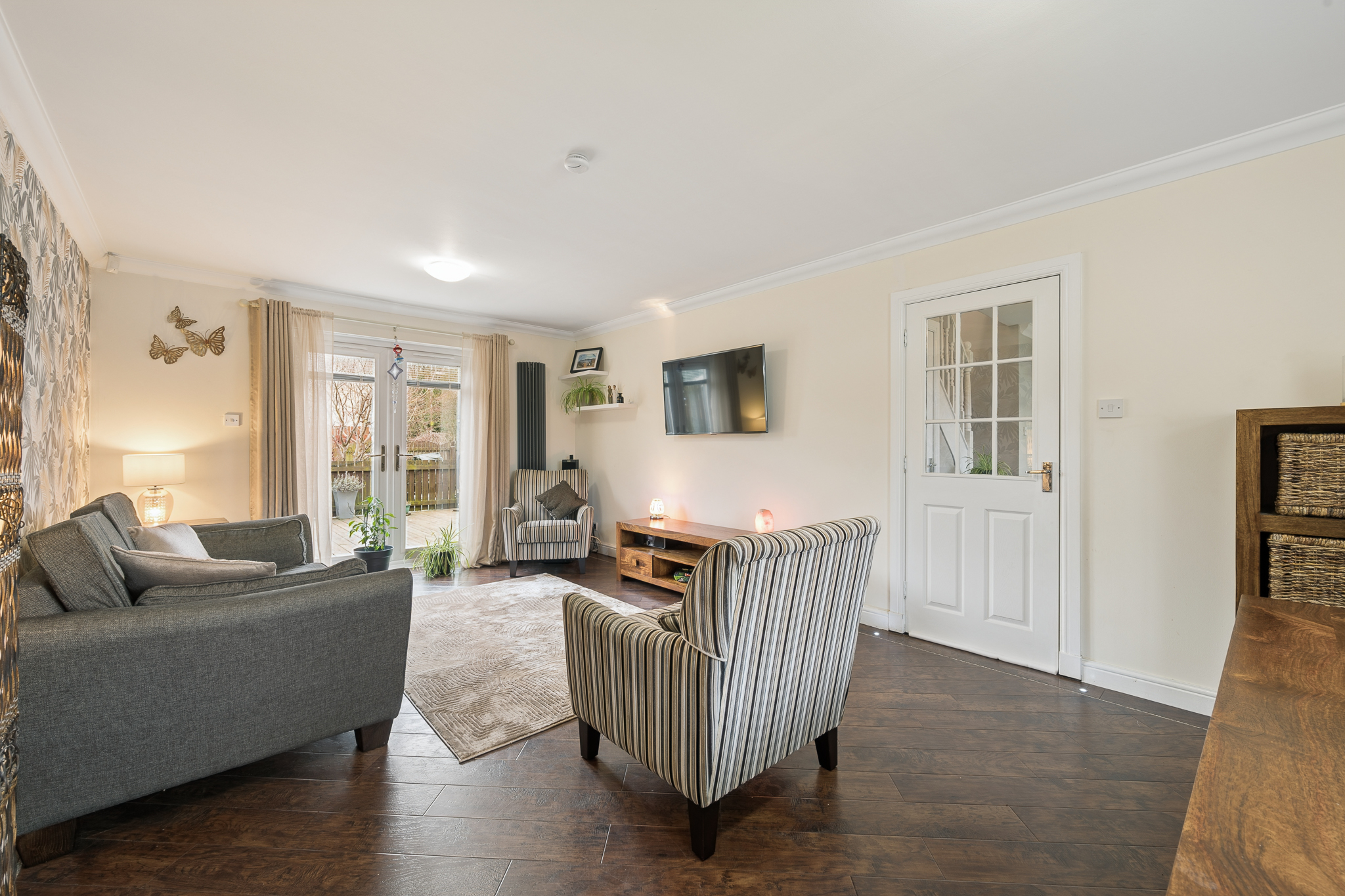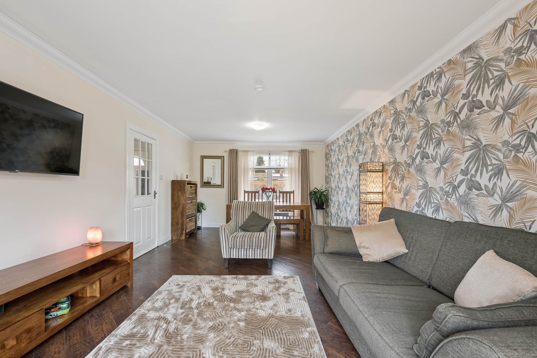 To the left, the living dining area unfolds as a fantastically proportioned, light filled space. There is generous room at the front of the room for a full dining table, ideal for both everyday meals and entertaining. Towards the rear, the comfortable seating area provides a relaxing retreat, beautifully framed by patio doors that draw in natural light and lead directly out to the decking area. The décor is cohesive and stylish, complemented by an LED border detail that accentuates the room’s clean lines, while bright lighting further emphasises the airy, open feel.