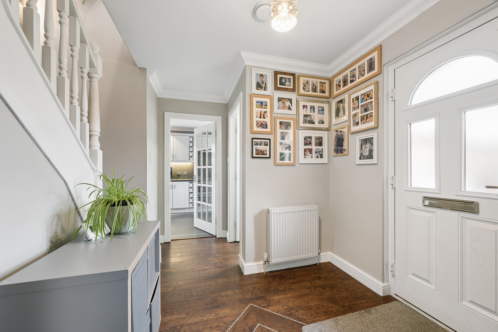 Stepping inside, you are welcomed by a bright entrance hallway where striking dark wooden flooring flows seamlessly throughout the ground level, creating a warm and contemporary first impression. Subtle LED spotlights traces the edges of the floor, adding a soft ambient glow that enhances both the sense of space and the home’s modern aesthetic.