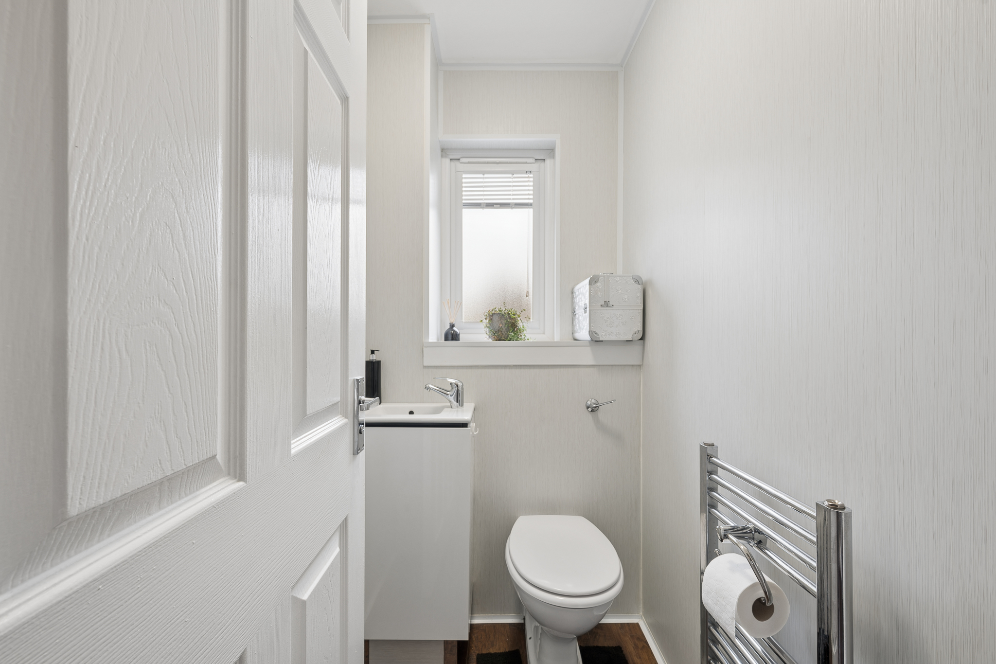 Returning to the hallway, the downstairs bathroom is conveniently positioned on the right hand side. Finished in a crisp, contemporary style, it offers practicality without compromising on presentation.