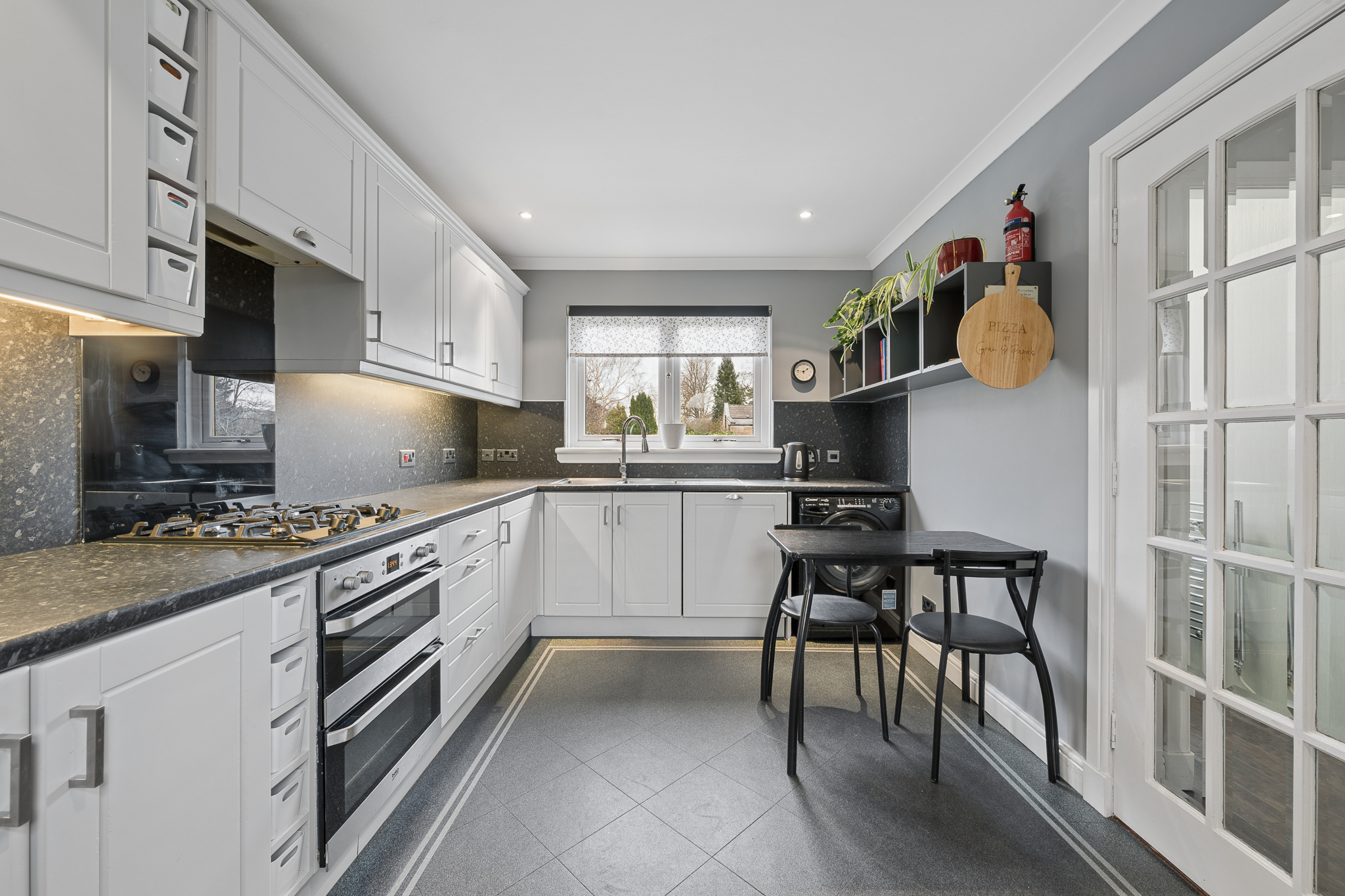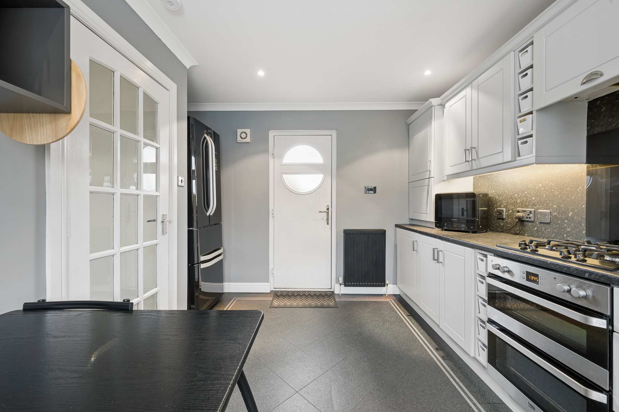 Straight ahead, the kitchen sits at the heart of the home. Thoughtfully designed, it provides excellent worktop and storage space alongside room for a dining table, making it both highly functional and sociable. The modern cabinetry and sleek finishes are enhanced by natural light from the window, while a second external door offers direct access to the rear garden, a feature that adds exceptional everyday convenience.