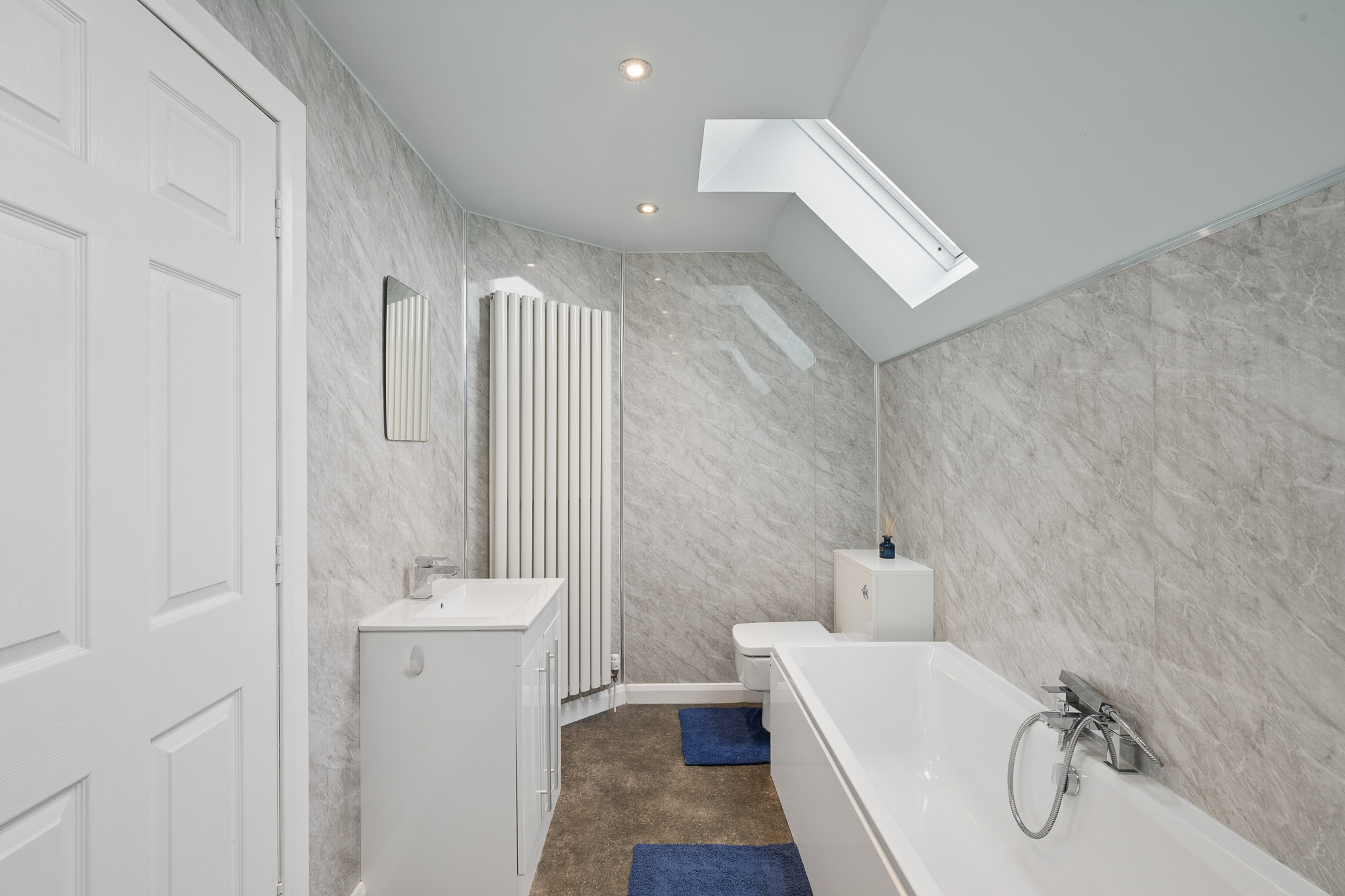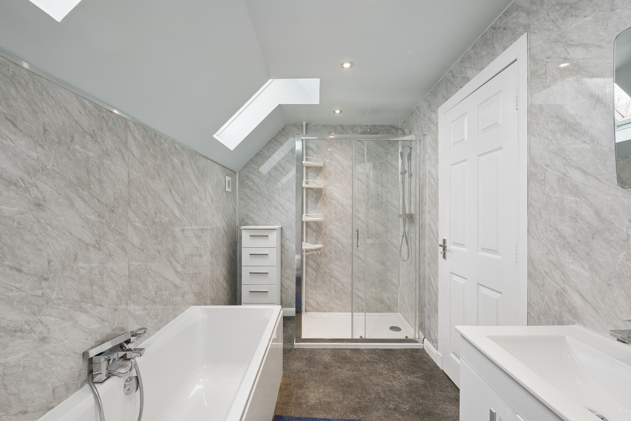 Adjacent lies the family bathroom, styled as a luxurious four-piece suite. It features a spacious double walk in shower, a large bath ideal for unwinding and sleek wet wall panelling that delivers both visual appeal and low maintenance practicality. The overall finish is contemporary, clean and refined.