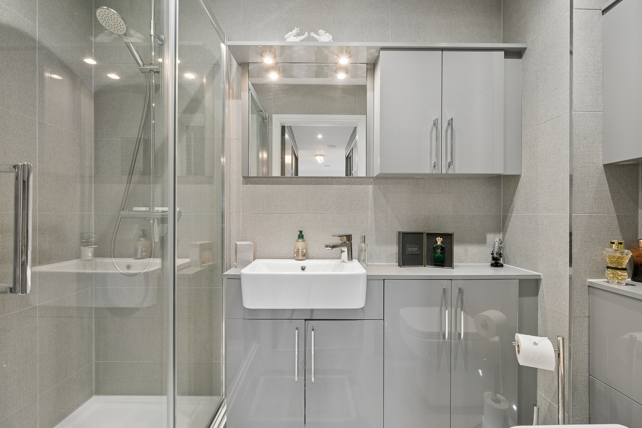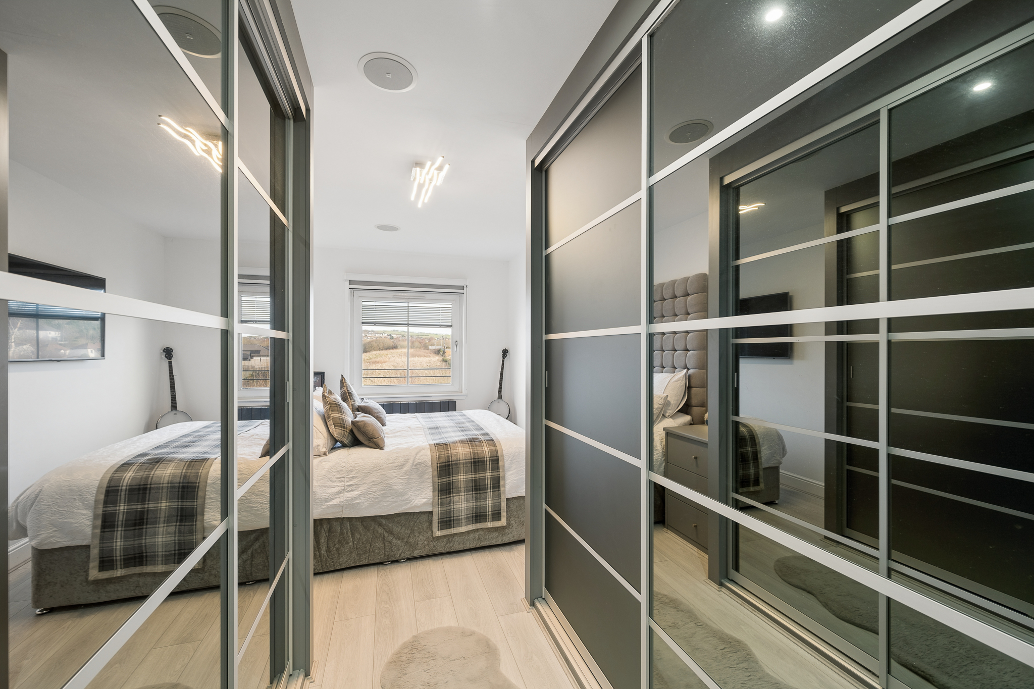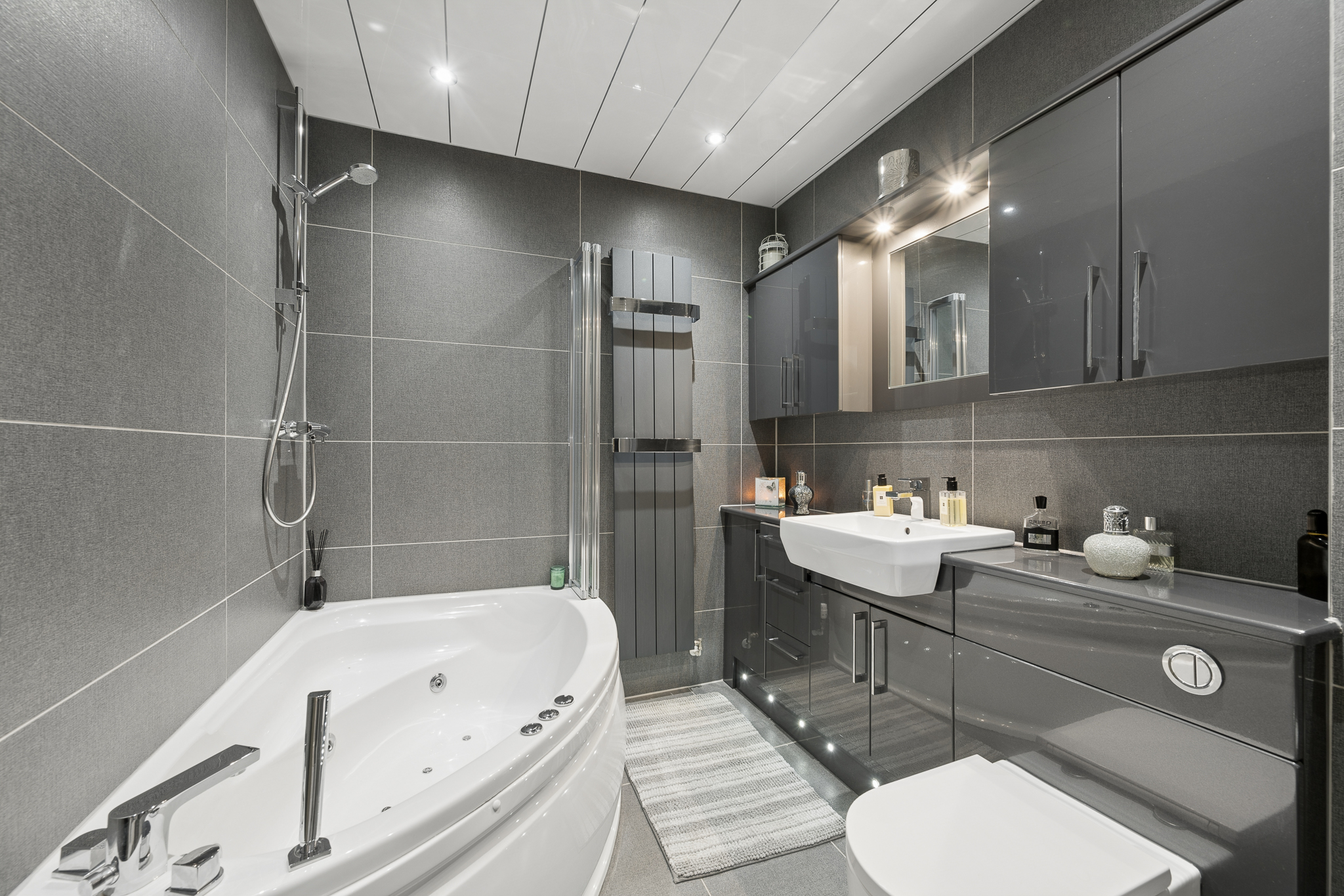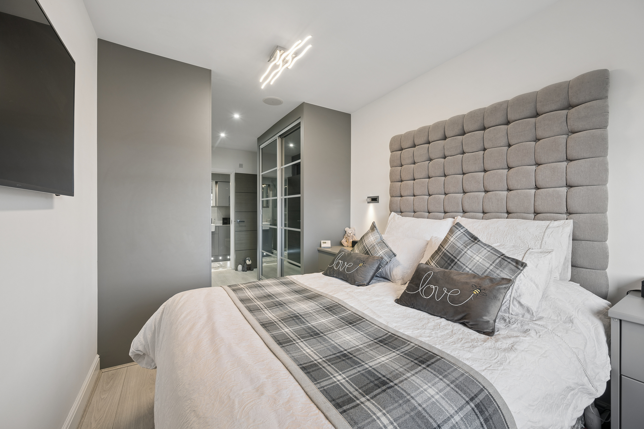 To the right, the main bathroom is a standout feature, designed with indulgence at its core. Beautifully finished with full height tiling and modern fittings, this luxurious space is centred around a stunning corner jacuzzi bath, transforming daily routines into spa like experiences. The combination of textures, tones and lighting creates an atmosphere of calm, elegance and understated luxury.