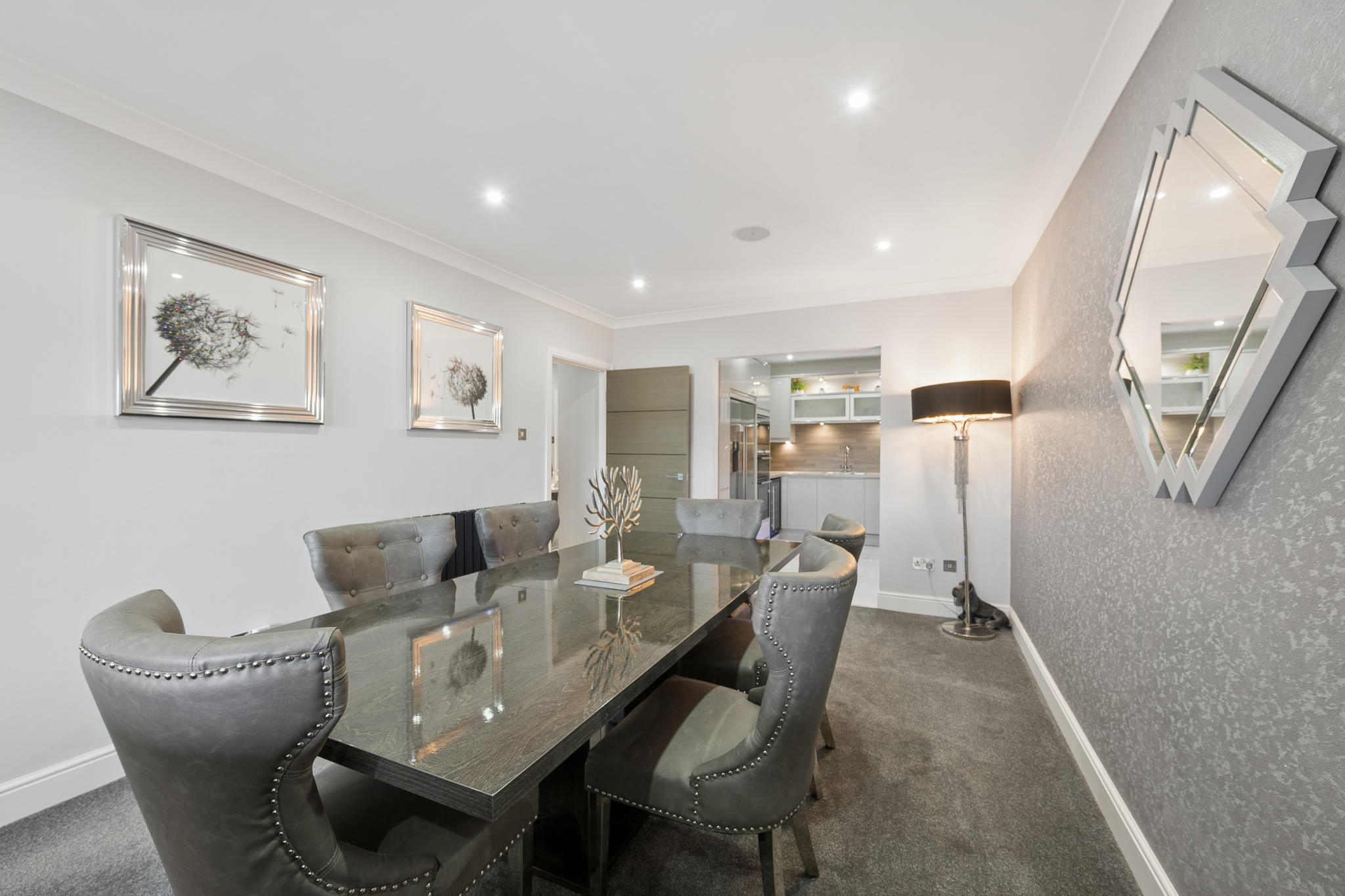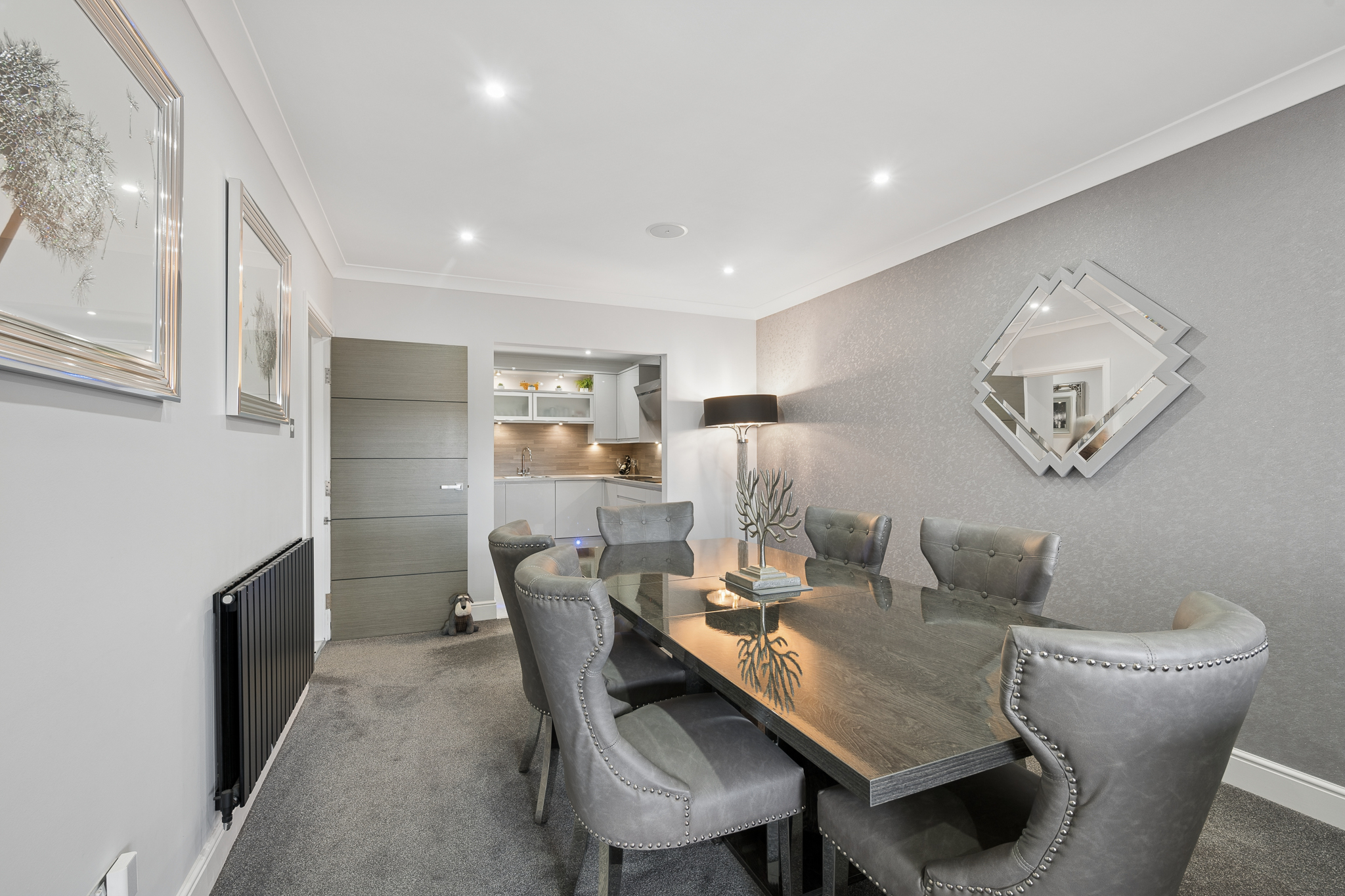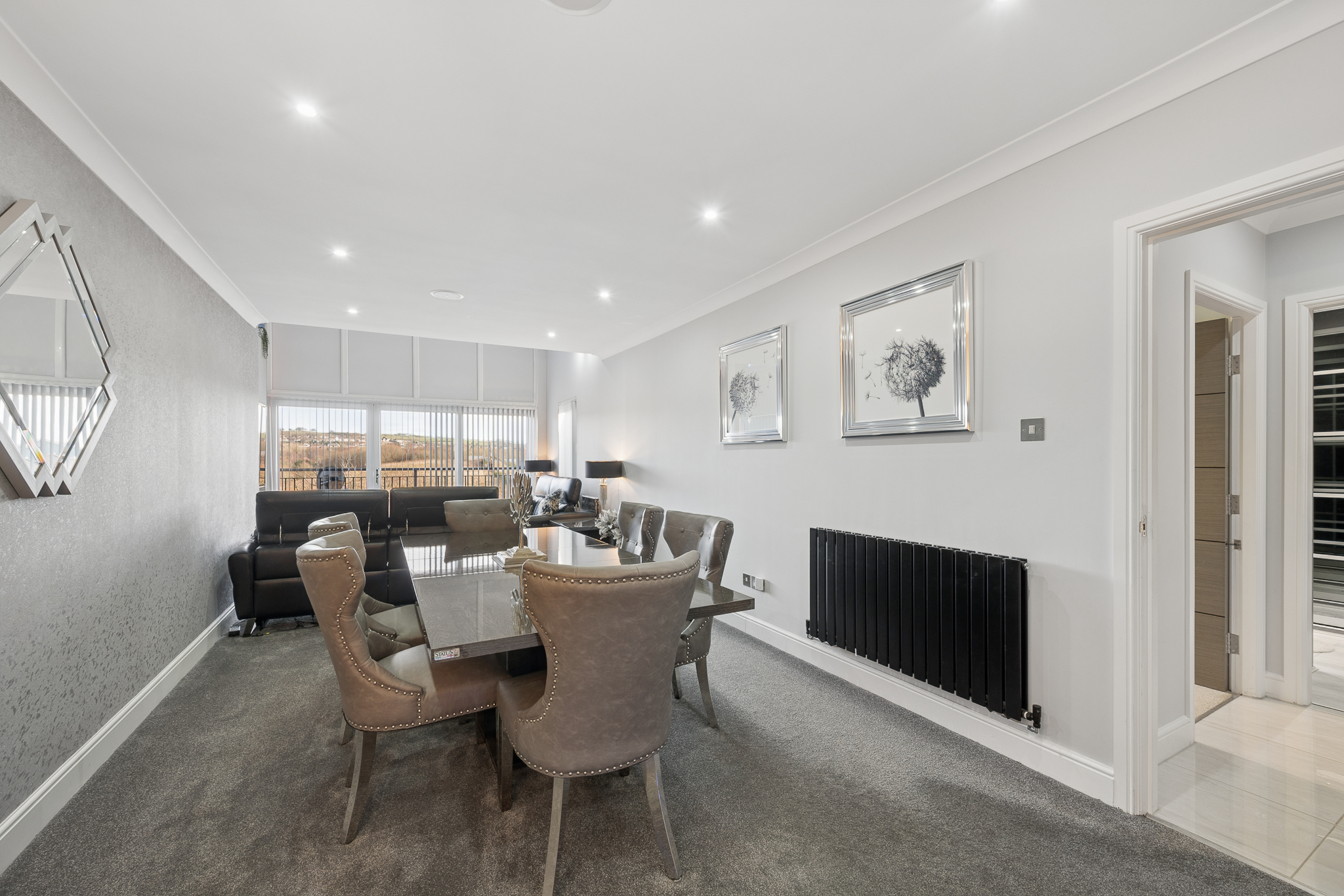 As you move further into the home, the attention to detail becomes increasingly evident, undoubtedly the showpiece of this exceptional penthouse is the magnificent open plan kitchen, dining and living area, a space designed to inspire. Here, expansive windows draw in an abundance of natural light while framing beautiful views across the surrounding fields, bringing a sense of openness and tranquillity rarely found. The kitchen itself is a statement in contemporary design, boasting sleek high gloss cabinetry, integrated high spec appliances and striking LED plinth lighting that adds both drama and ambience. Every element has been chosen with both form and function in mind, creating a space that is equally suited to everyday living and entertaining on a grander scale. Flowing effortlessly from kitchen to dining to lounge, the layout encourages social connection while maintaining a refined, cohesive aesthetic. This is a setting made for hosting dinner parties, relaxed evenings and everything in between.