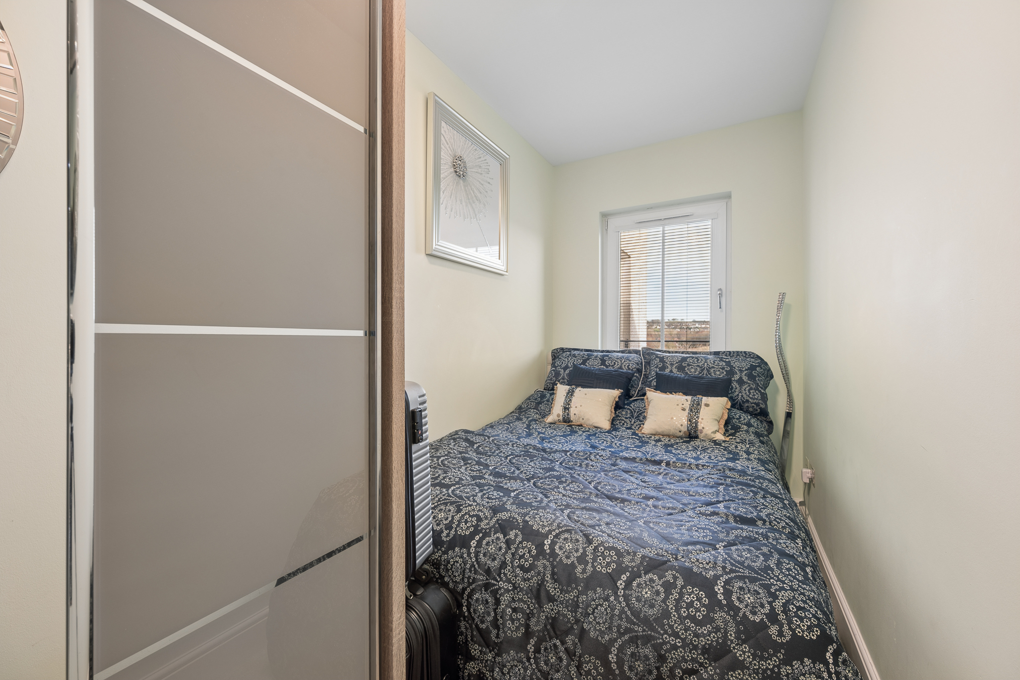 The second bedroom is equally impressive and wonderfully versatile. Complete with mirrored fitted Sharps wardrobes, this beautifully styled room comfortably hosts a double bed yet remains adaptable for a range of lifestyle needs. Whether utilised as an elegant guest bedroom, a stylish home office or a calming dressing room.