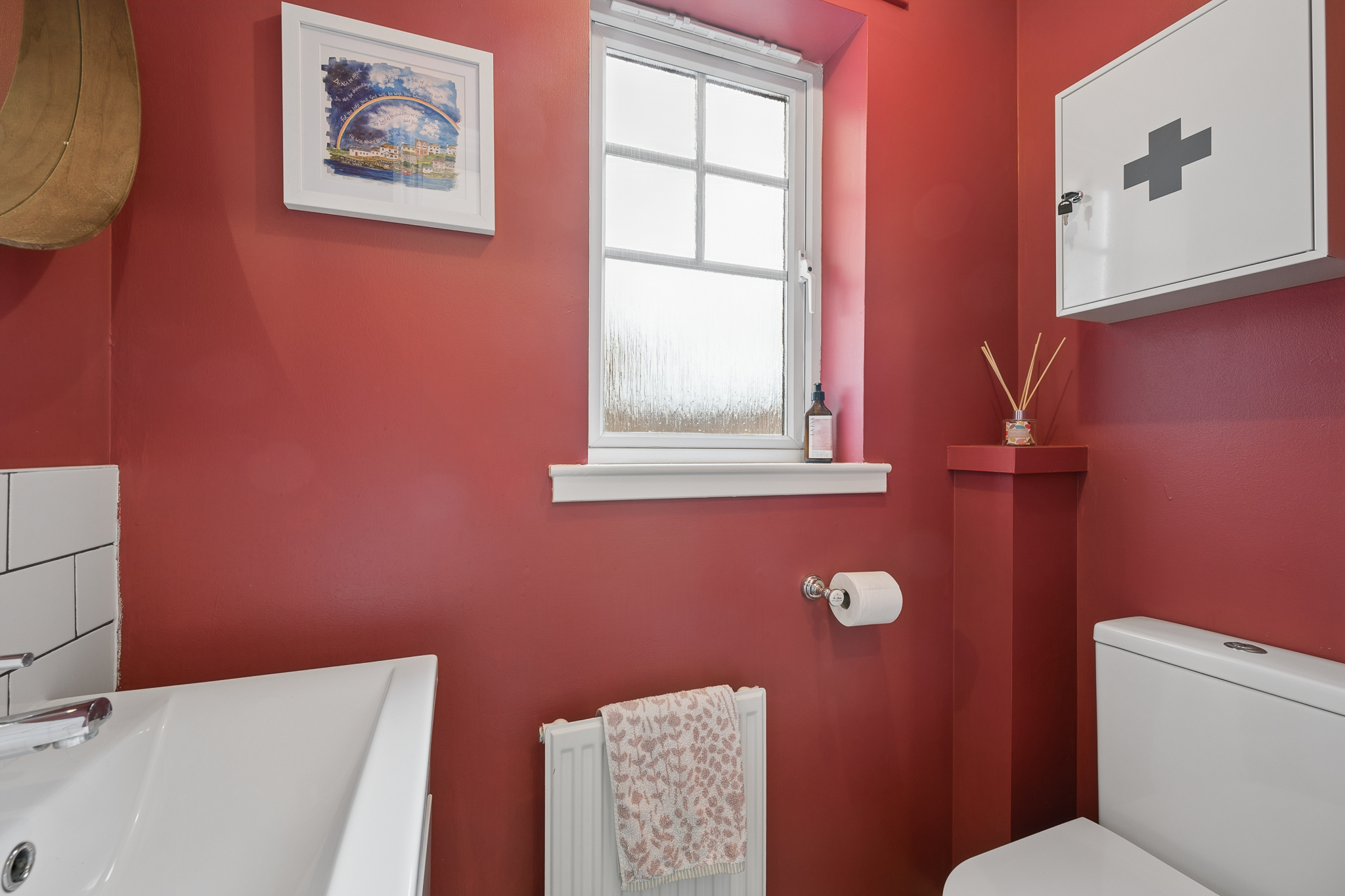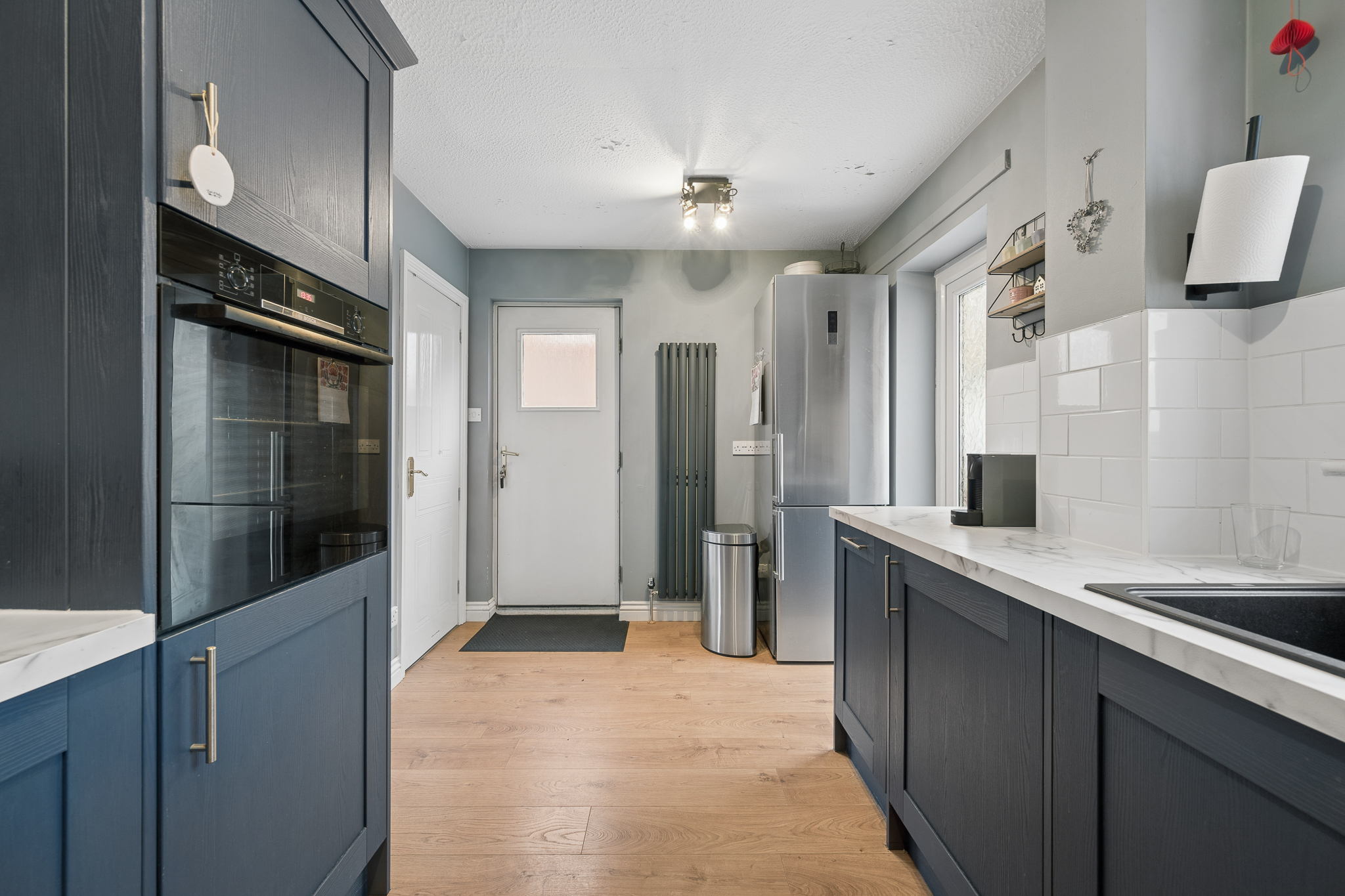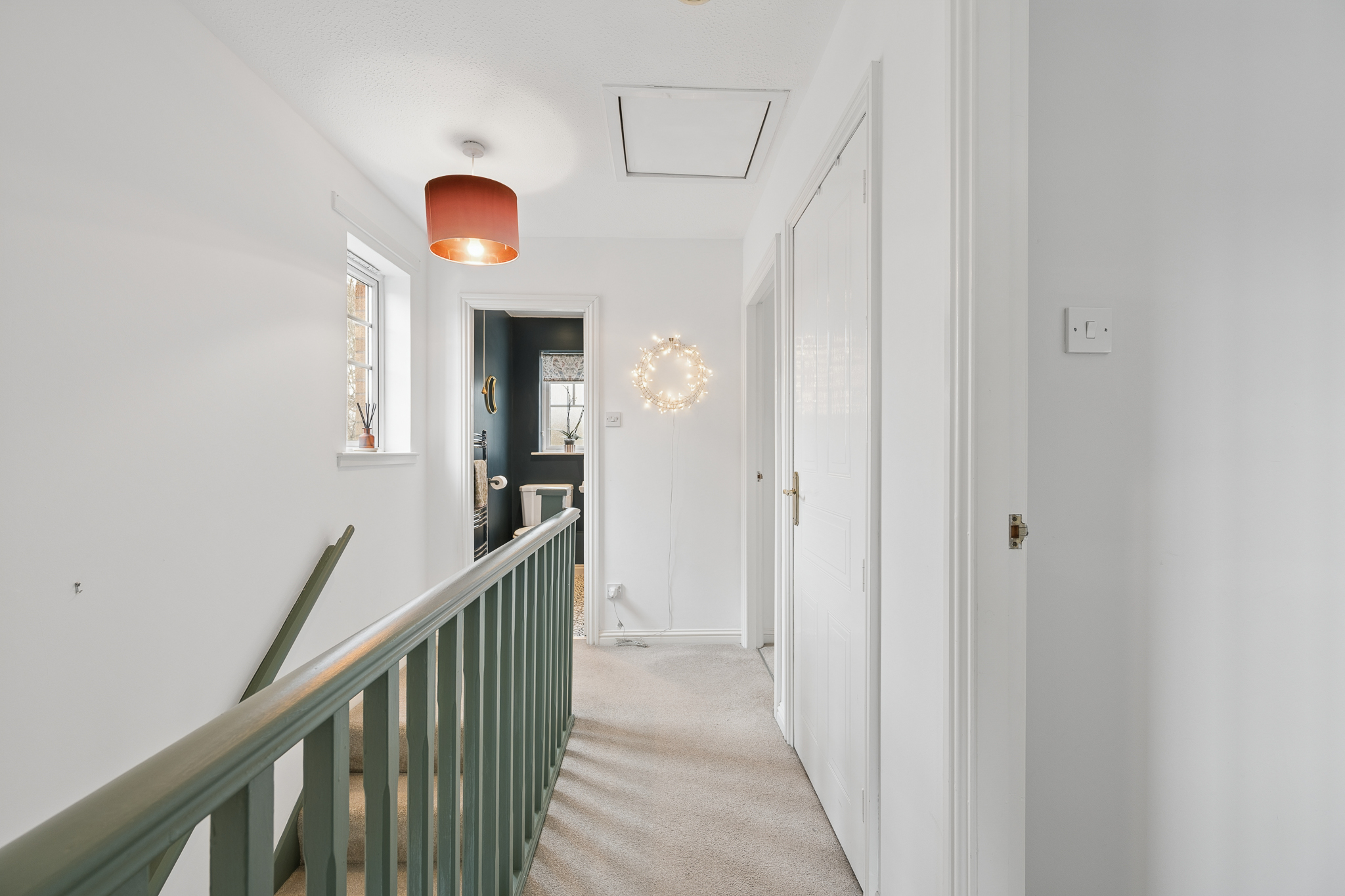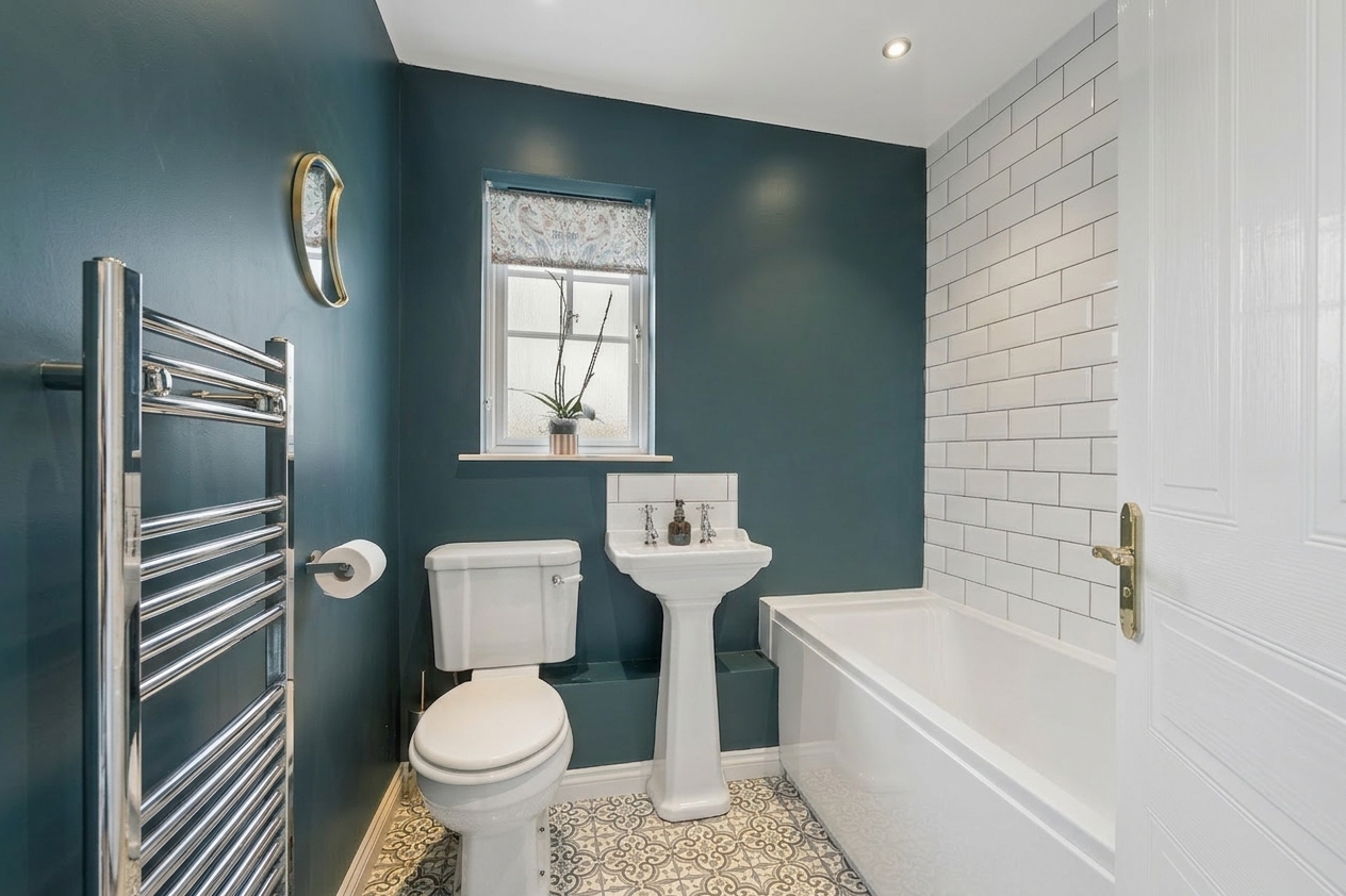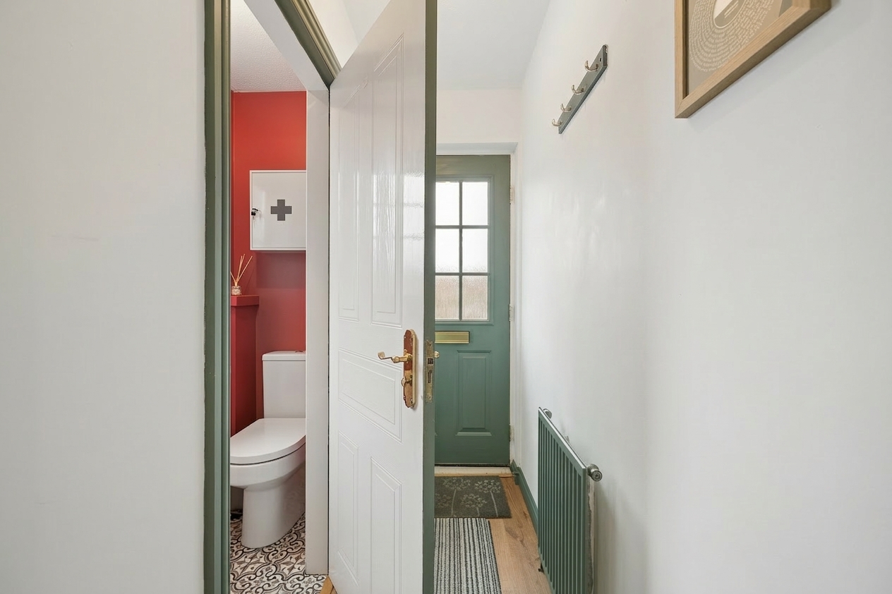 Upon entering, you are welcomed into a bright and spacious hallway. To the right hand side sits the downstairs WC, conveniently positioned near the entrance and finished with splashback tiling and modern fittings.