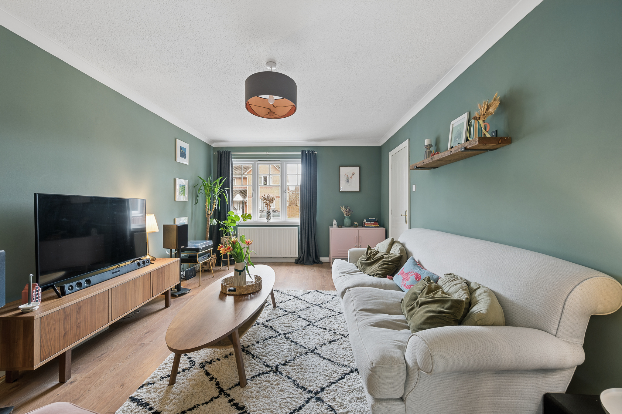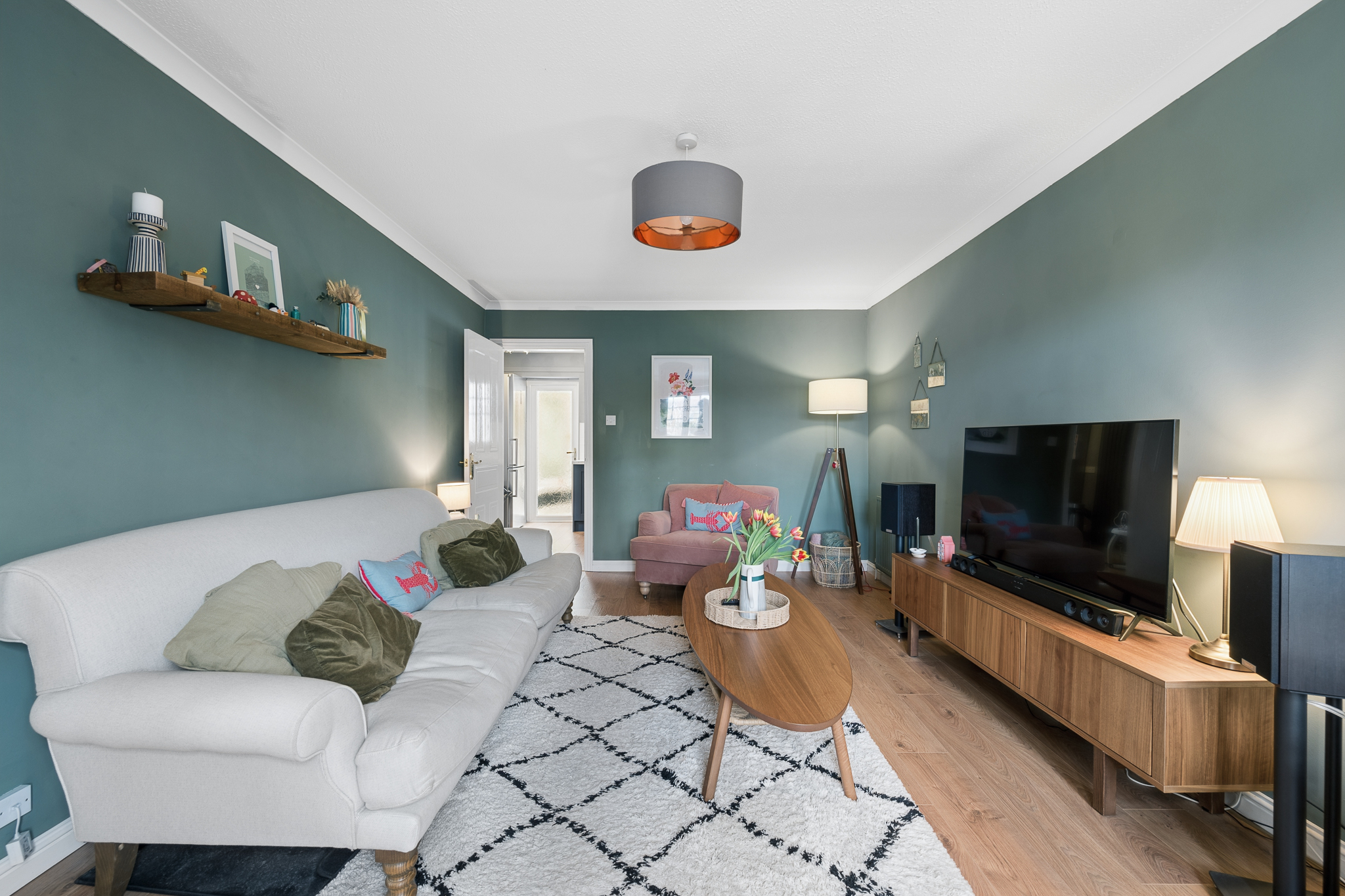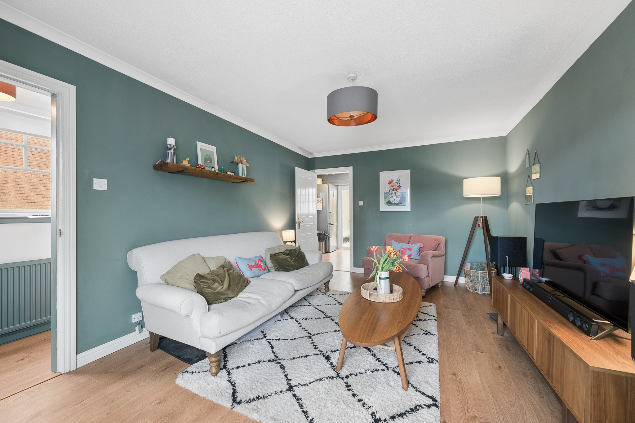 Continuing along the hallway, you are introduced to the lounge at the front of the property. This is a generous and inviting space featuring a large front facing window that allows natural light to flood the room. The lounge comfortably accommodates two large sofas, making it a perfect place to relax or host guests.
