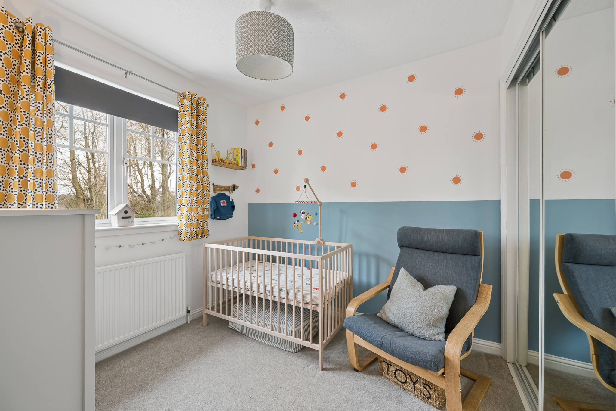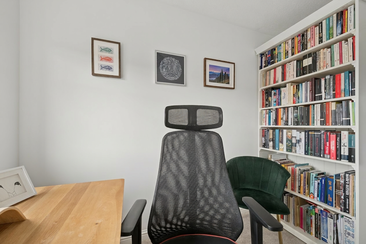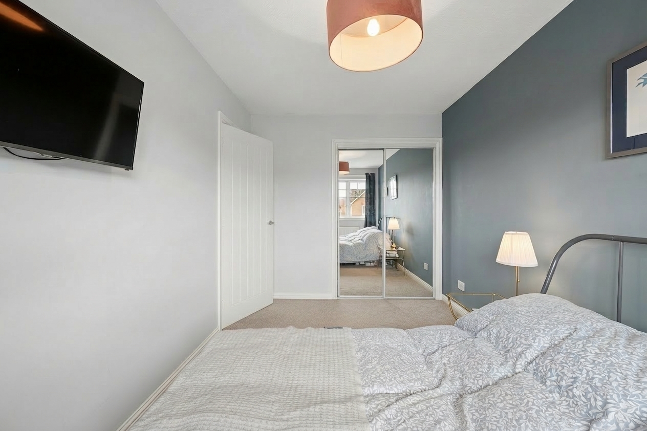 Upstairs, the landing leads to three bedrooms. The principal bedroom is located to the front right of the property and comfortably accommodates a king size bed with bedside cabinets, while also benefiting from a large fitted wardrobe. Bedroom two is positioned at the rear and offers space for a small double bed along with fitted wardrobe storage. Bedroom three, located to the front of the home, is currently used as a home office and serves as a versatile space that could easily function as a nursery or single bedroom.