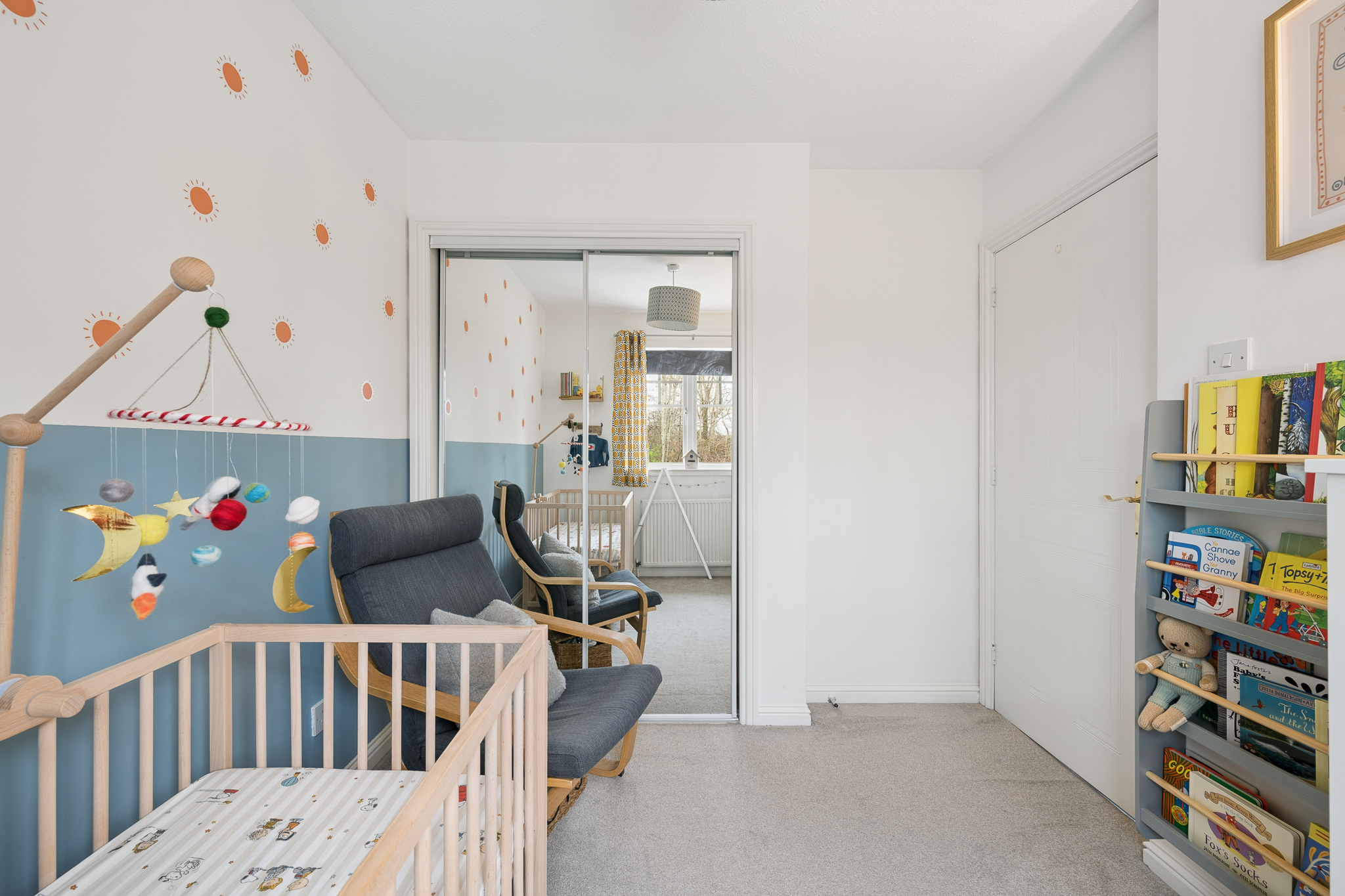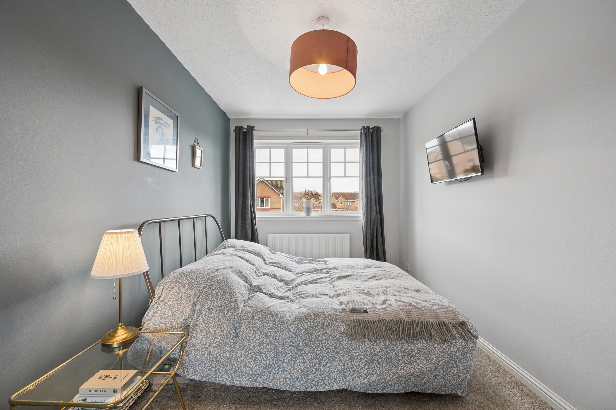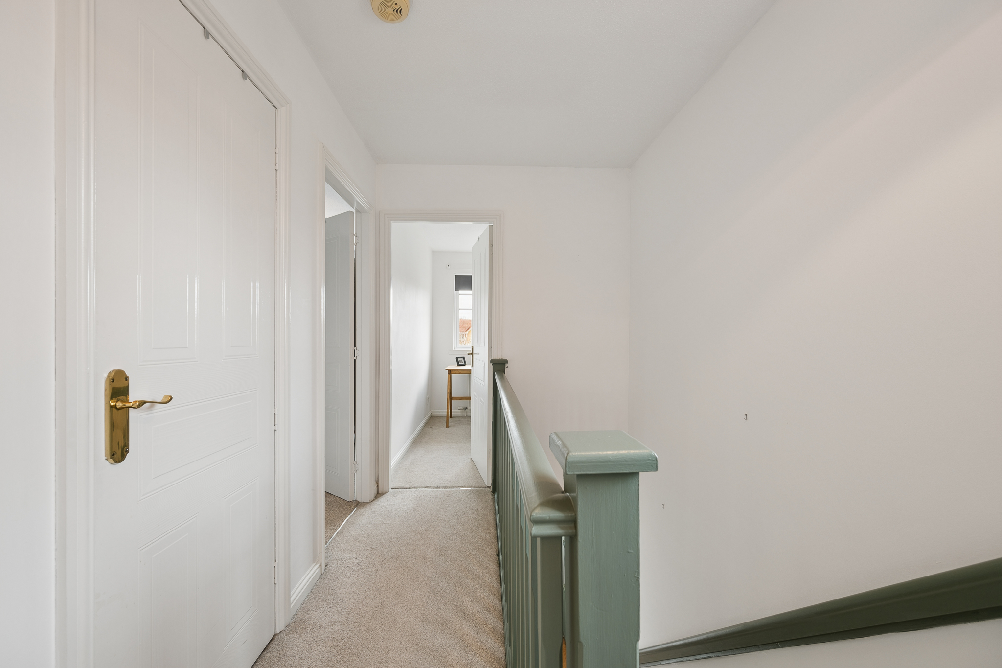Upstairs, the landing leads to three bedrooms. The principal bedroom is located to the front right of the property and comfortably accommodates a king size bed with bedside cabinets, while also benefiting from a large fitted wardrobe. Bedroom two is positioned at the rear and offers space for a small double bed along with fitted wardrobe storage. Bedroom three, located to the front of the home, is currently used as a home office and serves as a versatile space that could easily function as a nursery or single bedroom.