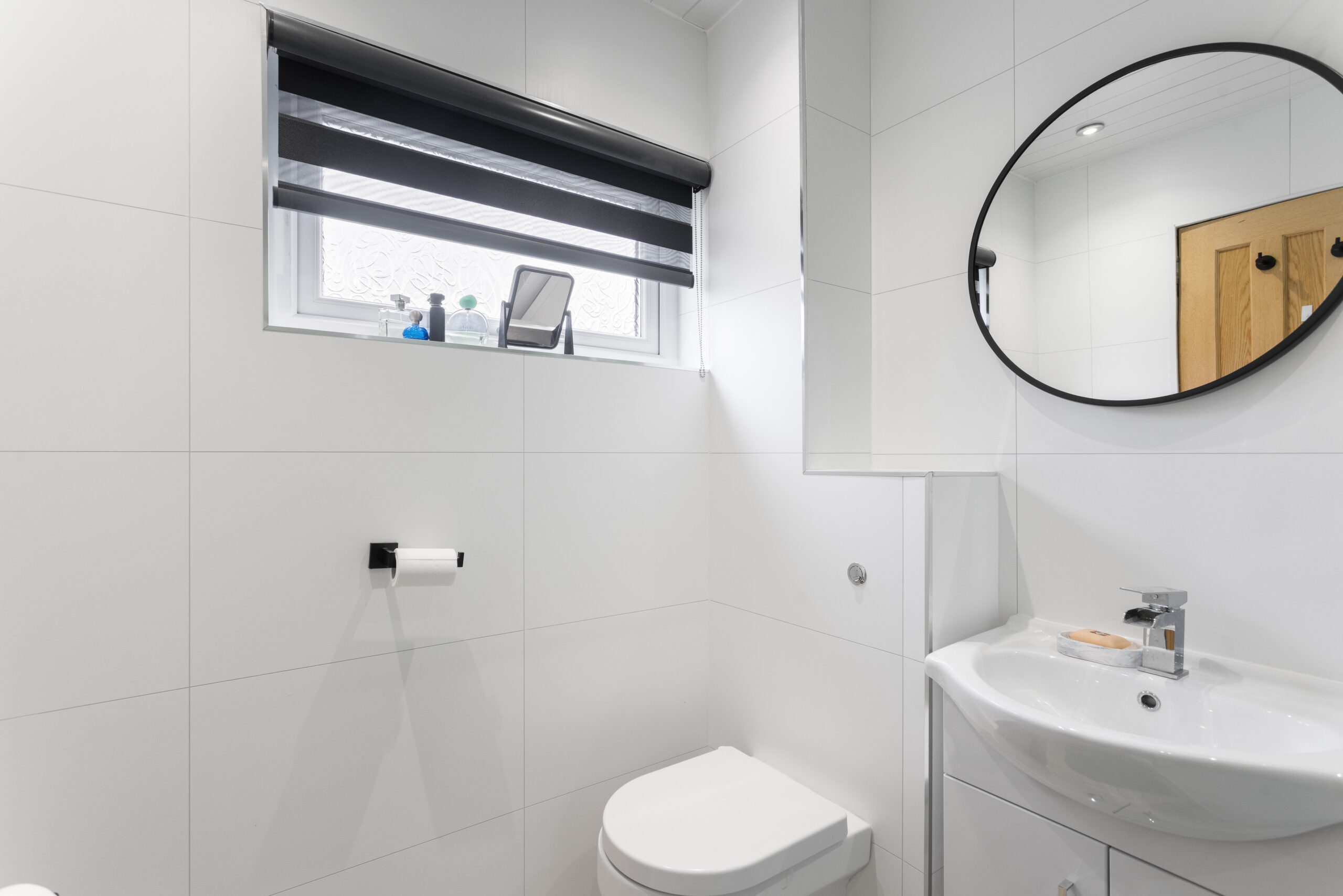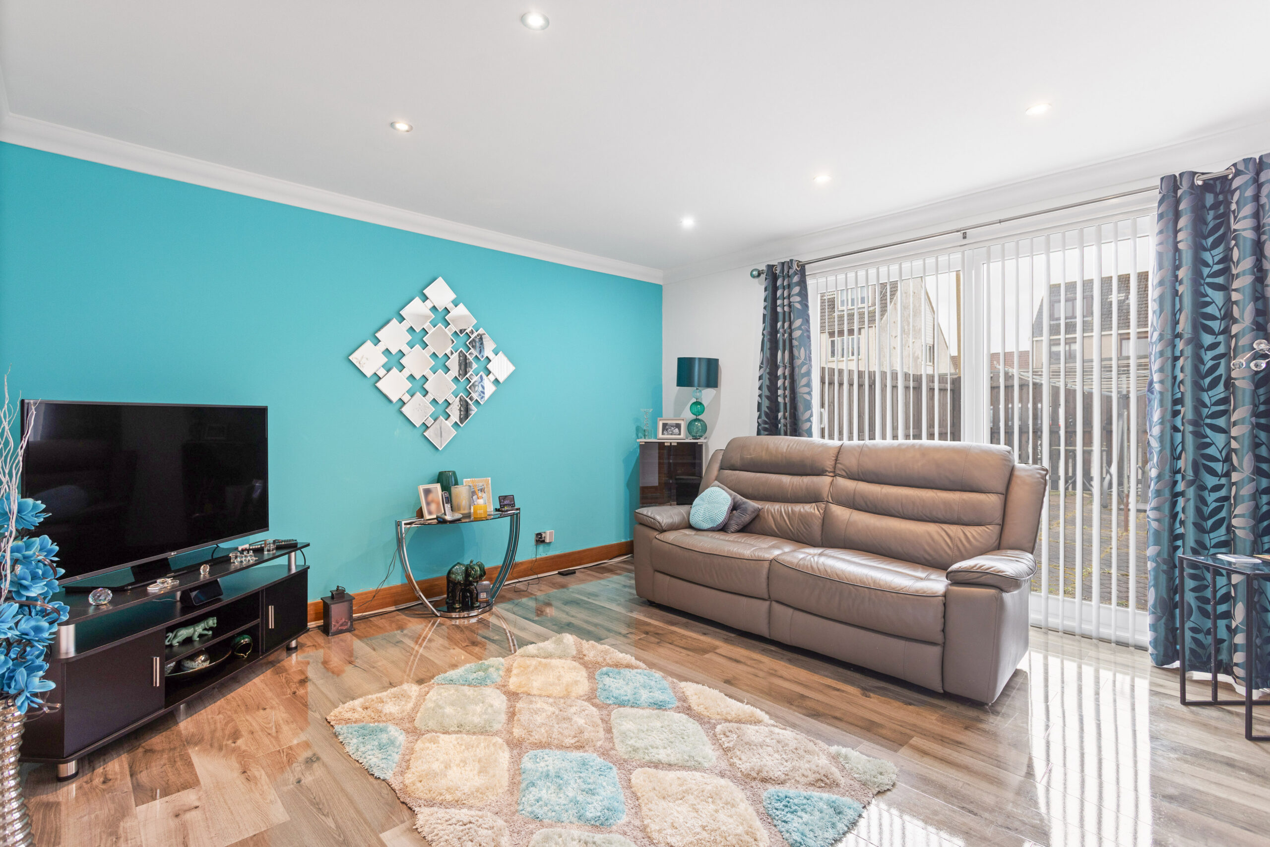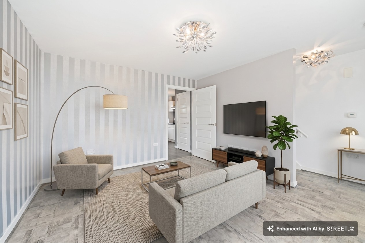 To the front of the property, the generous lounge provides a fantastic space for relaxation, featuring stylish laminate flooring, neutral décor and large windows fitted with blinds, allowing for excellent natural light while offering both privacy and a high end finish. The room is tastefully finished with modern touches, creating a warm yet contemporary living environment.