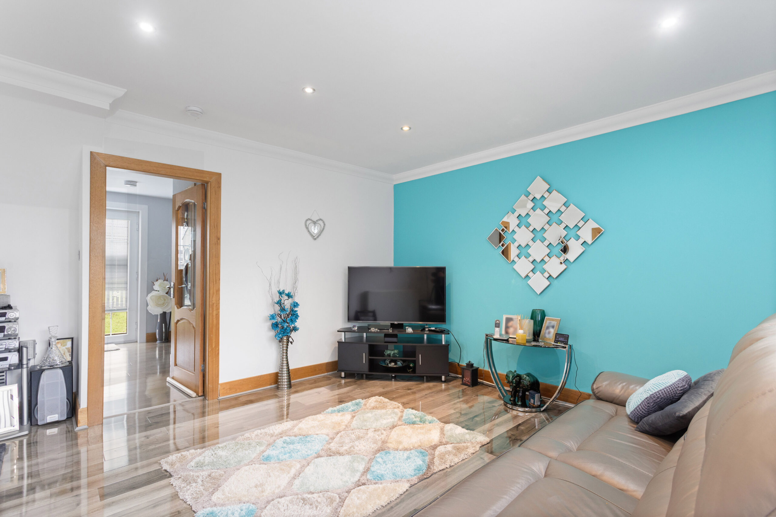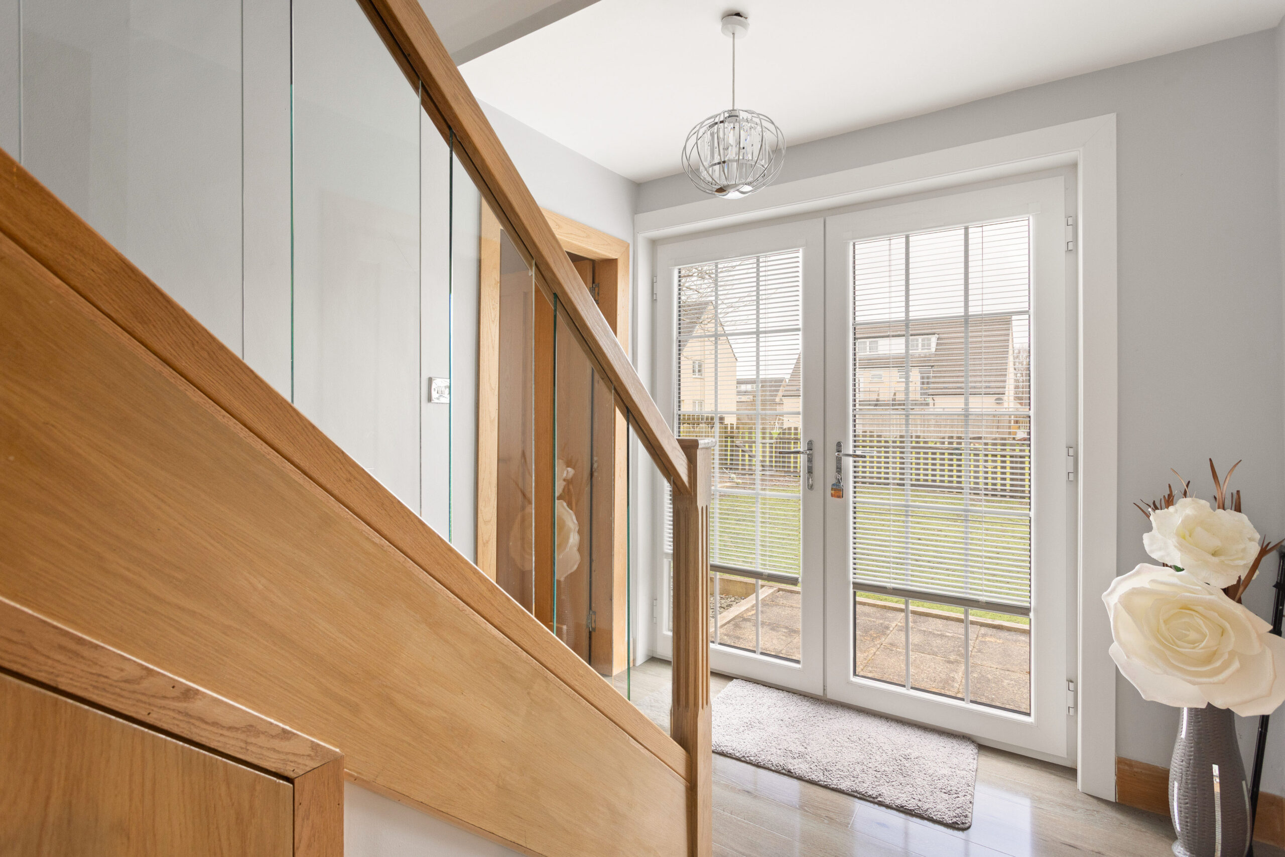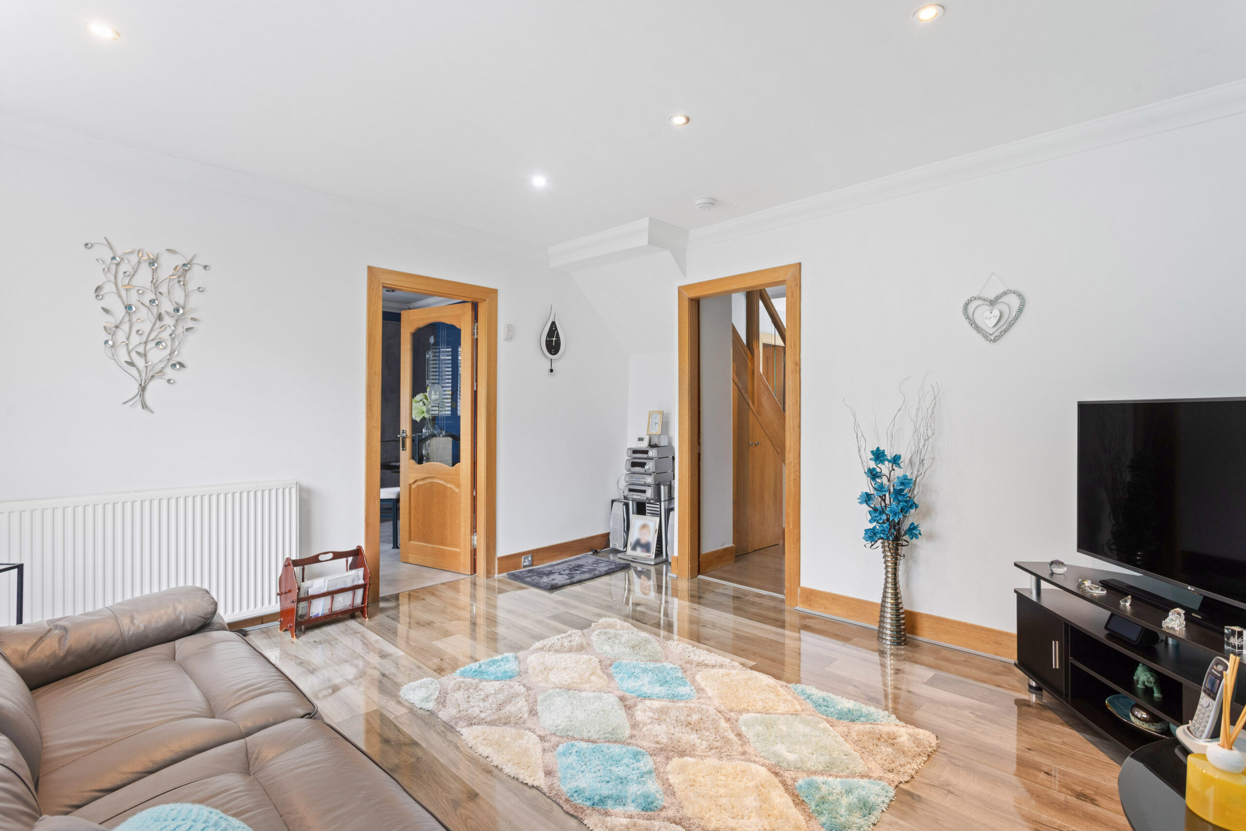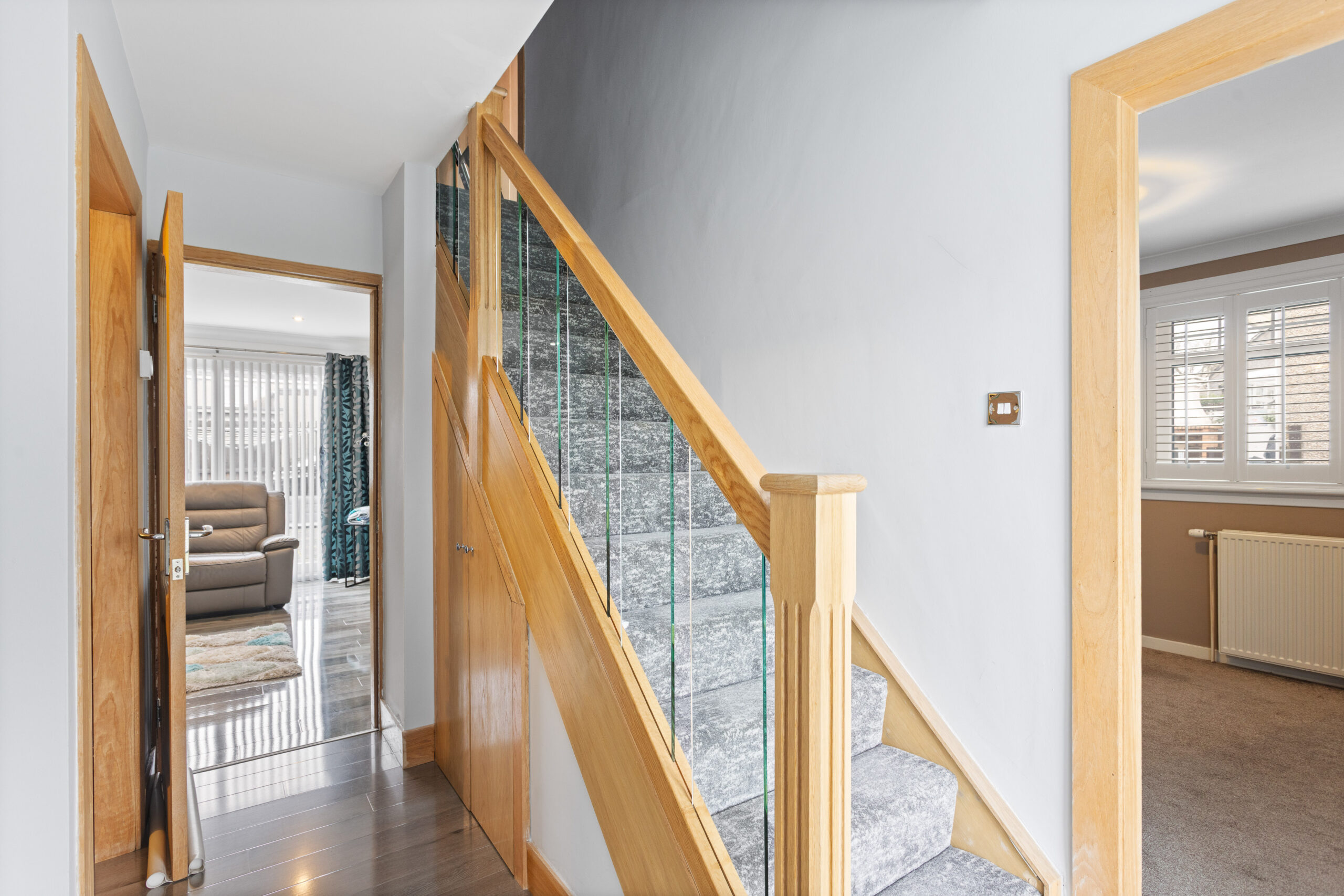 On entering the property, you are welcomed into a bright and inviting hallway, immediately setting the tone for the quality and style carried throughout the home. The hallway benefits from sleek, high gloss flooring and a contemporary staircase with glass balustrade and oak detailing, creating a striking first impression.