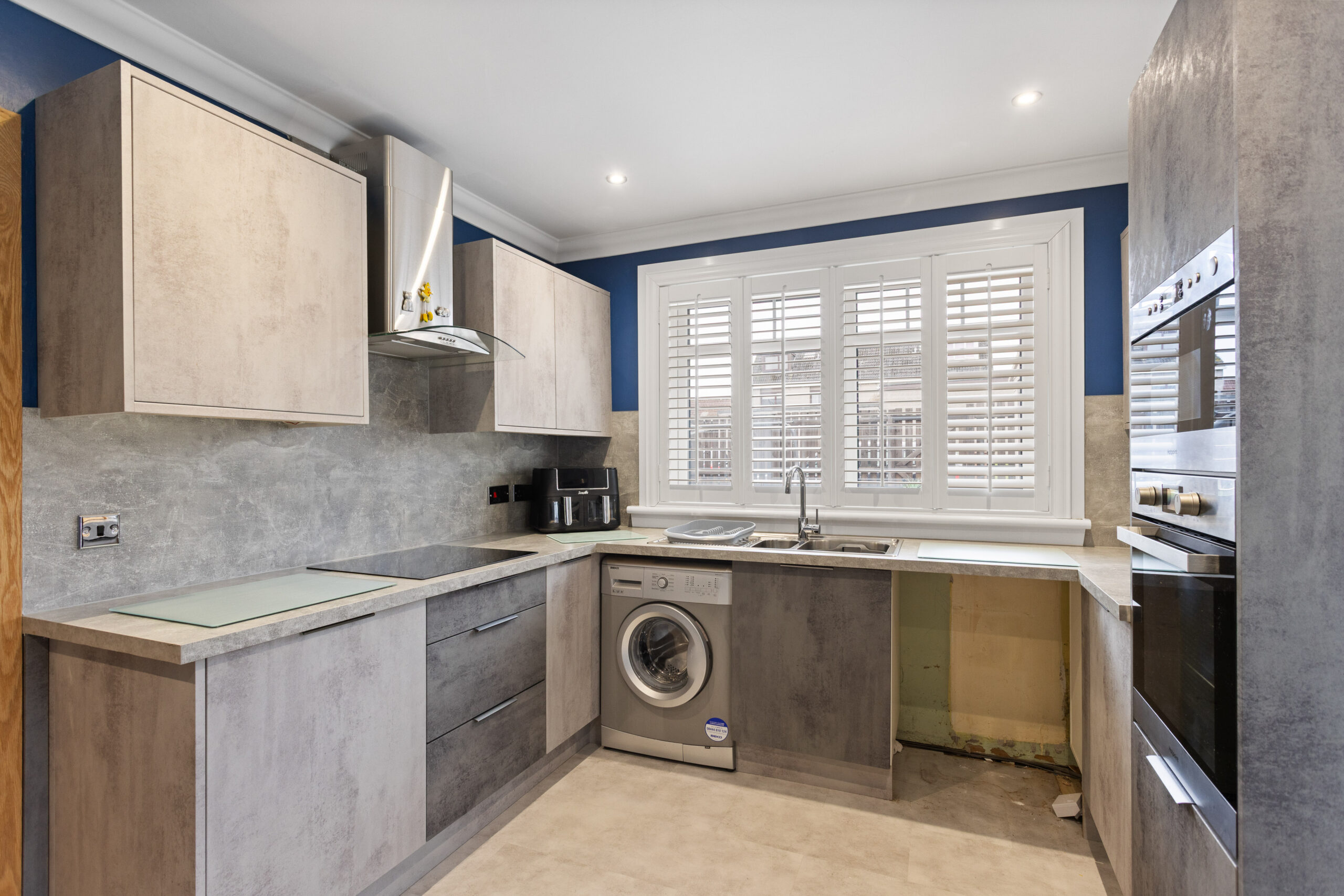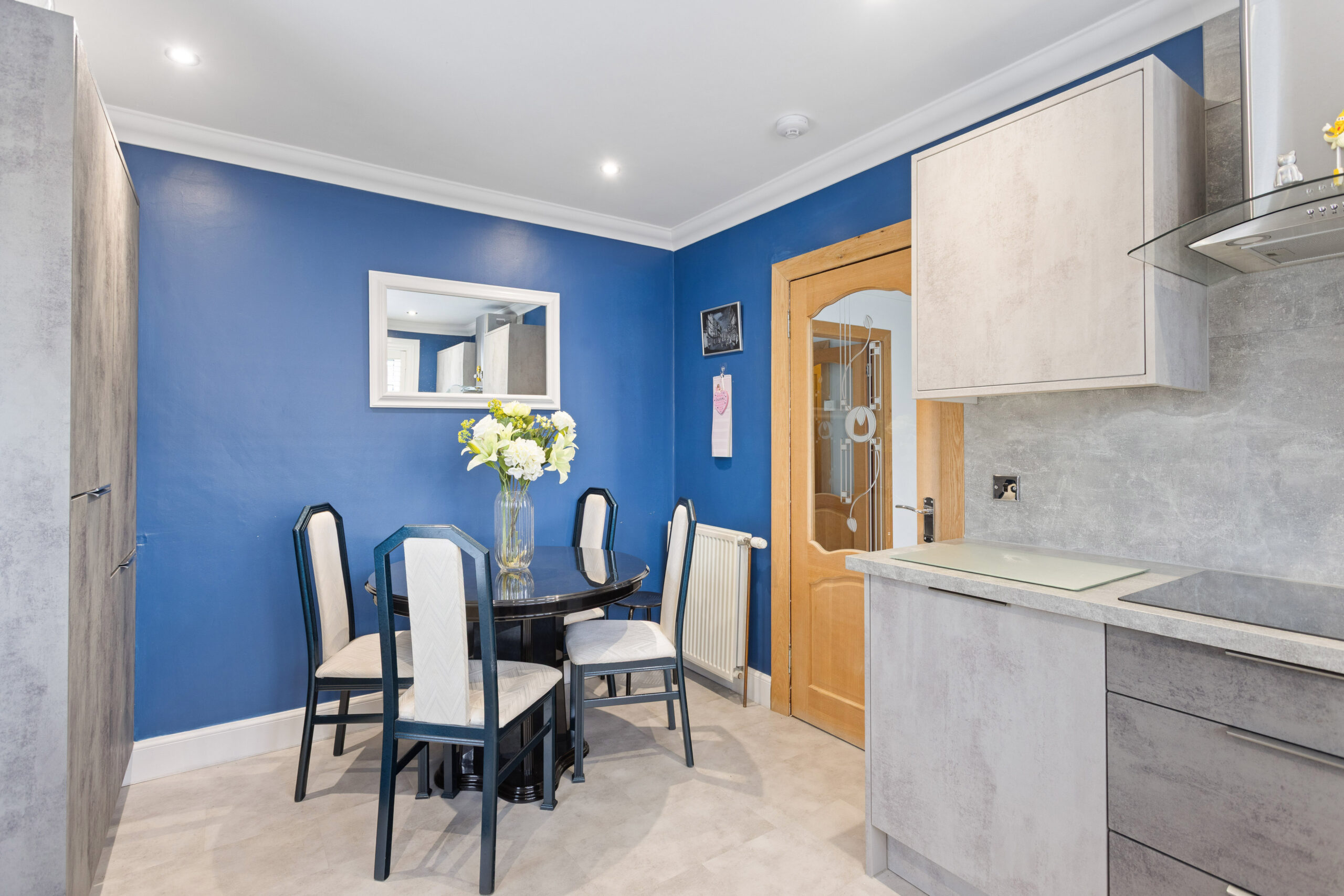 The heart of the home is the impressive kitchen, thoughtfully designed with a range of modern wall and base units in a soft grey tone, complemented by contrasting worktops and splashbacks. Integrated appliances, including oven and hob, enhance both functionality and style, while the layout provides ample preparation space. The kitchen comfortably accommodates a dining area, enhanced by bold feature wall décor, creating a vibrant and sociable space ideal for both everyday living and entertaining. A window further enhances the space, while direct access to the rear garden creates a seamless indoor outdoor flow.