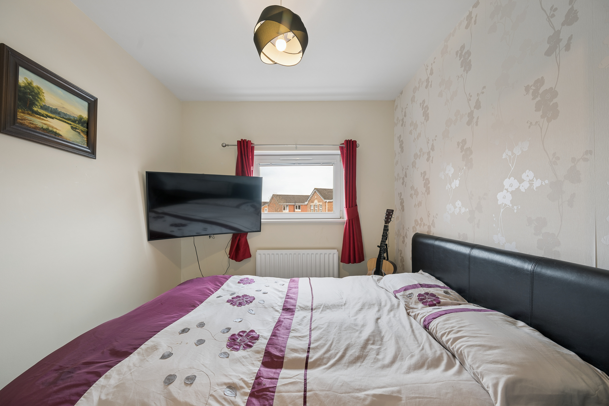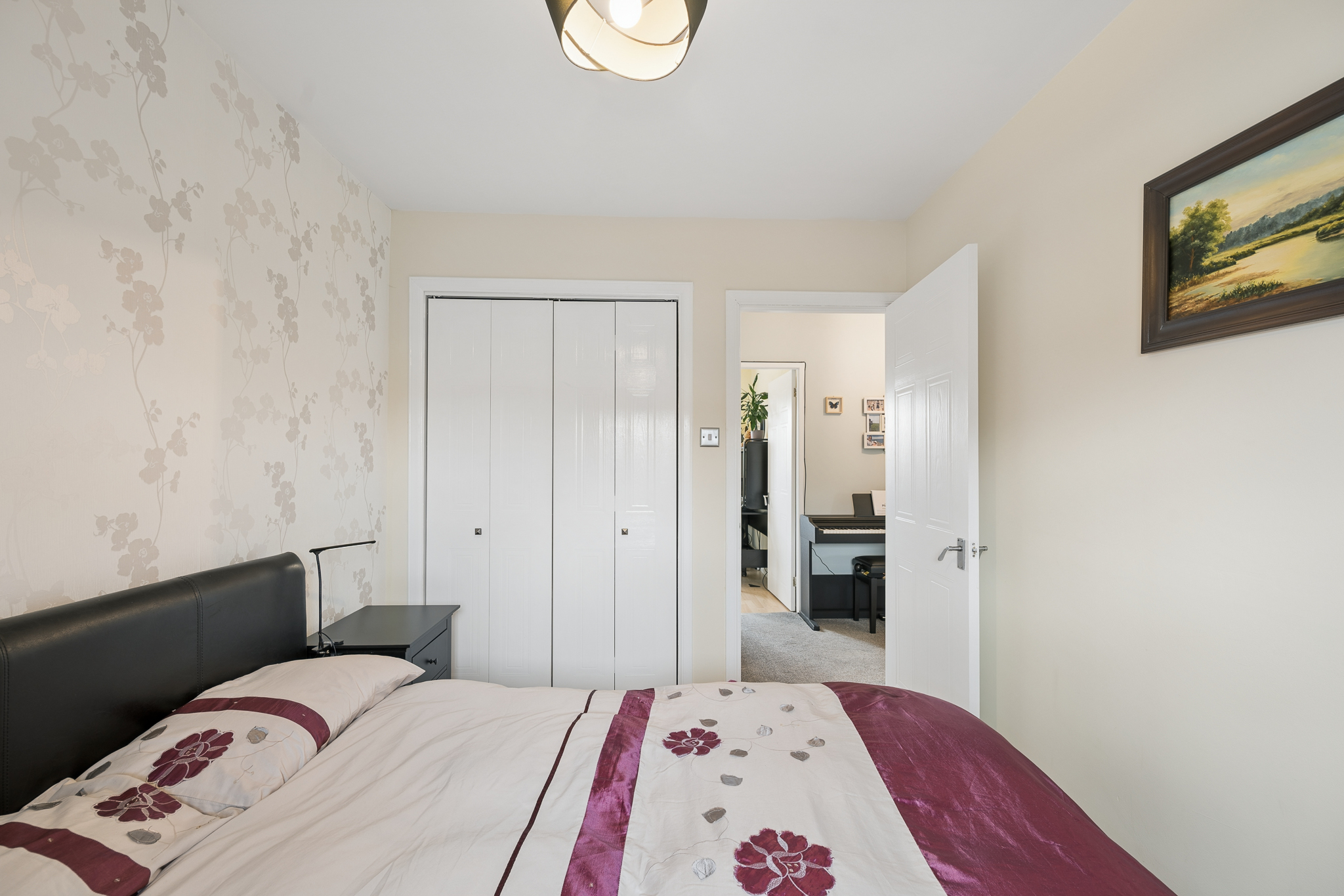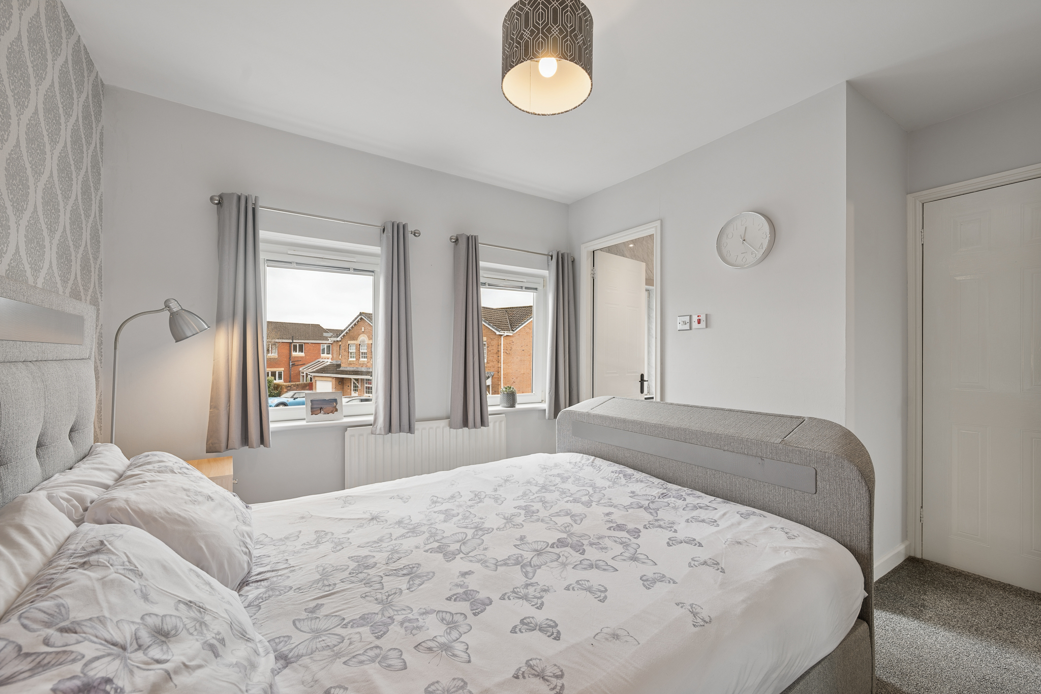 At the front left of the property, bedroom three is a fantastic double bedroom, currently arranged as a guest room. With ample floor space, room for additional furniture and a bright outlook, it offers comfort and versatility for visitors or family members alike.