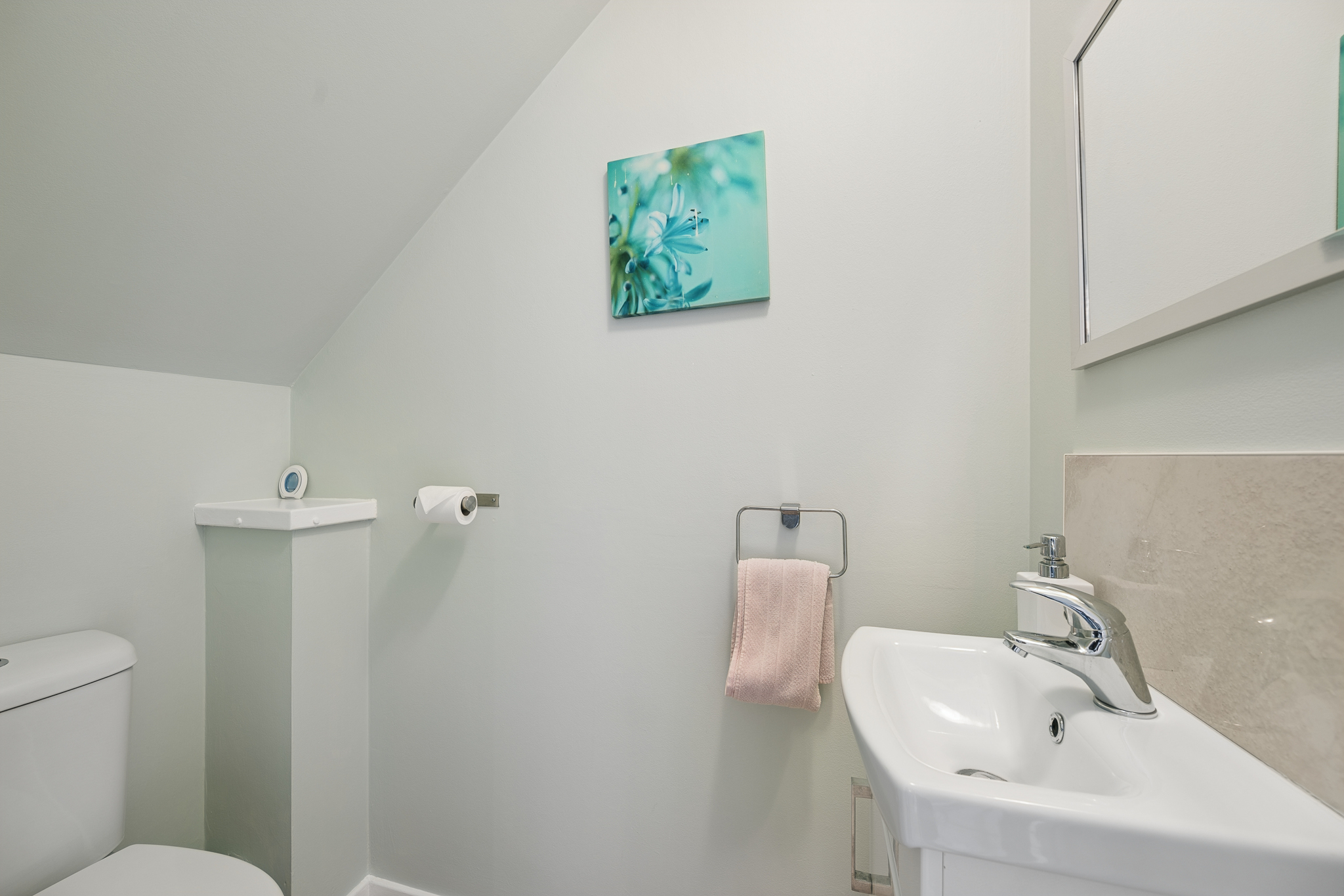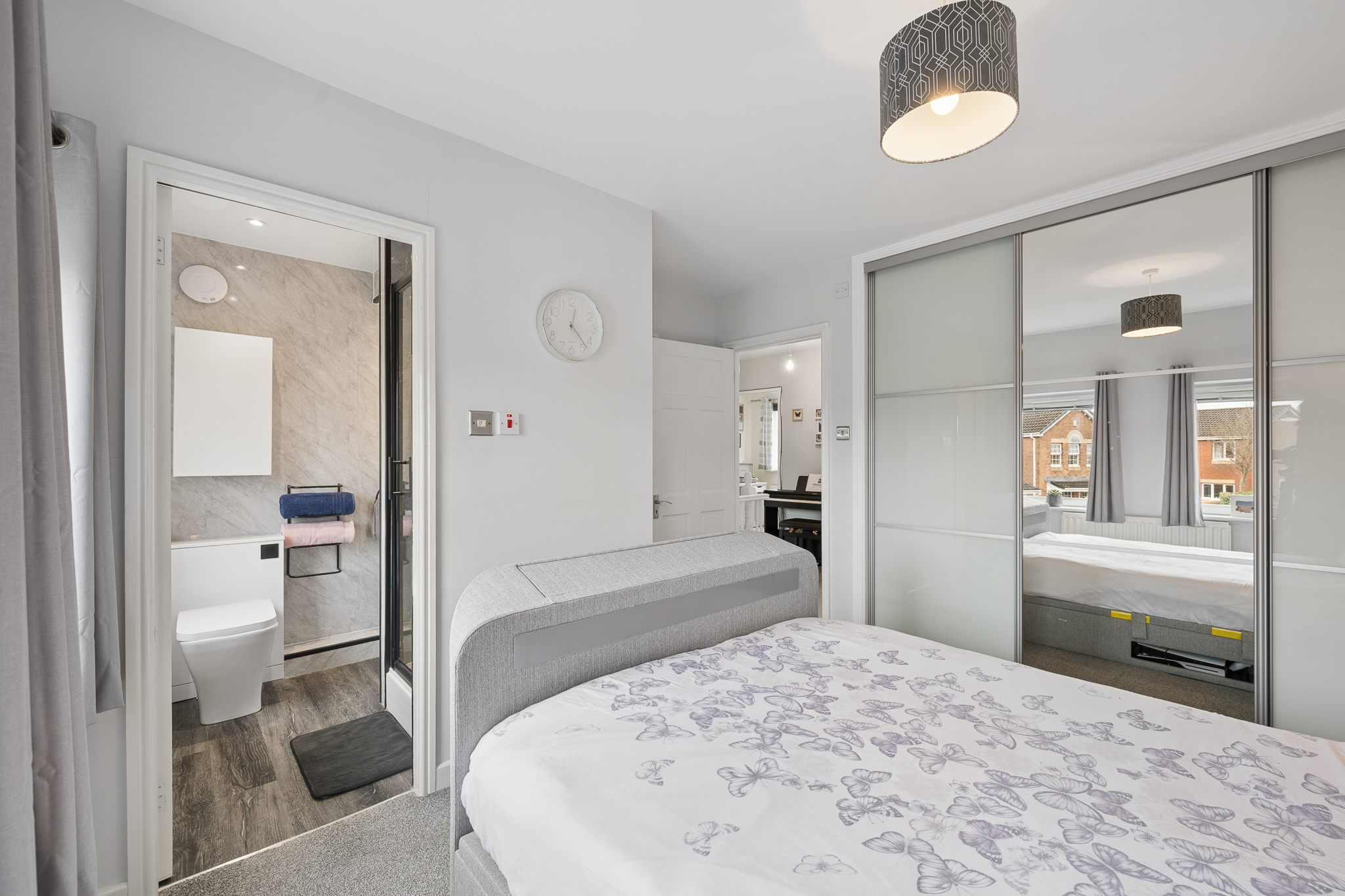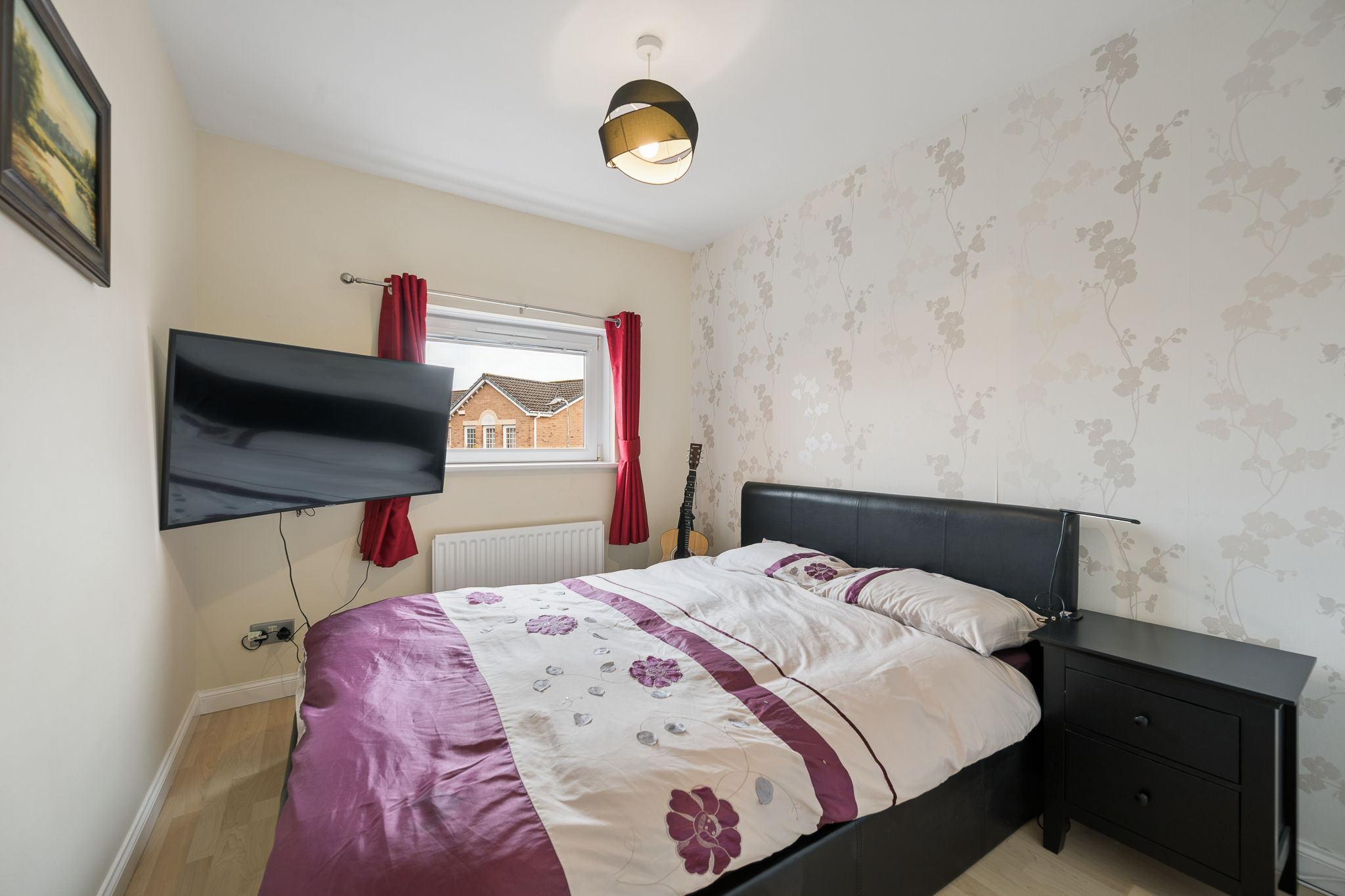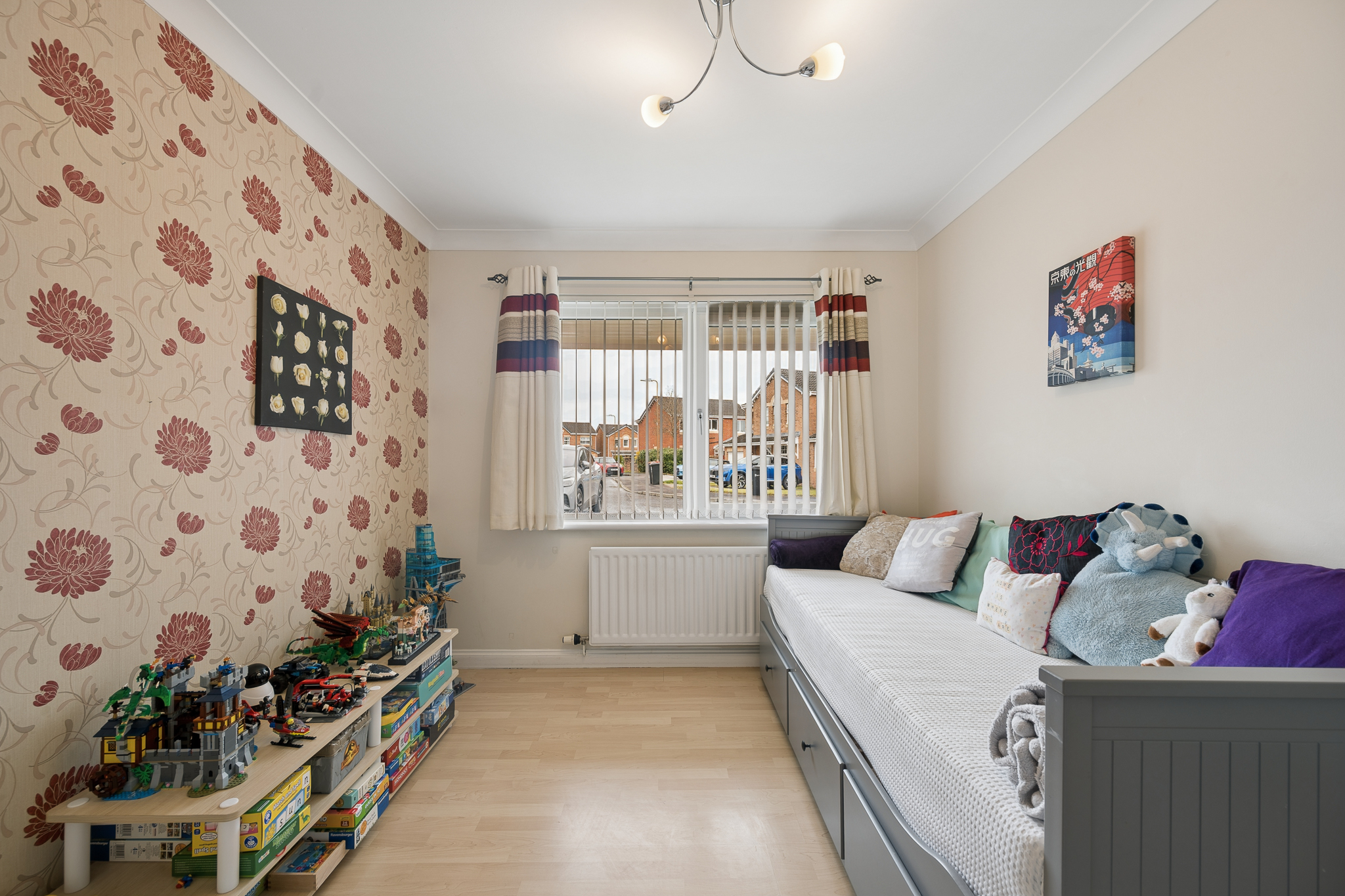 At the front left of the property, bedroom three is a fantastic double bedroom, currently arranged as a guest room. With ample floor space, room for additional furniture and a bright outlook, it offers comfort and versatility for visitors or family members alike.