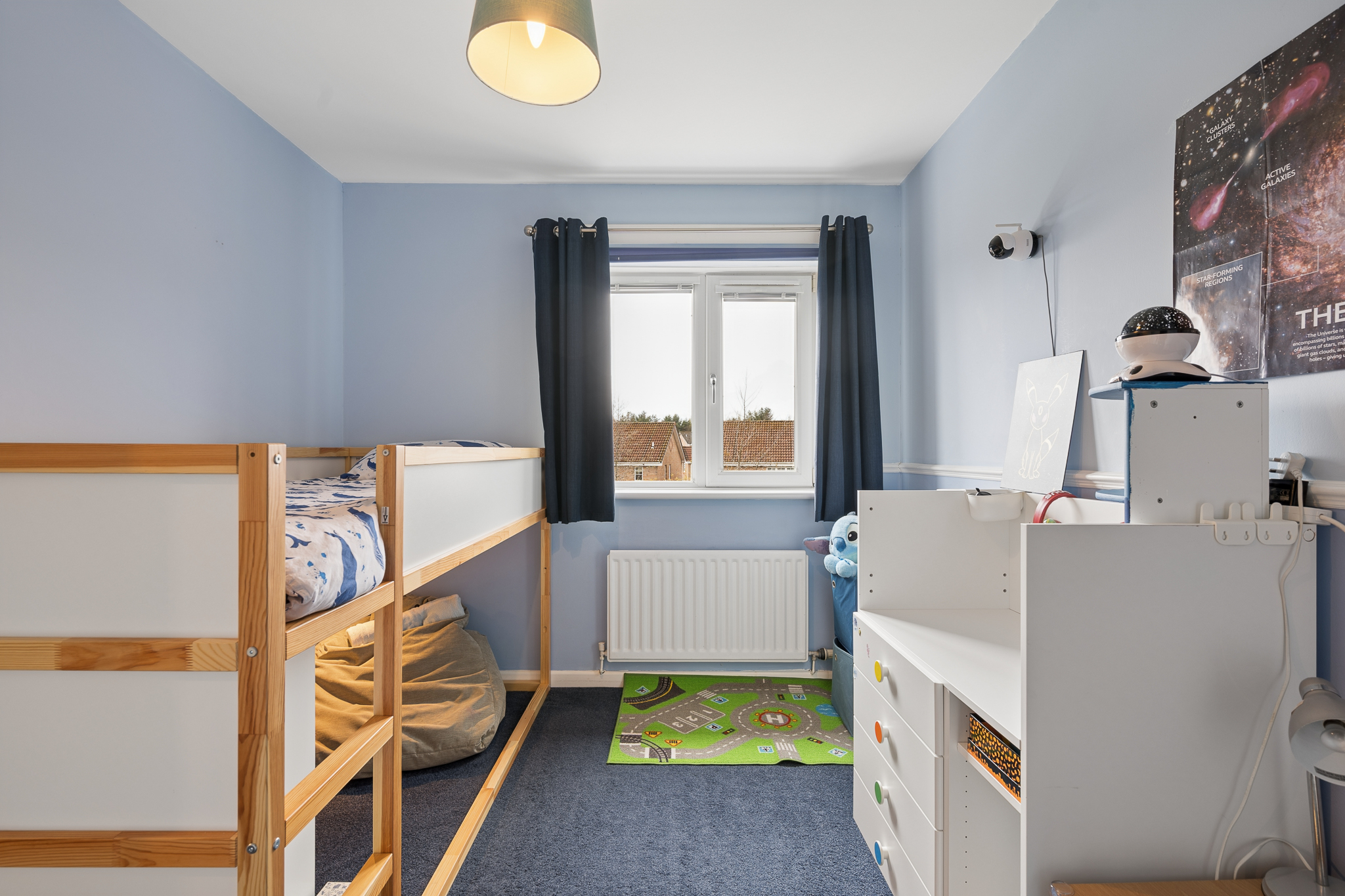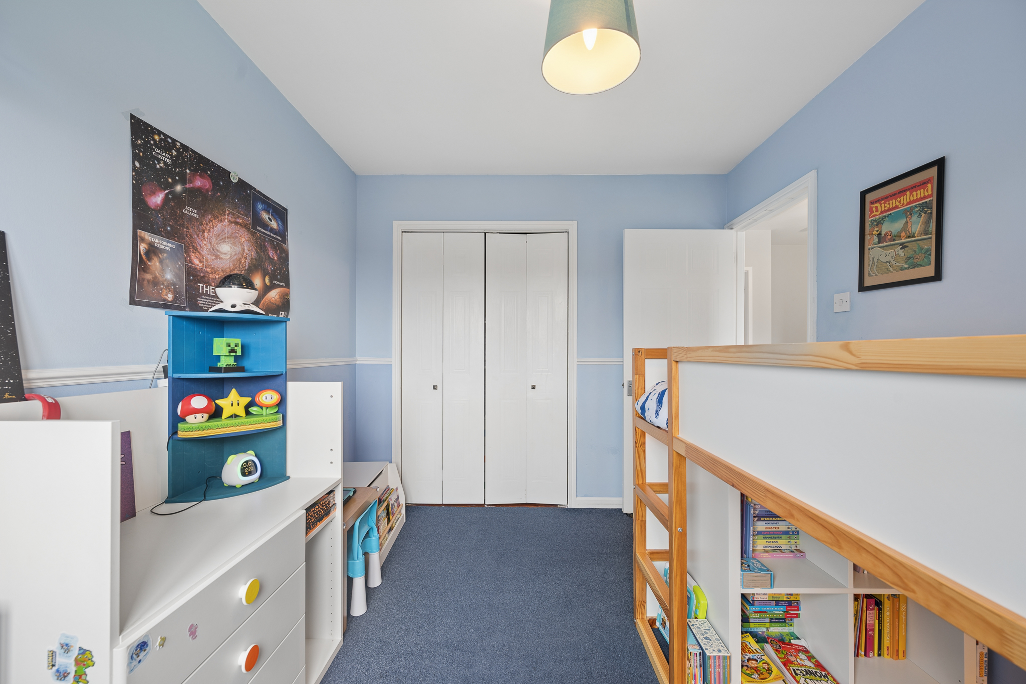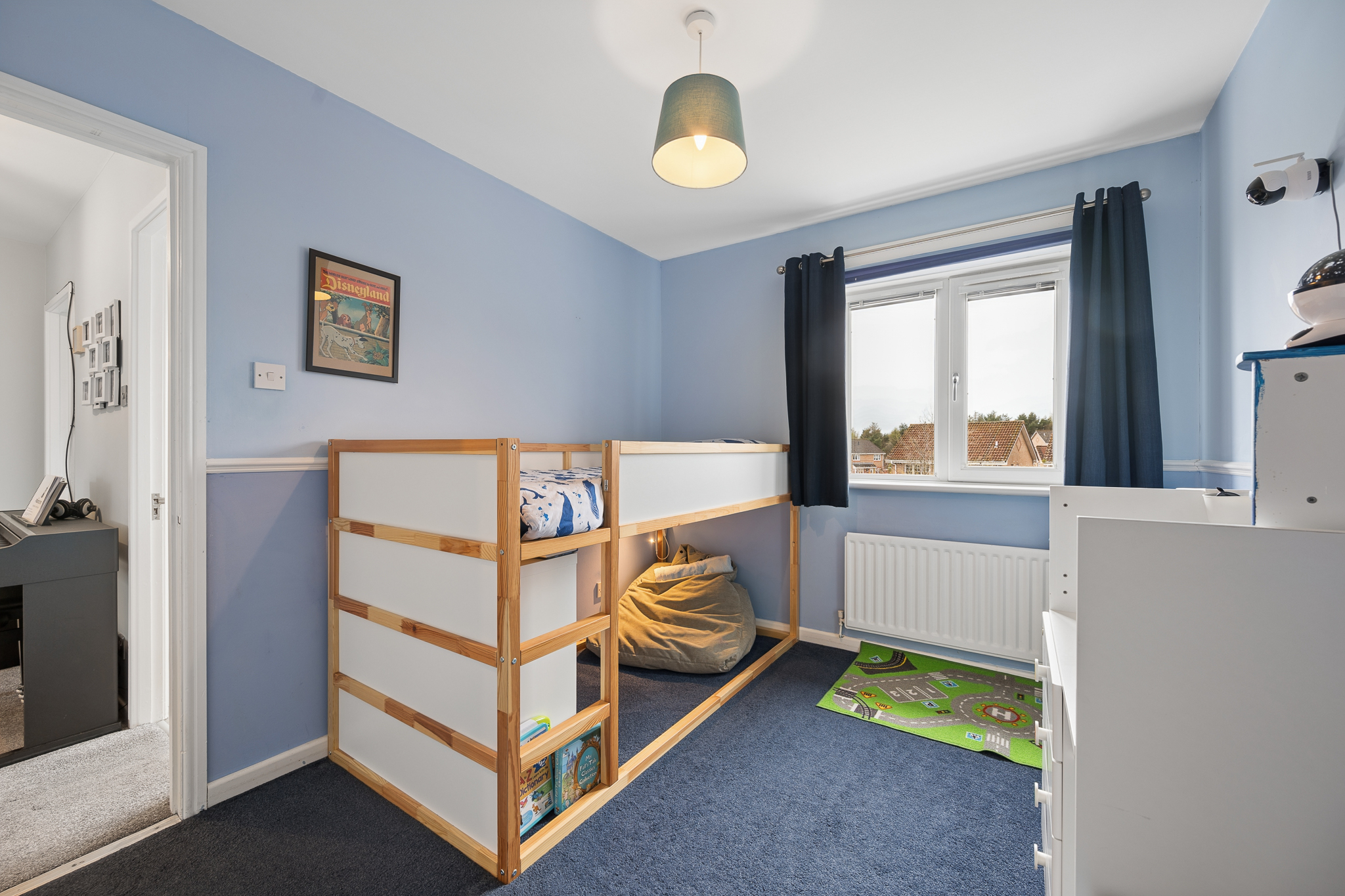 To the rear right, bedroom two is currently set up as a charming children’s room, decorated in soft blue tones. This generous space comfortably accommodates a double bed, includes built in storage, and enjoys pleasant views over the rear garden, making it both practical and peaceful.