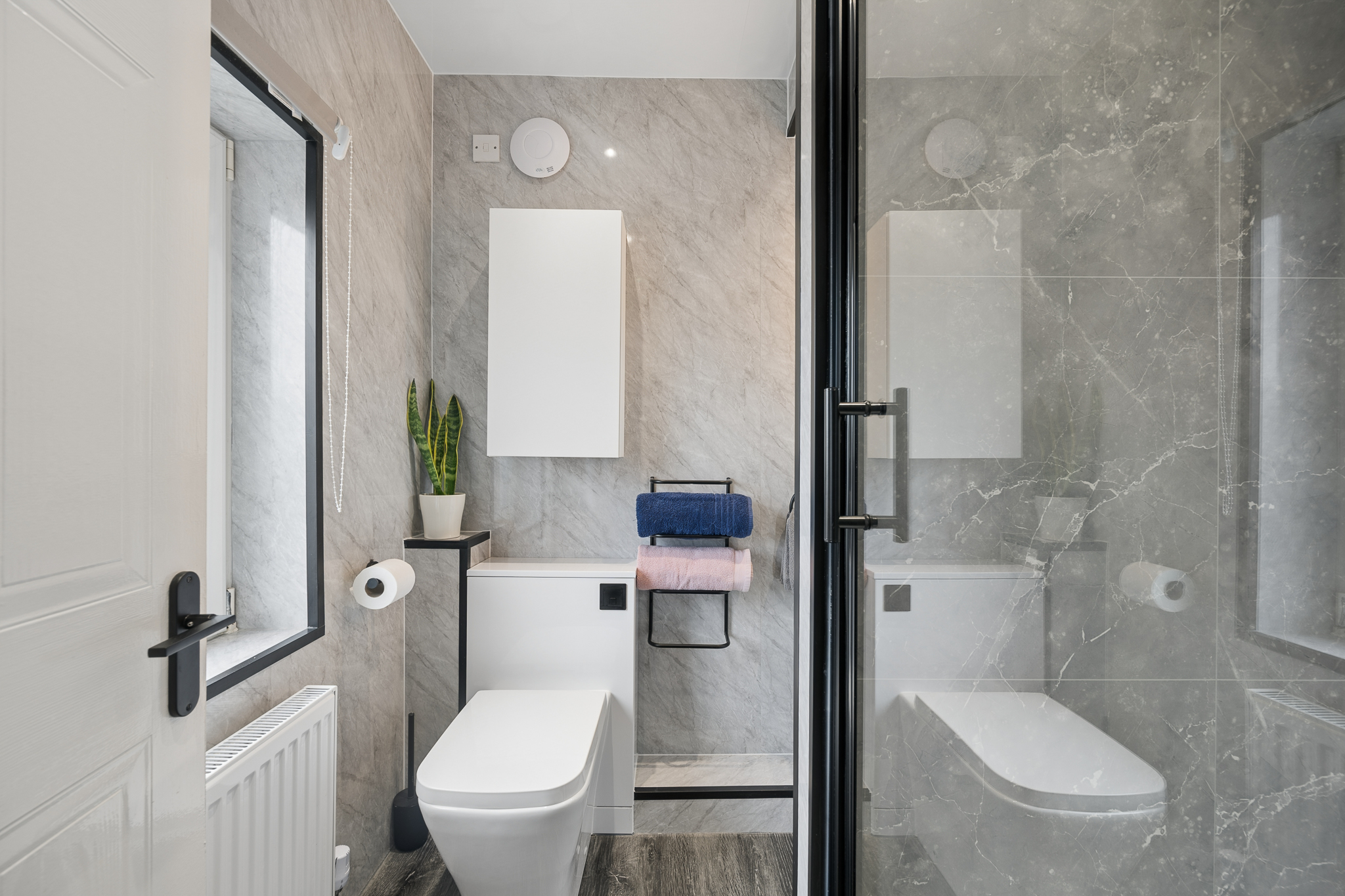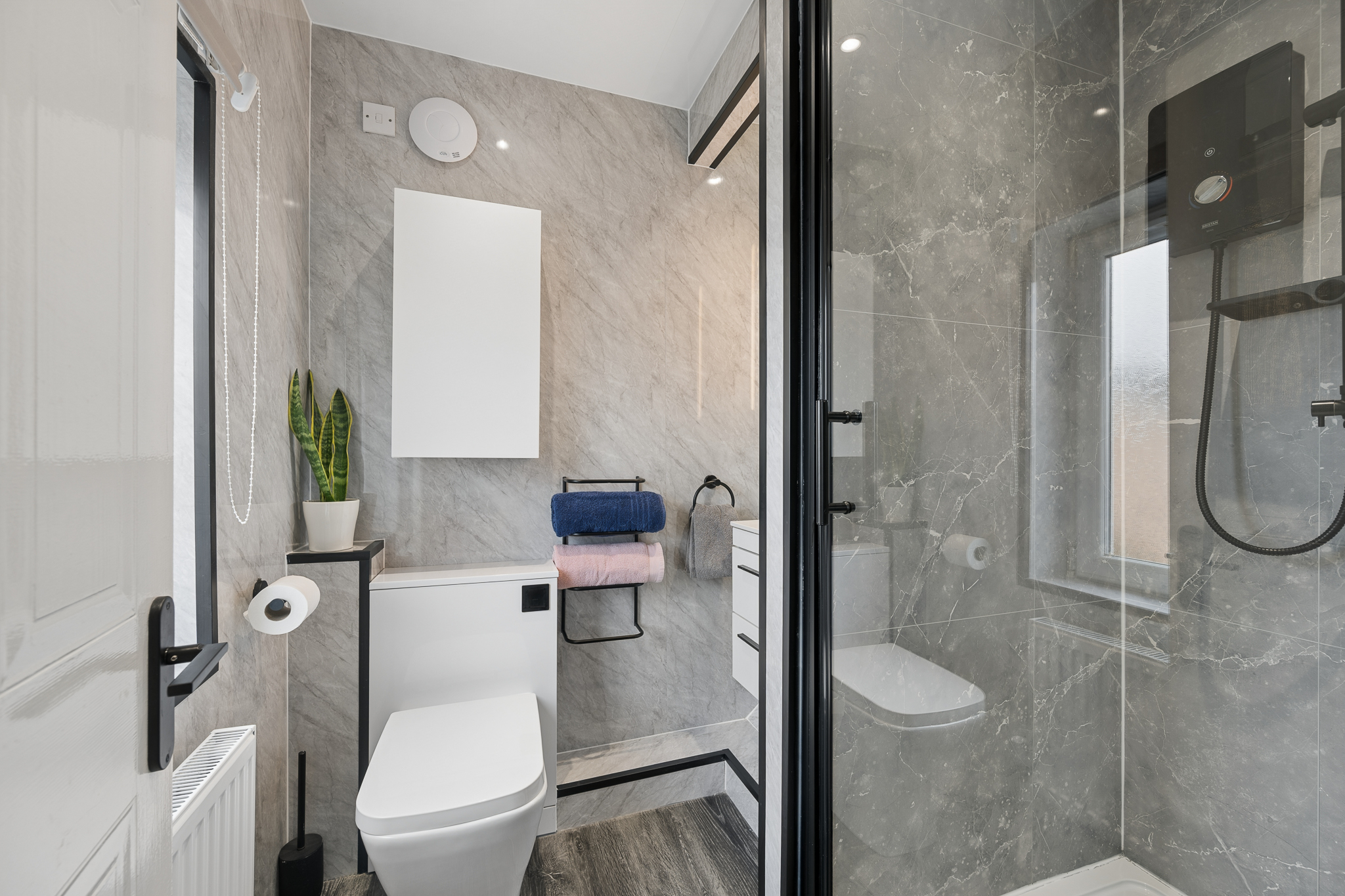 Positioned to the front right, the principal bedroom is a calming retreat, styled in soft grey tones and benefitting from built in wardrobe storage. This room is further complemented by a beautifully modern en-suite, finished with striking grey tiling and black accents, along with a sleek walk-in shower and contemporary fittings.