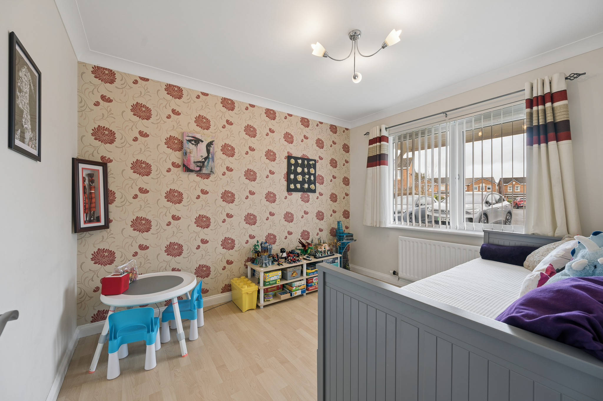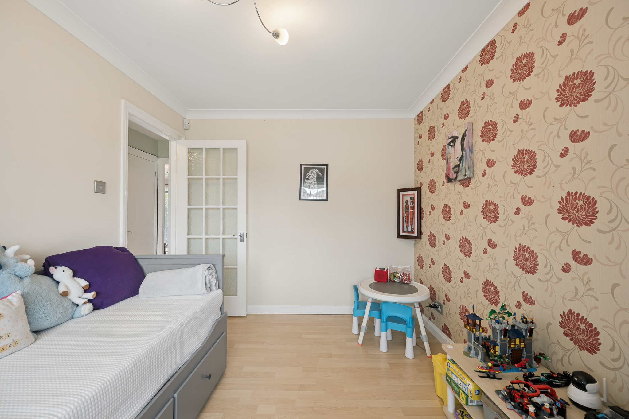 Immediately to the right hand side, a highly versatile room currently arranged as a children’s playroom and occasional bedroom offers fantastic flexibility. Whether utilised as a formal dining room, home office, guest bedroom or dedicated play space, it’s a room that adapts to your lifestyle perfectly.
