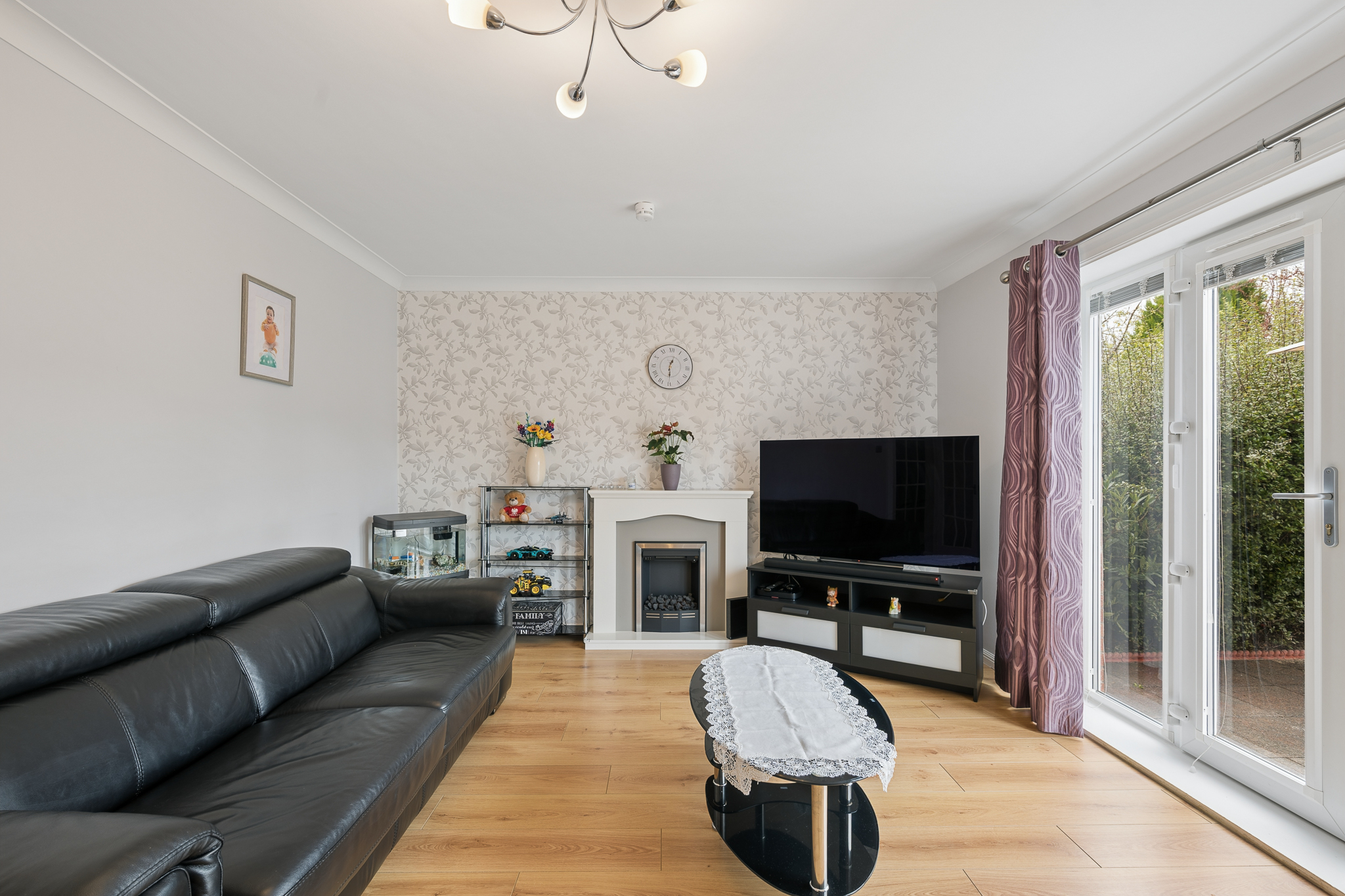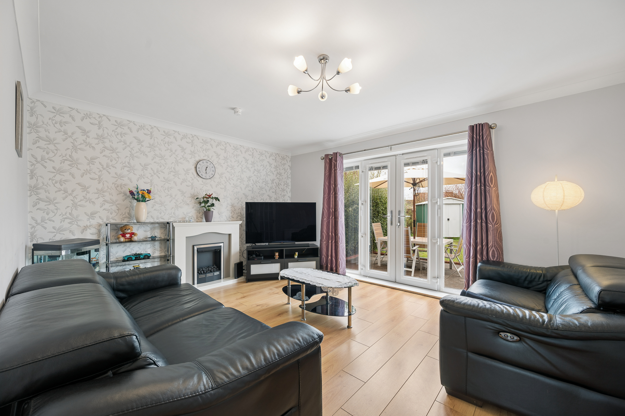To the rear of the property sits the main lounge, a bright and spacious room designed for both relaxing and socialising. With ample space for large furnishings, this inviting area is enhanced by stylish décor, a feature fireplace and an abundance of natural light streaming through the patio doors. These open directly out to the southwest facing rear garden, seamlessly blending indoor and outdoor living.
