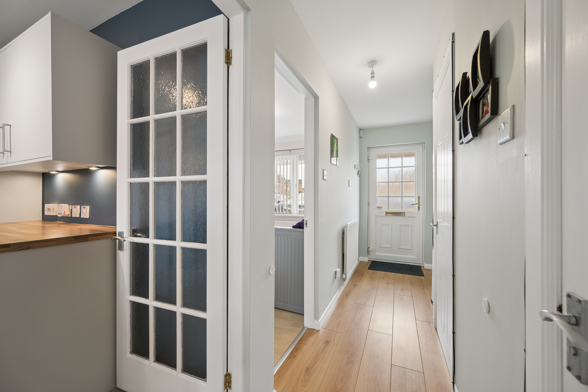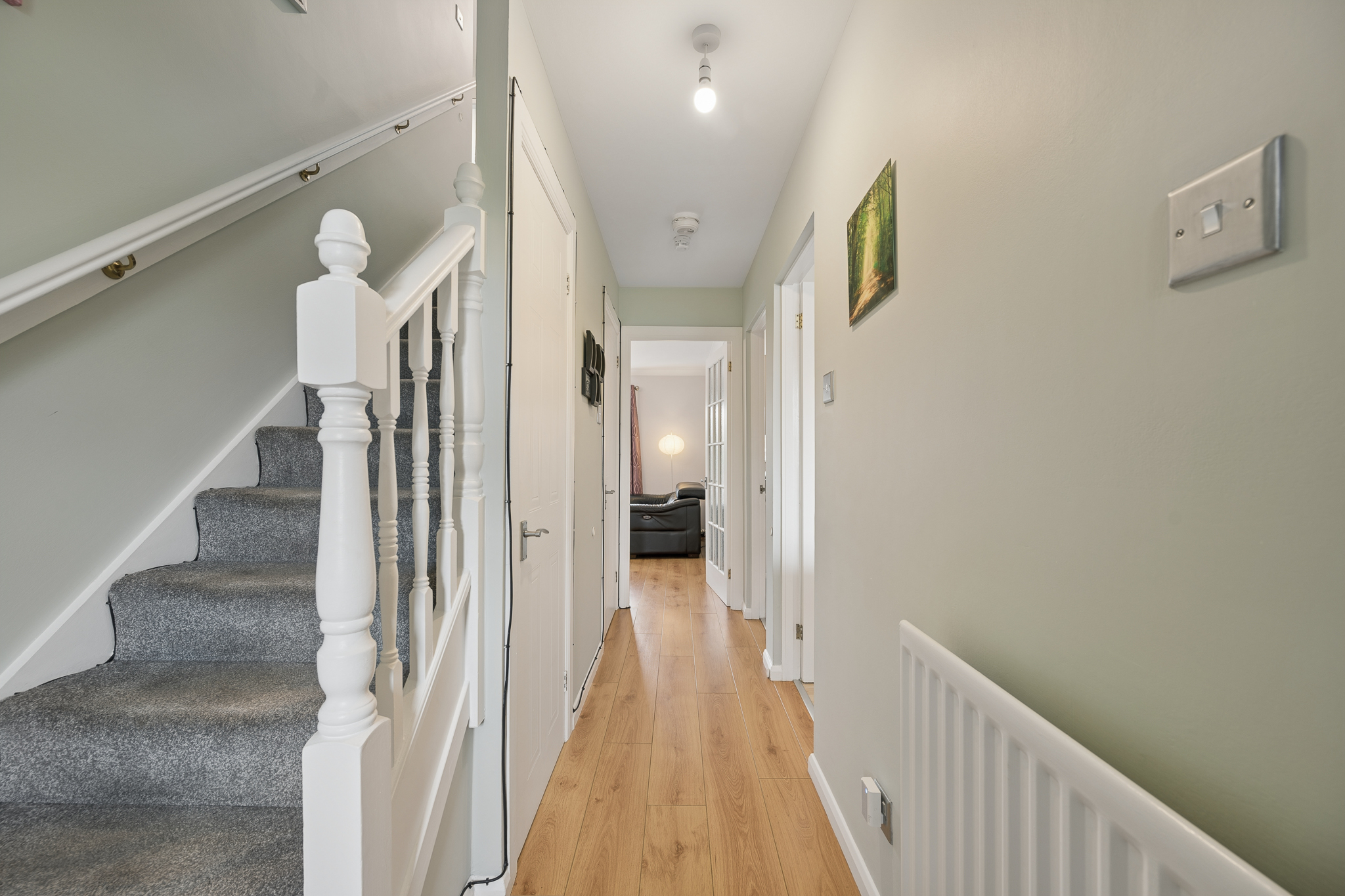 Upon entering, you are welcomed into a bright and inviting hallway, where warm wooden flooring runs underfoot, complemented by soft, earthy toned walls and a plush grey carpet rising up the staircase, setting the tone for the stylish yet homely interiors throughout.