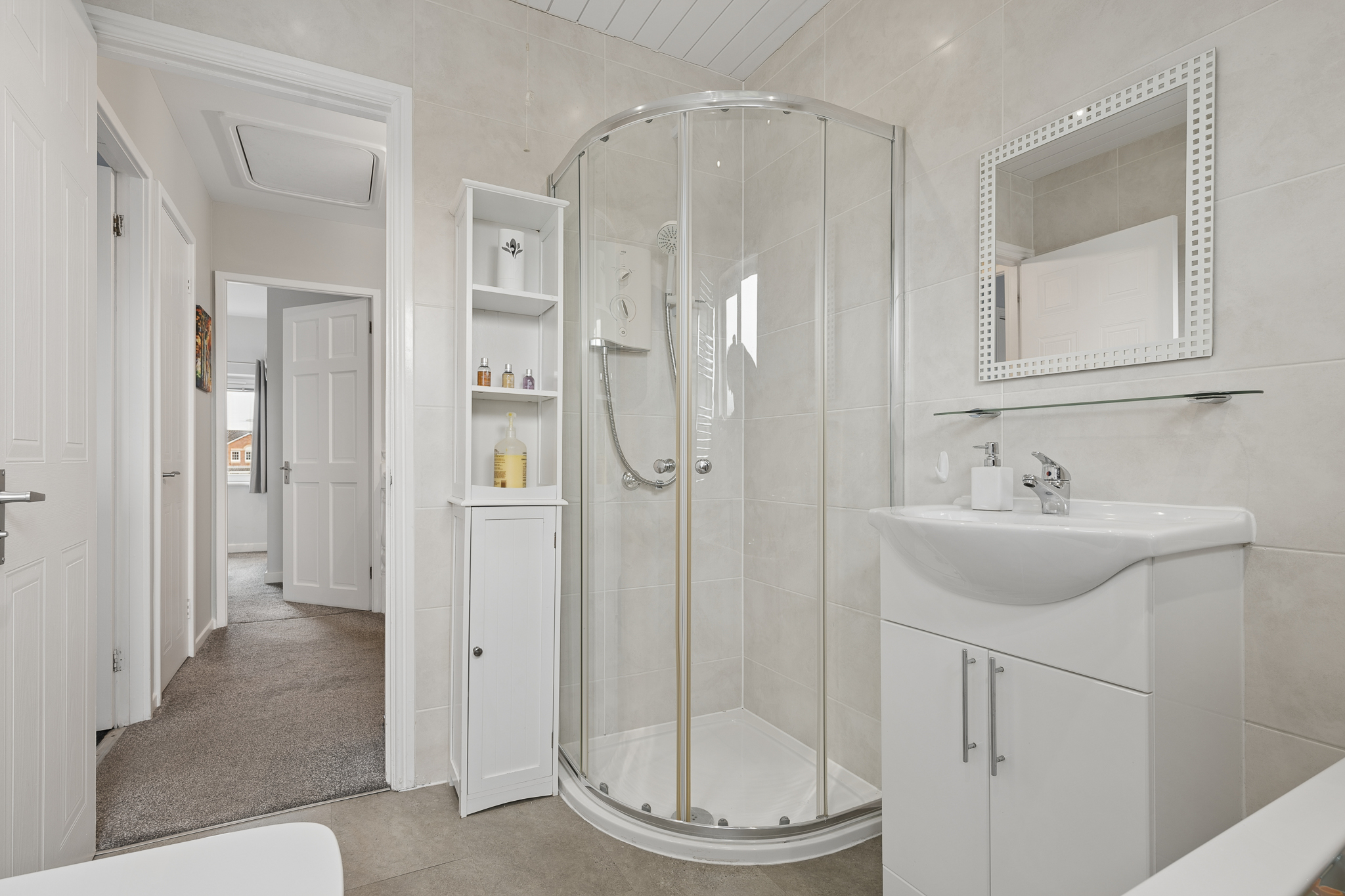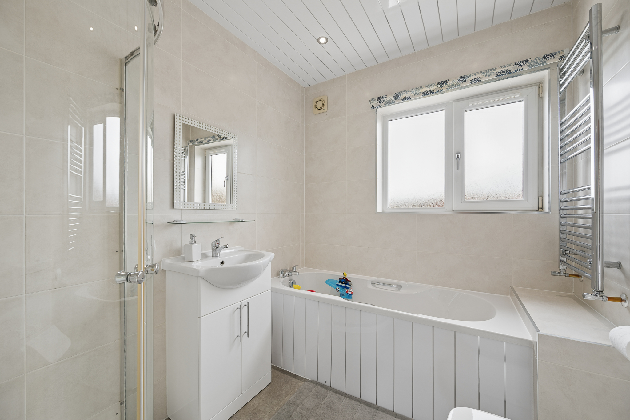 Completing the upper level is the family bathroom, fitted as a four piece suite including a separate shower enclosure and bath. Finished in neutral tiling with a clean, modern aesthetic, it also benefits from a vanity unit, chrome towel radiator and a bright frosted window allowing in natural light while maintaining privacy.