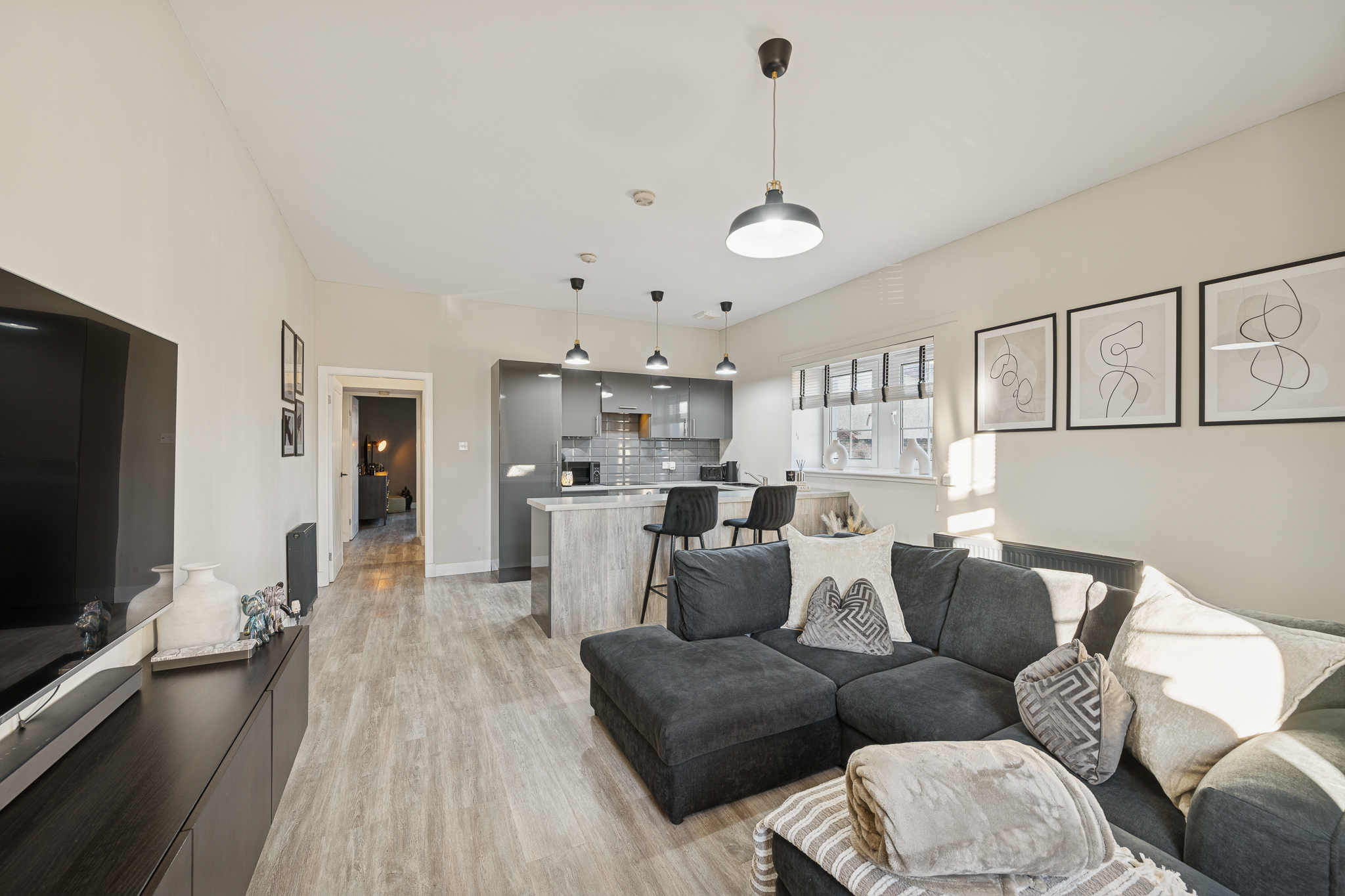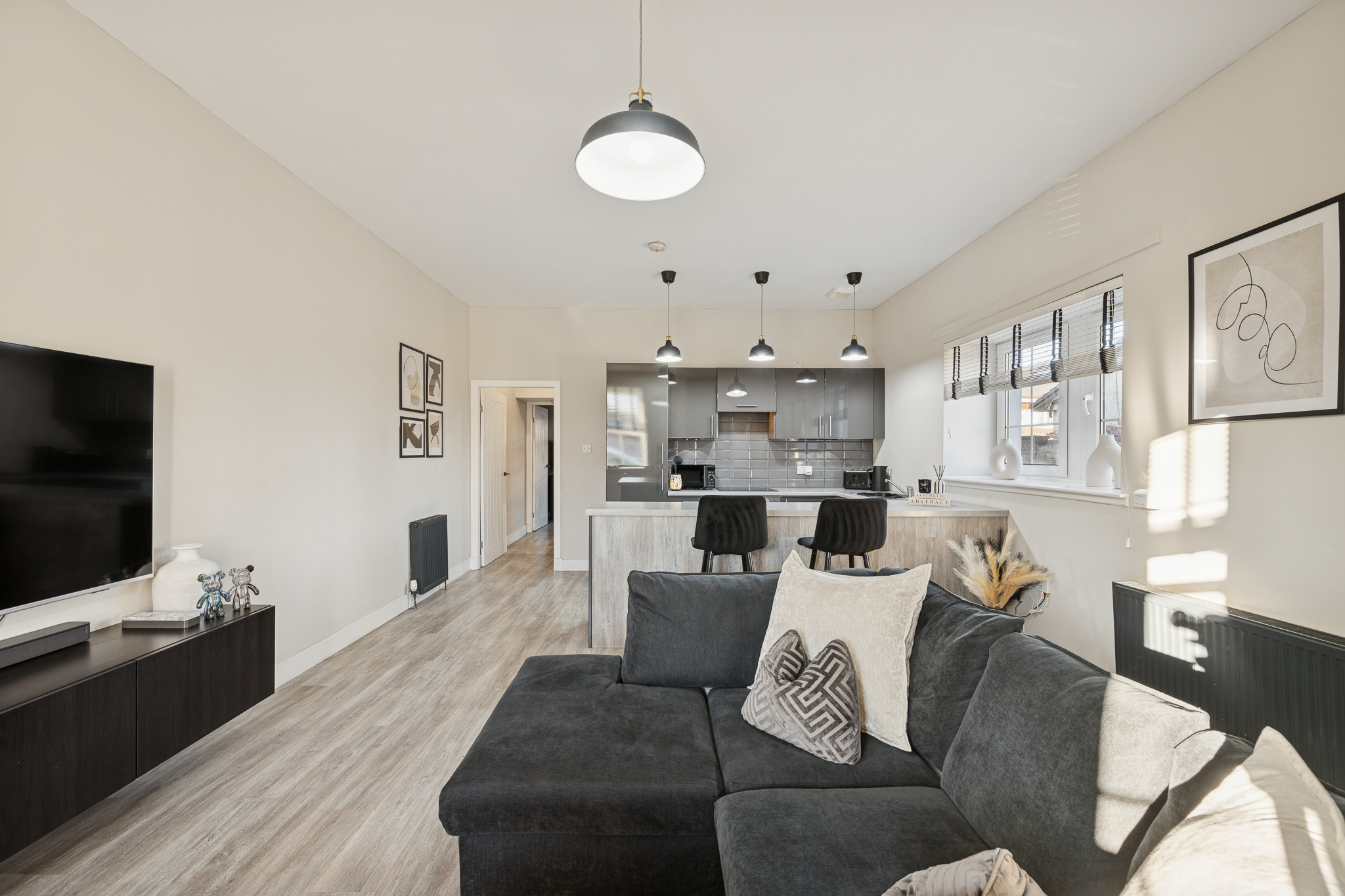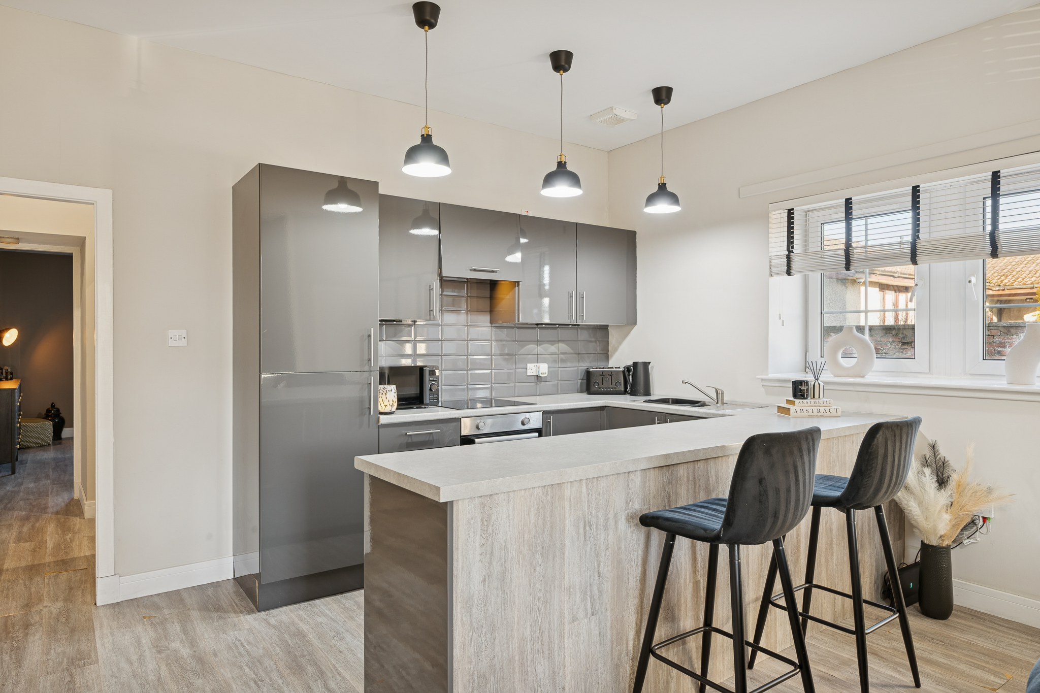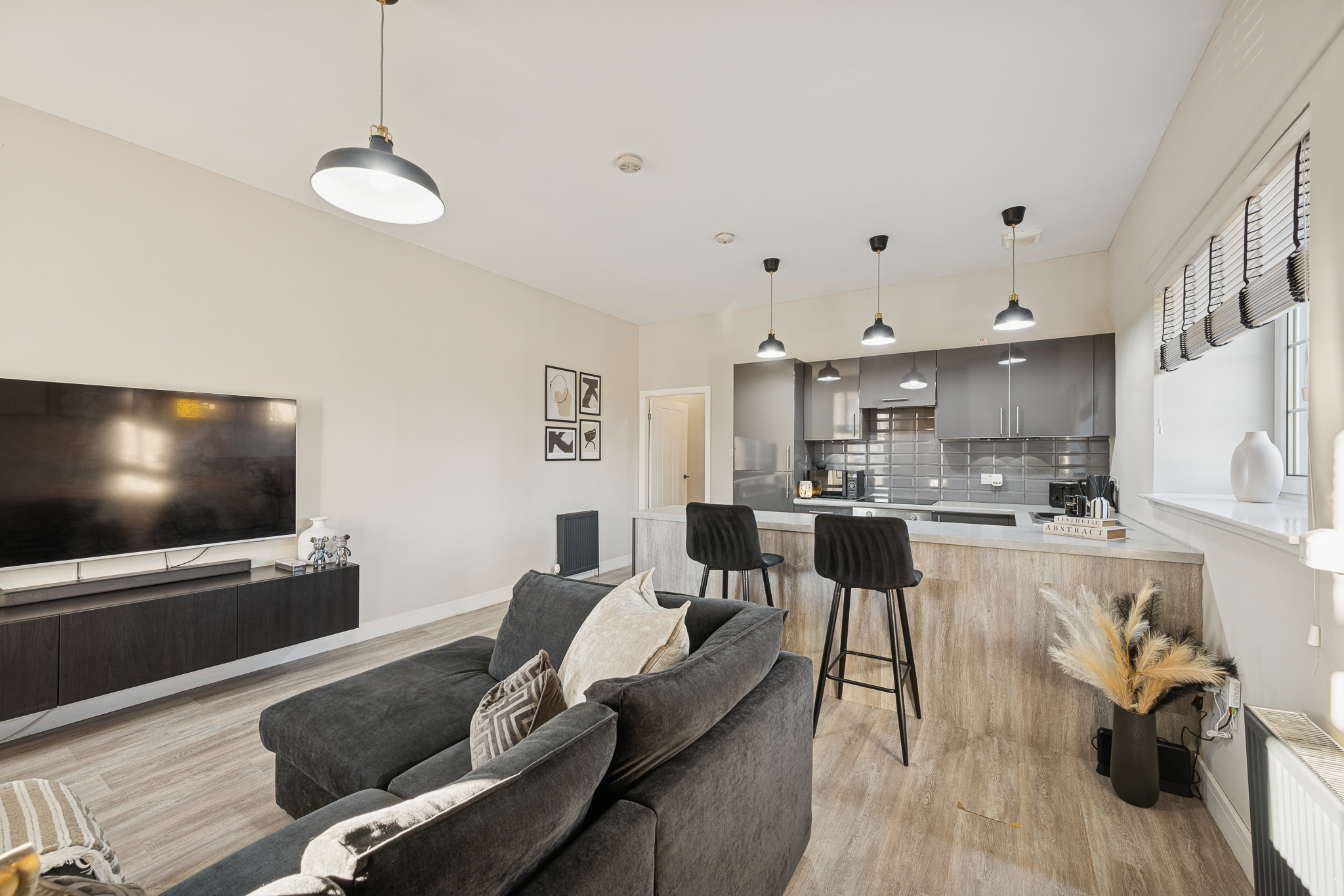 The kitchen is sleek and stylish, finished in high-gloss grey cabinetry that reflects light and enhances the sense of space. Integrated appliances maintain a clean, streamlined look, while the grey tiled splashback adds texture and visual interest without distracting from the overall aesthetic. A long breakfast bar with a light-toned worktop creates a natural divide between kitchen and living areas and comfortably accommodates bar stools, making it ideal for casual dining, entertaining, or working from home. Matte black accessories and fittings tie in beautifully with the darker accents used throughout the flat.