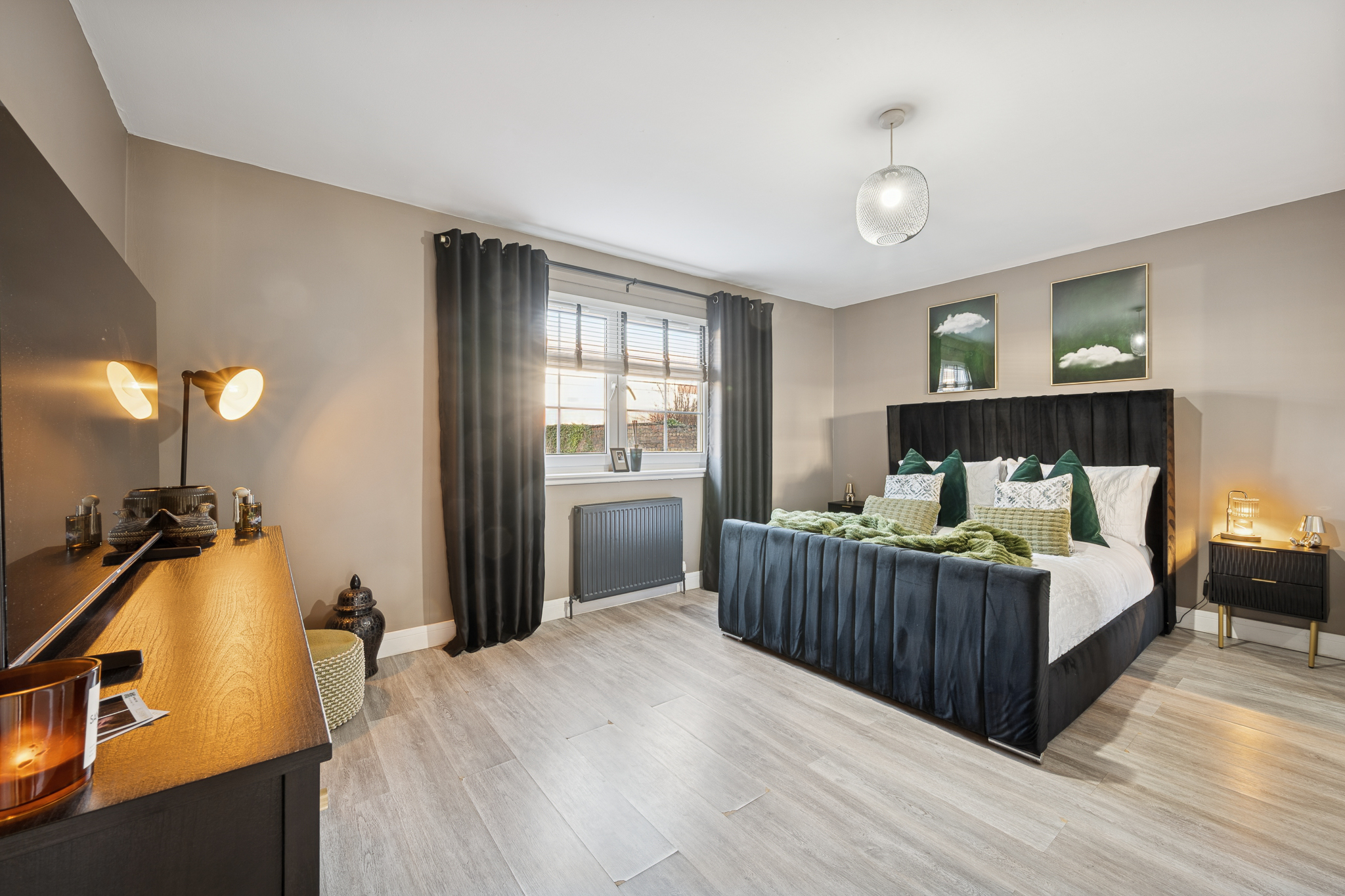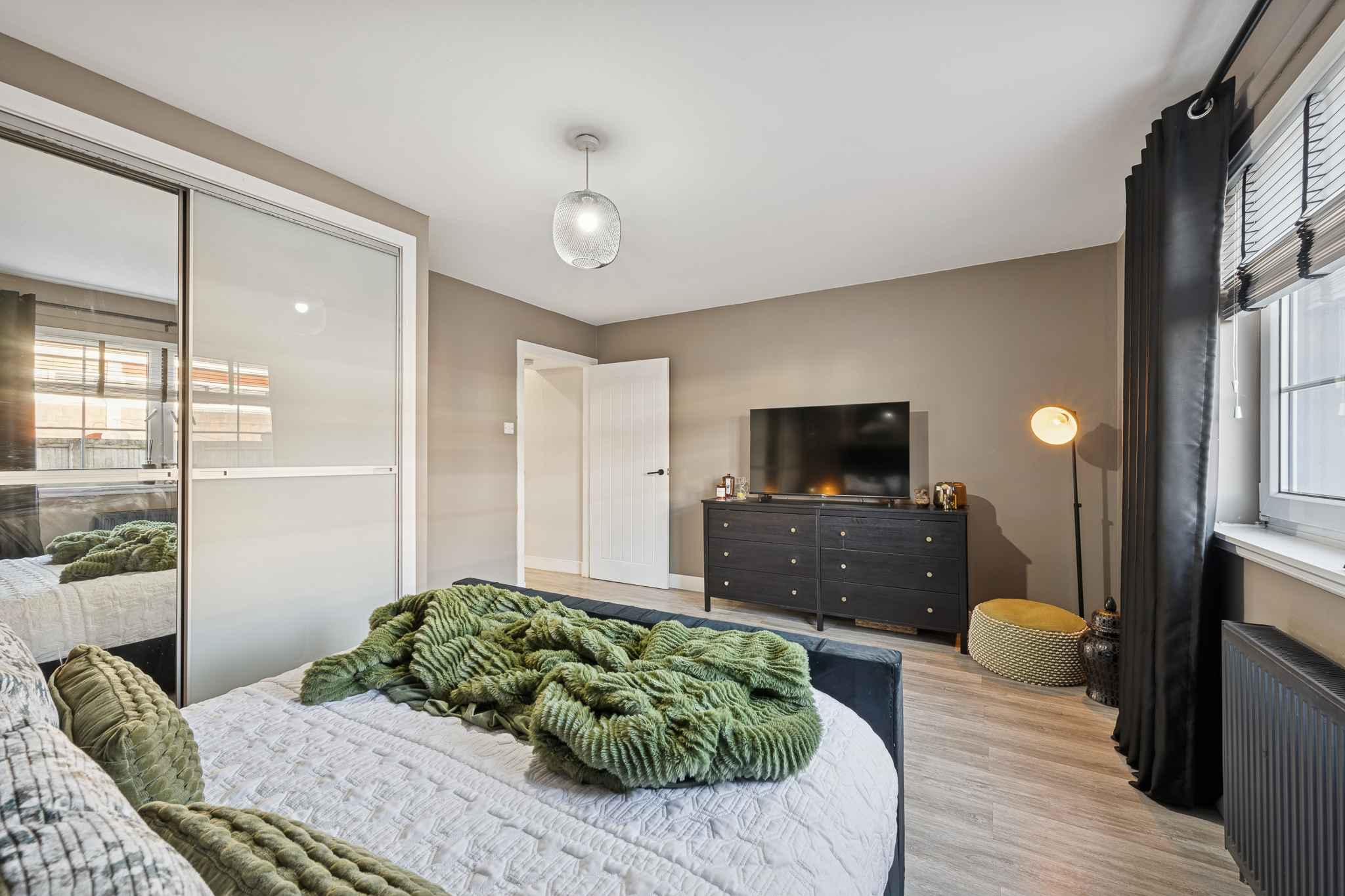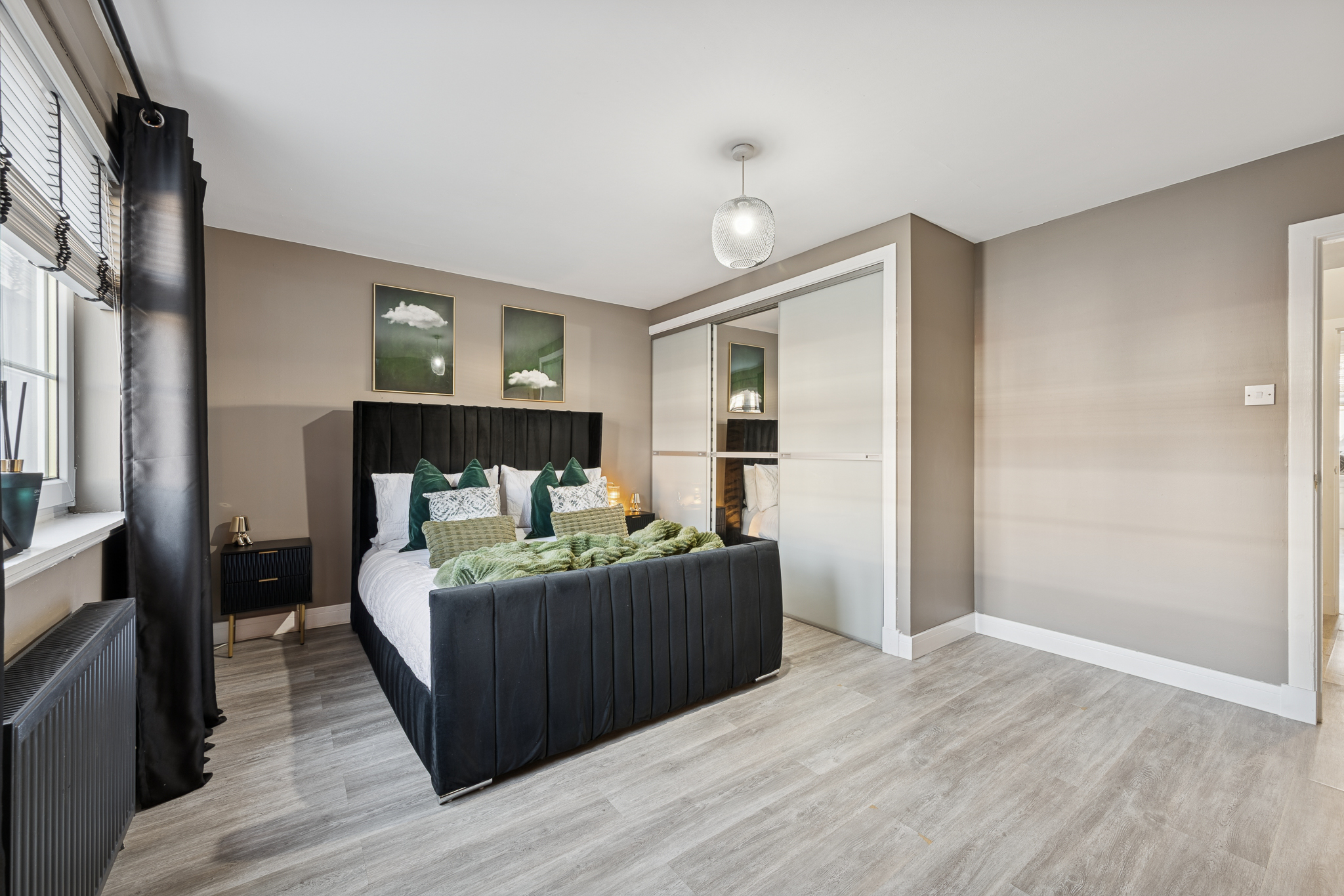 To the rear of the property, the double bedroom offers a calm and restful retreat. Decorated in warm taupe and earthy tones, the space feels grounded and relaxing. A statement upholstered bed frame in a deep charcoal shade anchors the room, while soft green textiles and layered cushions introduce warmth and subtle colour. There is excellent space for bedside furniture and storage, and mirrored wardrobes enhance both practicality and light within the room. Soft lighting and thick curtains further add to the sense of comfort and privacy.