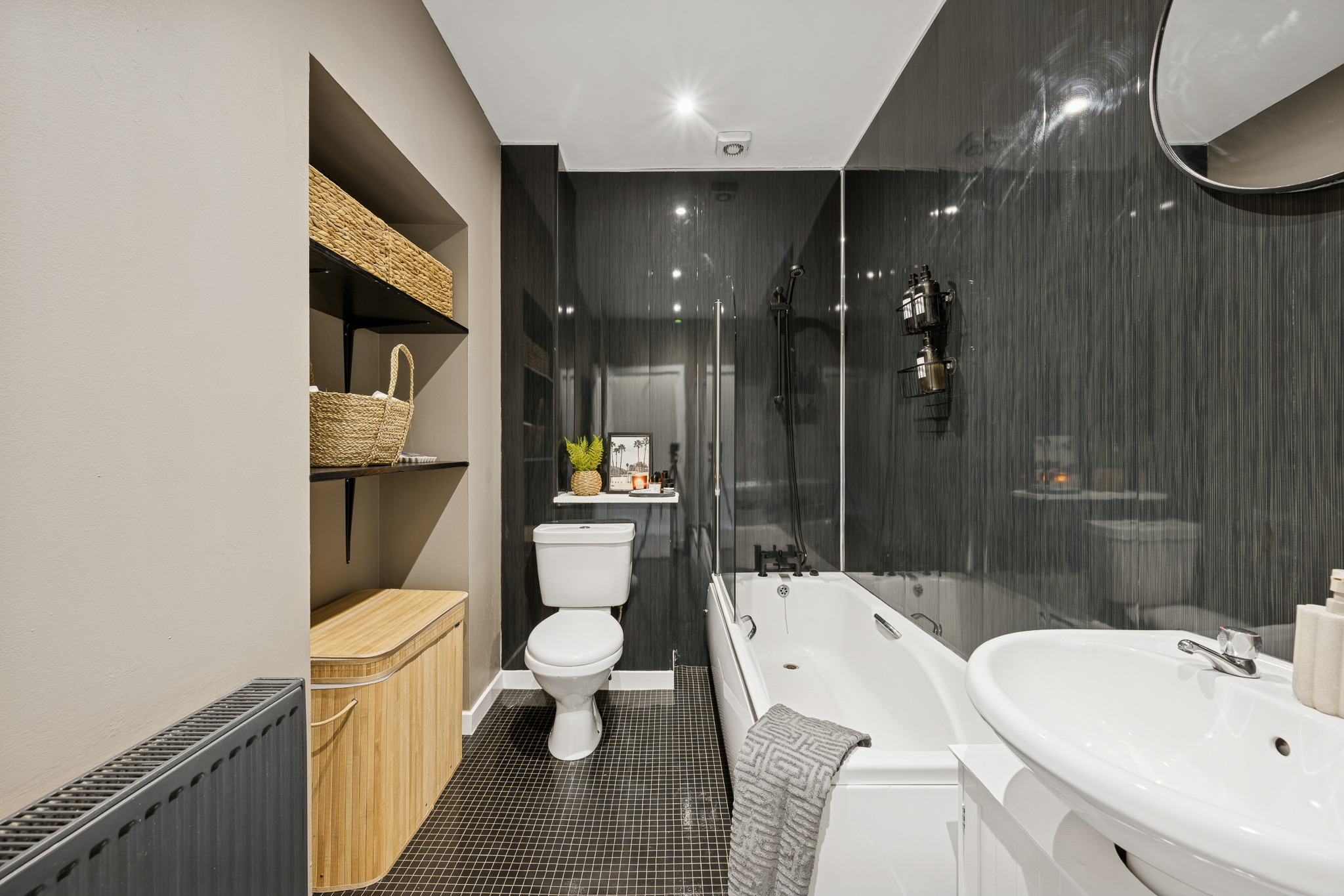 The bathroom, located on the right-hand side, is striking in both colour and finish. Dark, high-gloss wall panels create a bold, contemporary backdrop, instantly giving the space a luxury, hotel-style feel. These are perfectly contrasted by the crisp white sanitaryware, including a full-sized bath with an overhead shower. The black mosaic-style flooring adds texture underfoot and ties in seamlessly with the darker wall finishes, while recessed lighting keeps the room bright and polished.