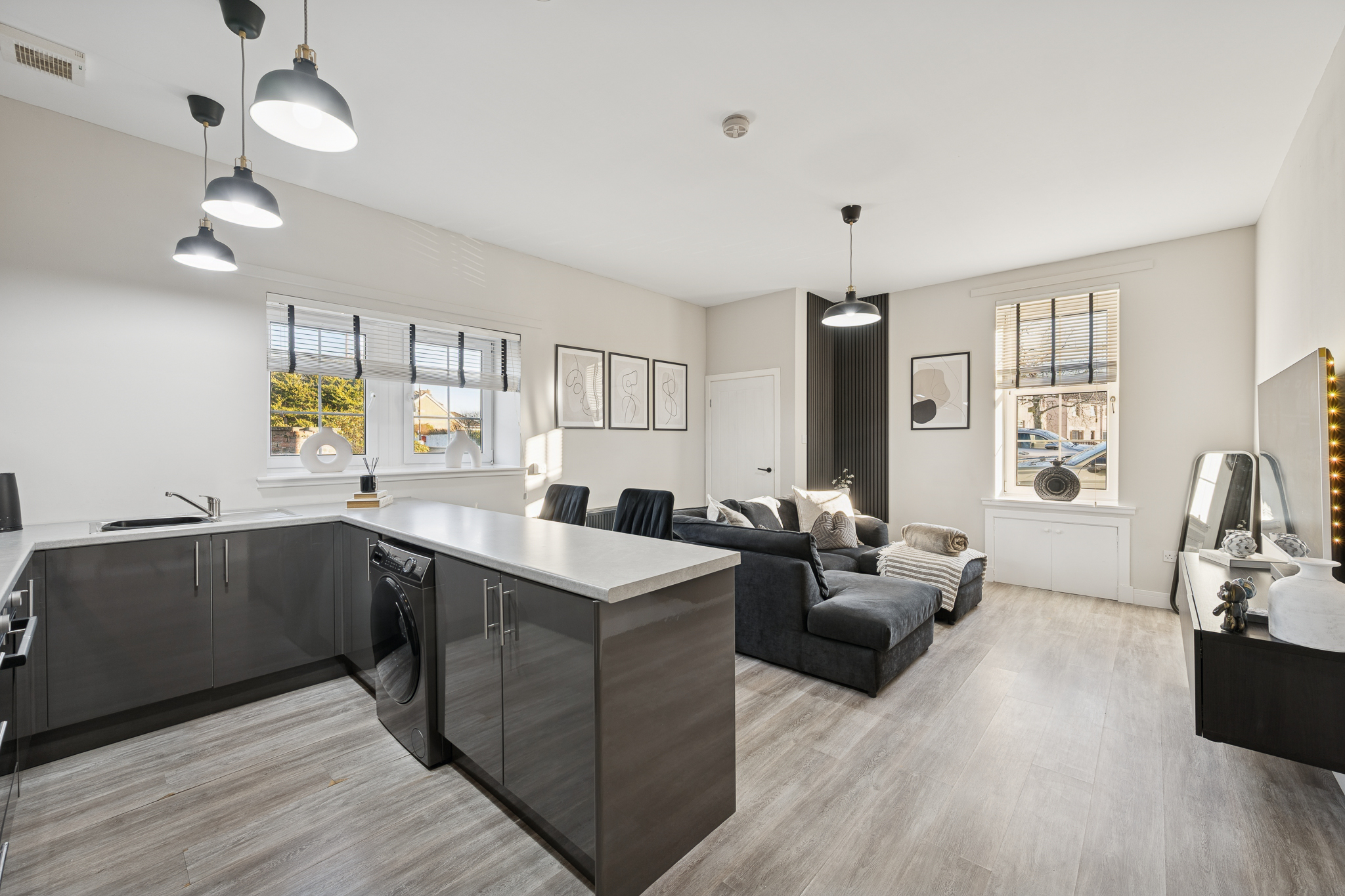 The open-plan living, dining and kitchen area is the true heart of the property and has been finished with a strong focus on tone, texture and flow. Warm, wood-effect flooring runs seamlessly throughout, grounding the space and adding softness against the contemporary finishes. The walls are painted in soft neutral hues, allowing the darker furniture and fittings to stand out without overwhelming the room.