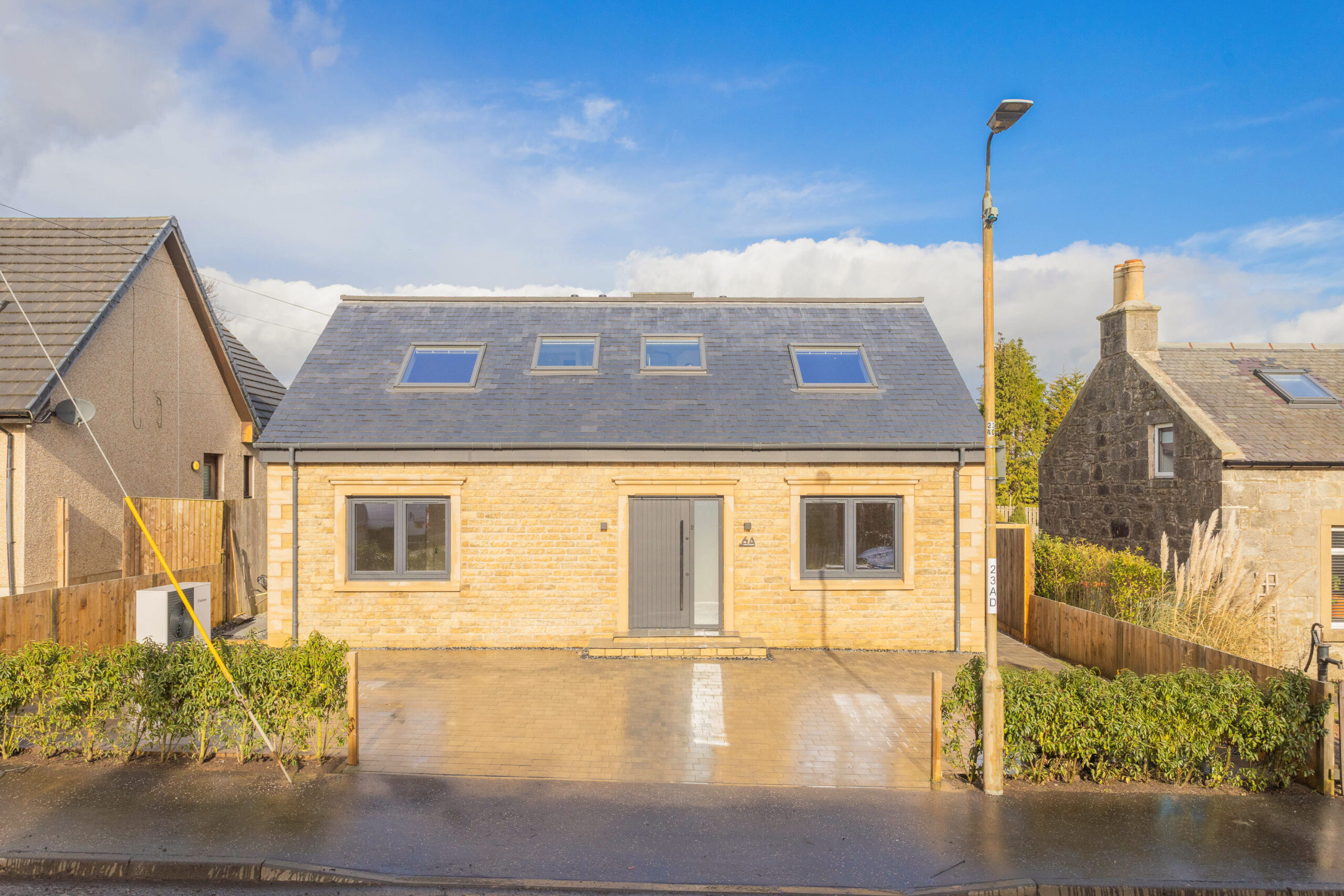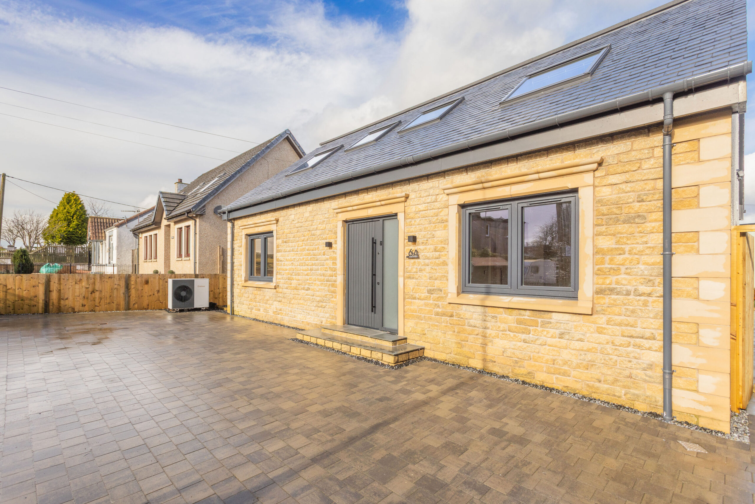 From the moment you arrive, the striking sandstone façade and contemporary lines immediately set the tone. The symmetry of the front elevation, framed by modern dark window surrounds and rooflights above, gives a bold yet elegant first impression. The generous monoblock driveway offers ample parking, while the carefully chosen materials create a home that feels both substantial and refined.