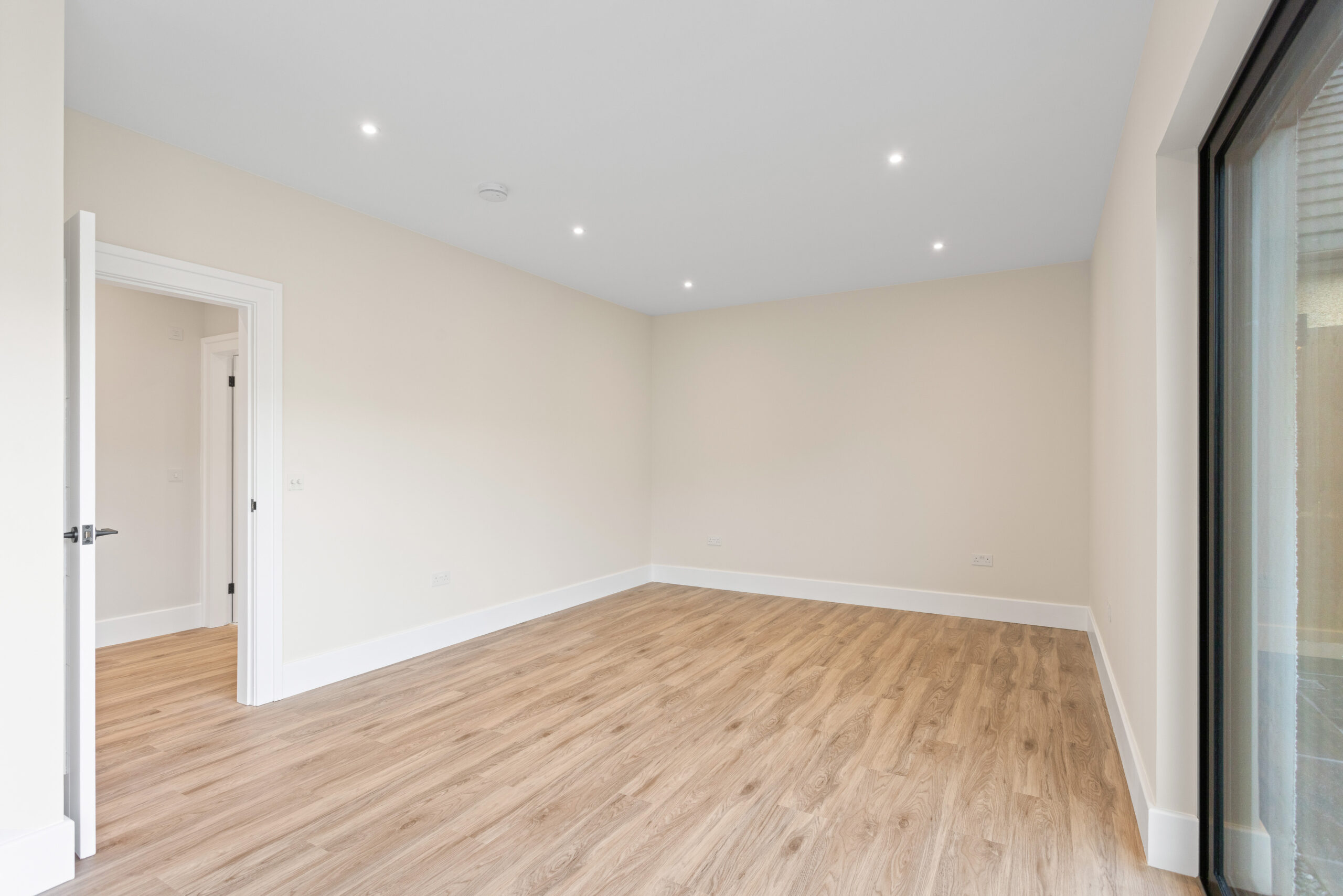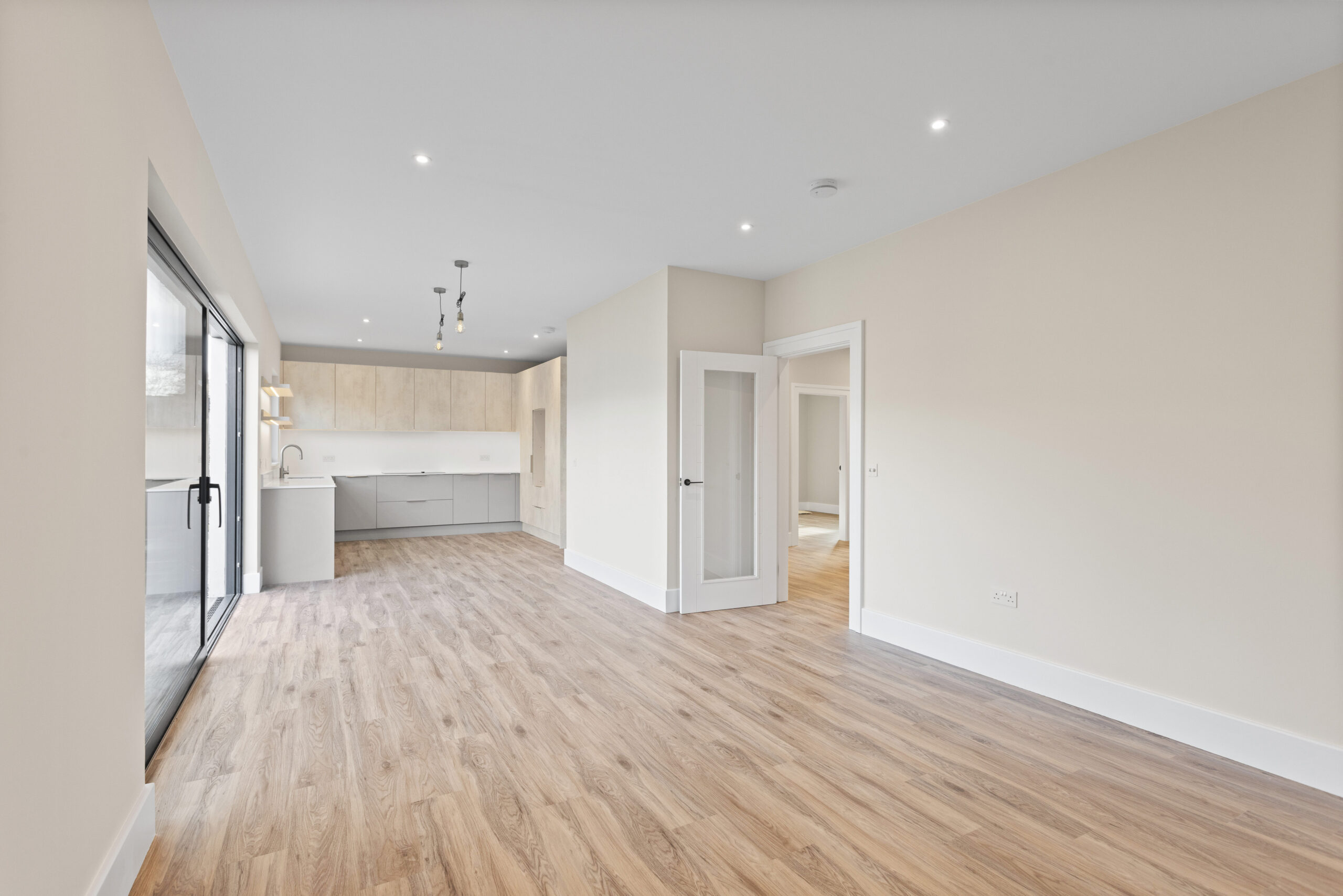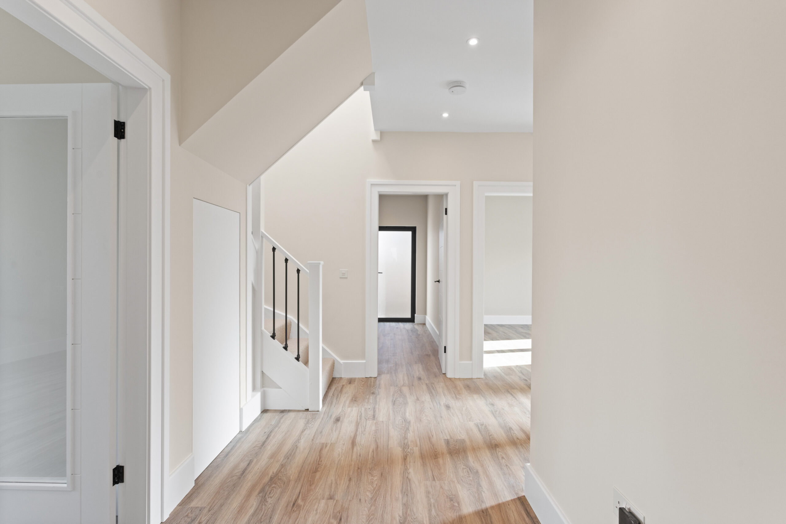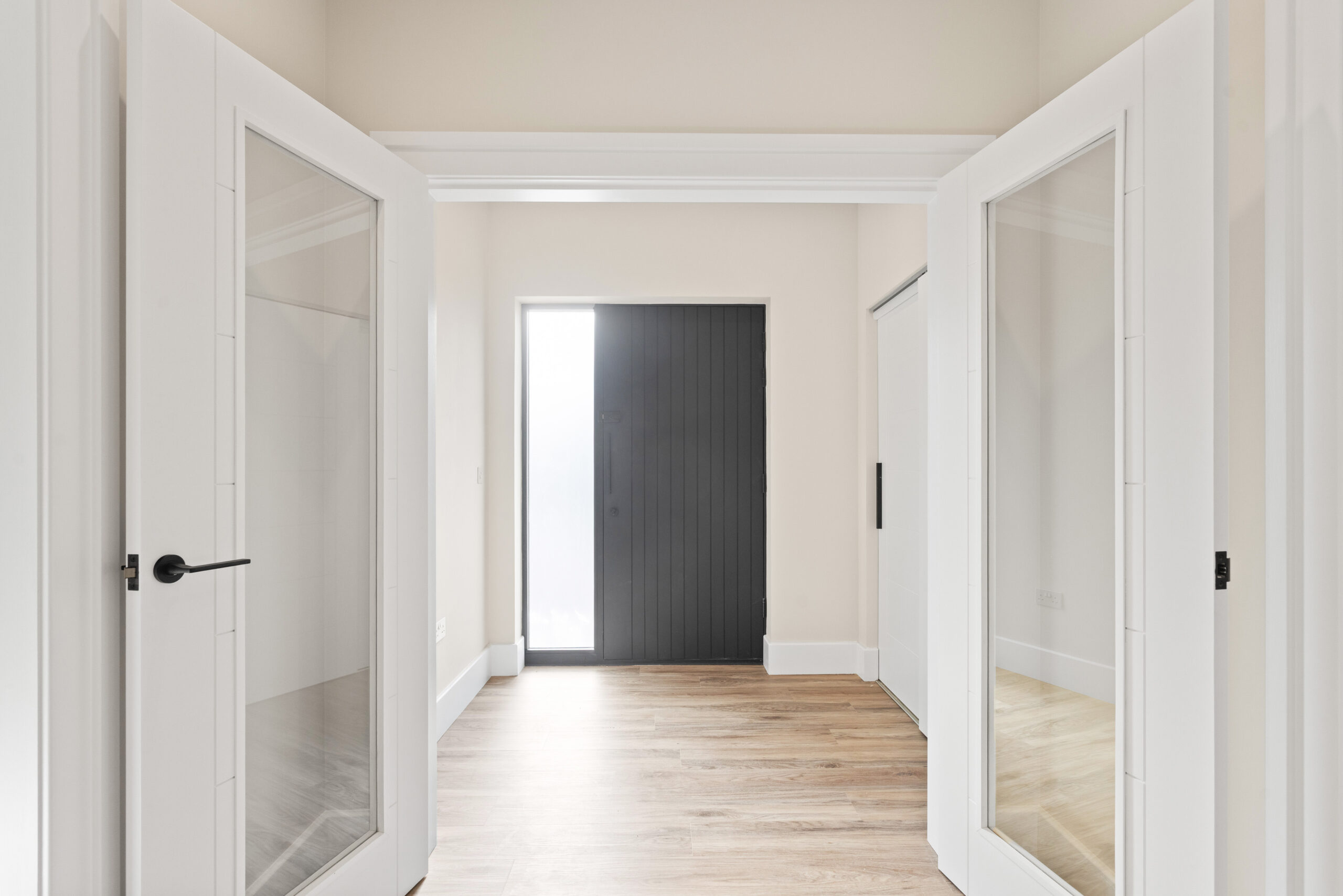 Through the glass doors and into the main hallway, the sense of space is immediate. Neutral tones create a calming backdrop while high quality LVT flooring runs seamlessly underfoot, enhancing the flow throughout the ground floor. Clean lines, crisp white facings and underfloor heating elevate the aesthetic, giving a subtle contemporary edge.