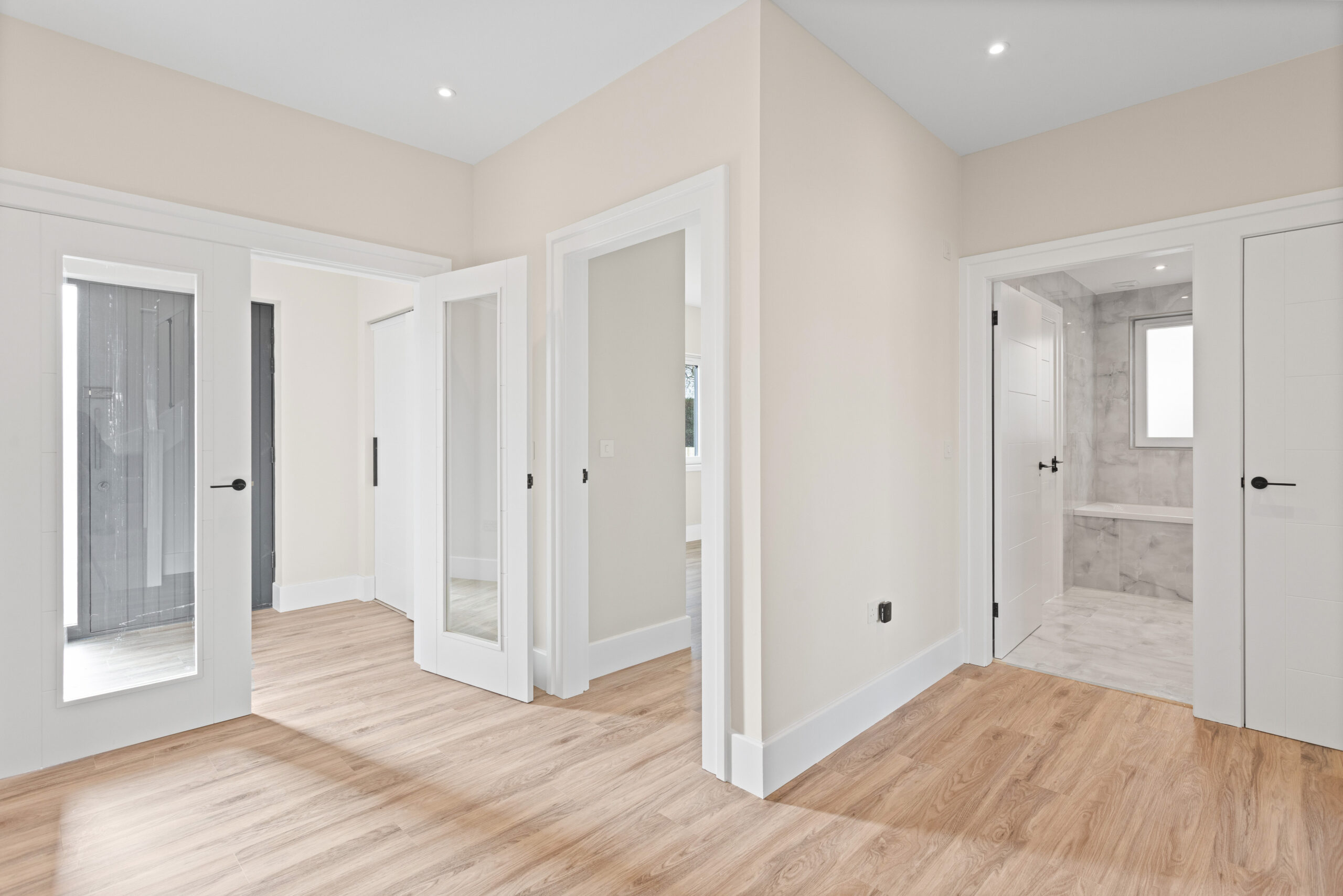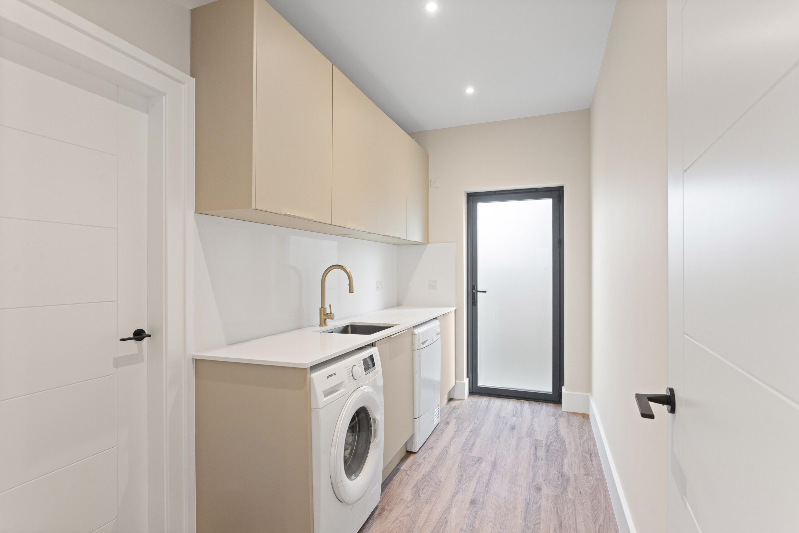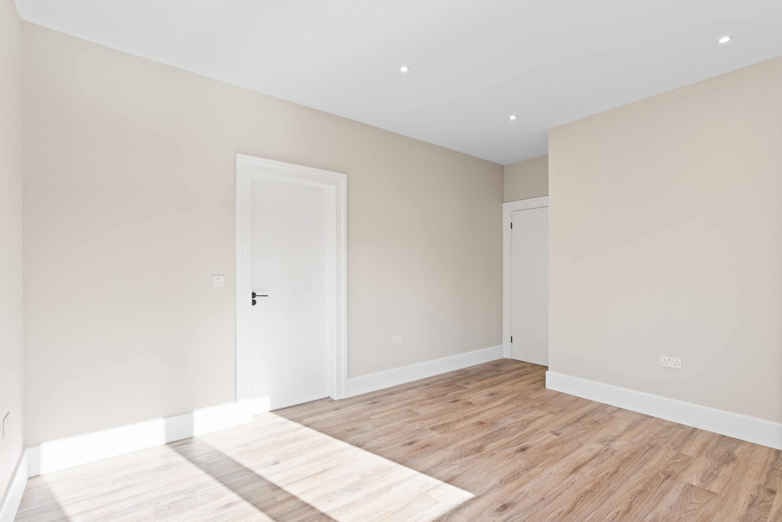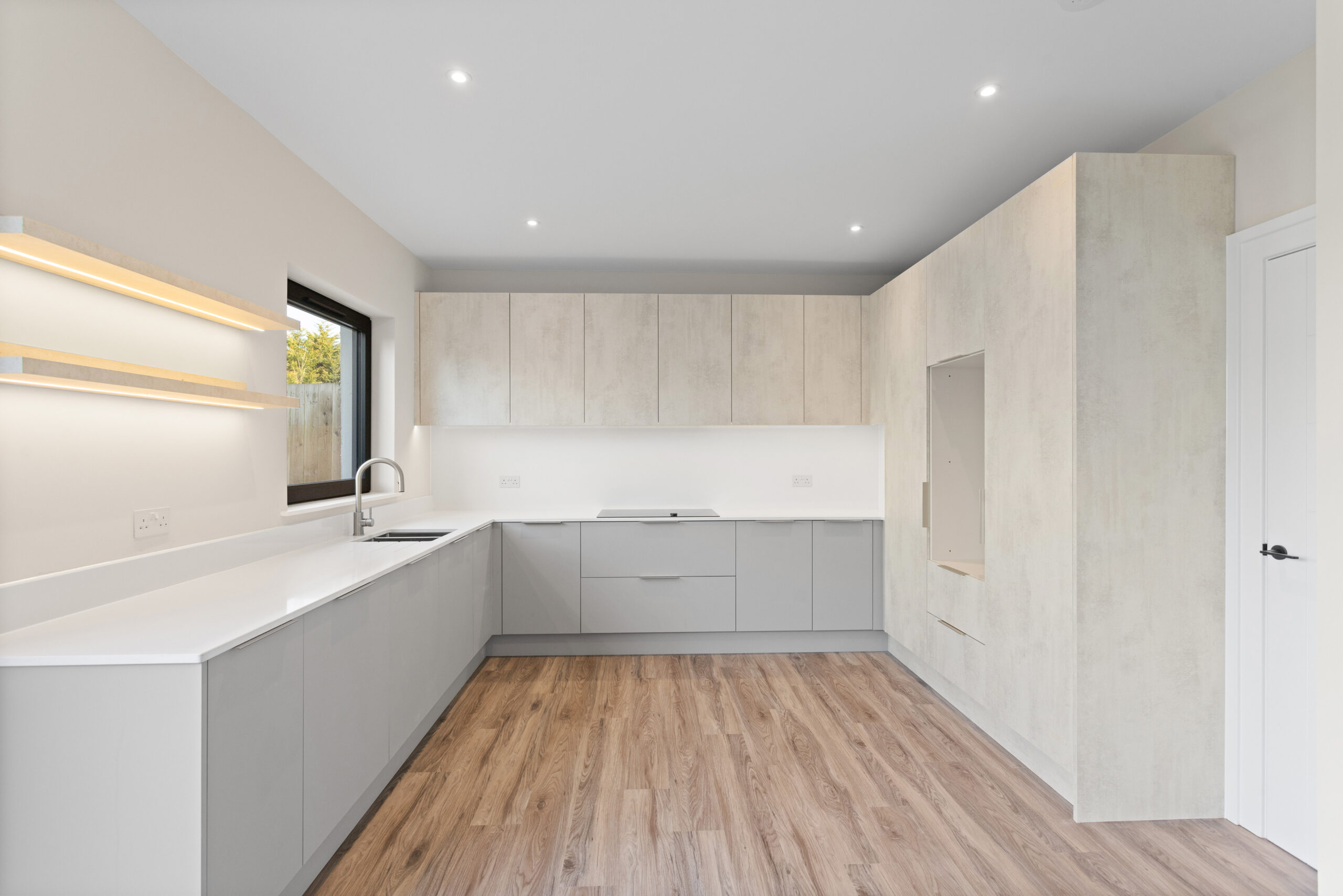 Through the glass doors and into the main hallway, the sense of space is immediate. Neutral tones create a calming backdrop while high quality LVT flooring runs seamlessly underfoot, enhancing the flow throughout the ground floor. Clean lines, crisp white facings and underfloor heating elevate the aesthetic, giving a subtle contemporary edge.