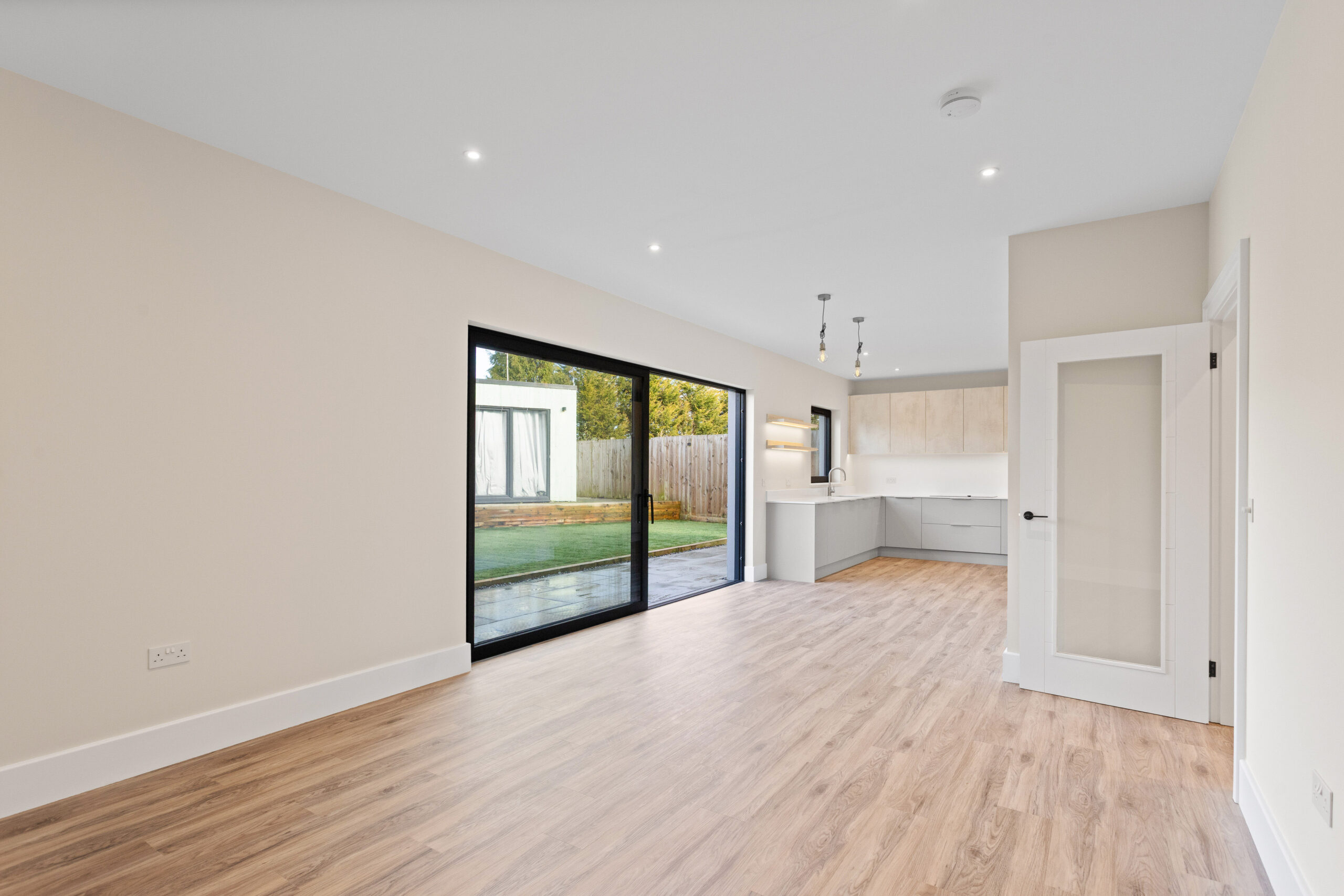 There is ample room for a large dining table and relaxed seating area, making this a space designed for entertaining and everyday family life. Expansive sliding patio doors stretch across the rear elevation, drawing in natural light and creating a seamless connection to the garden beyond.
