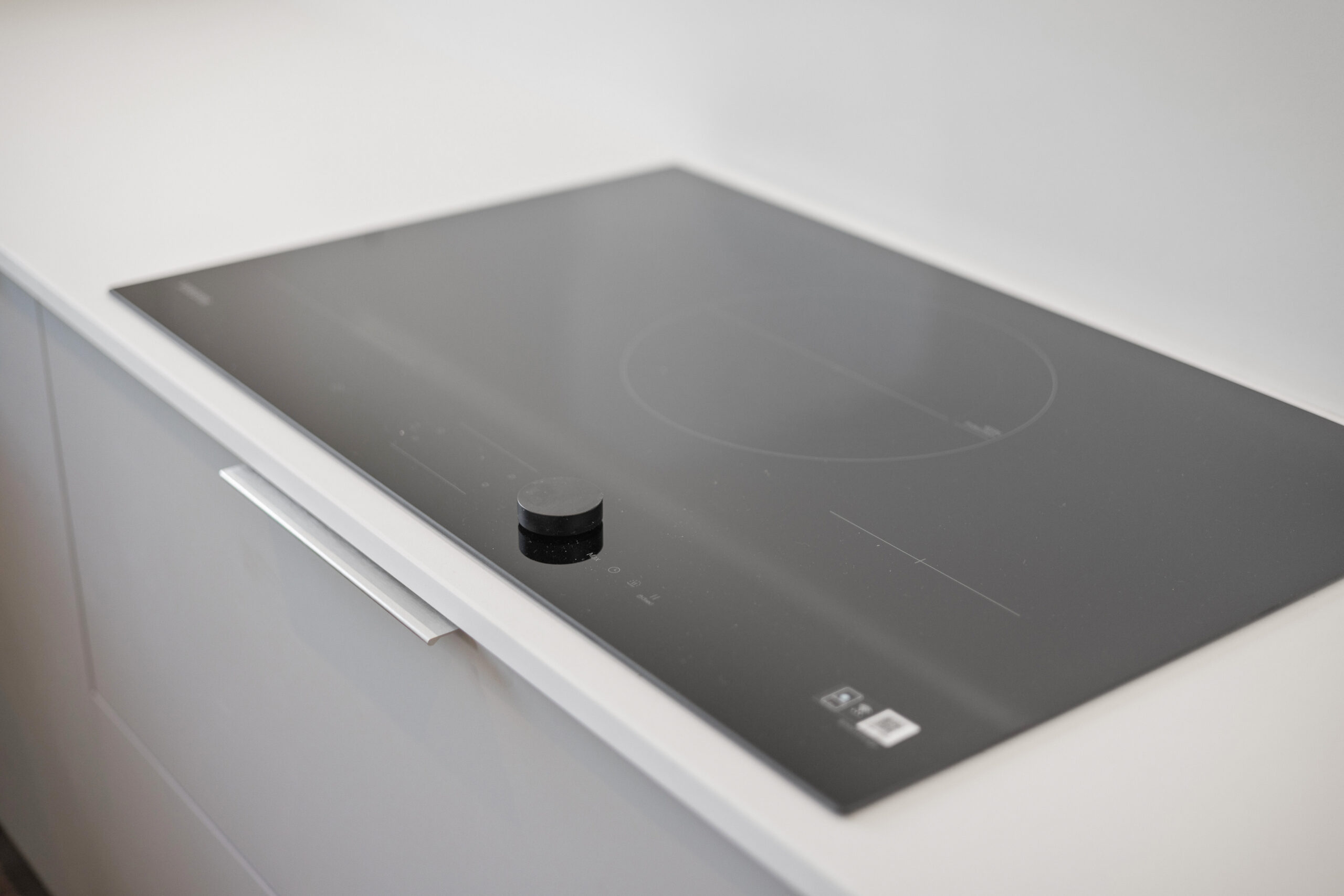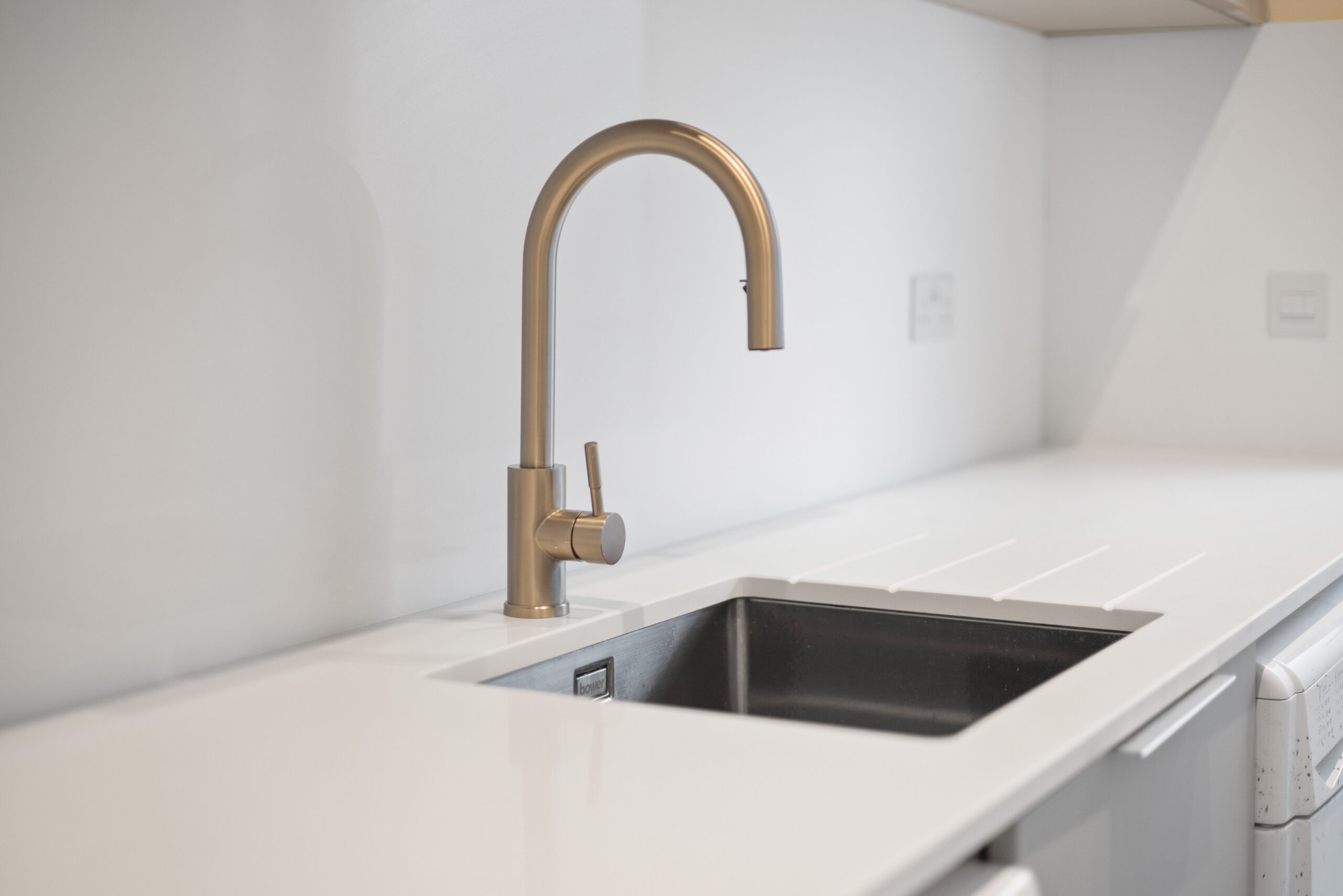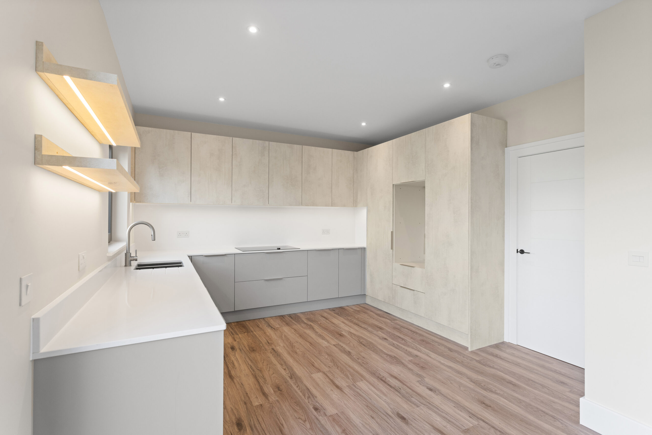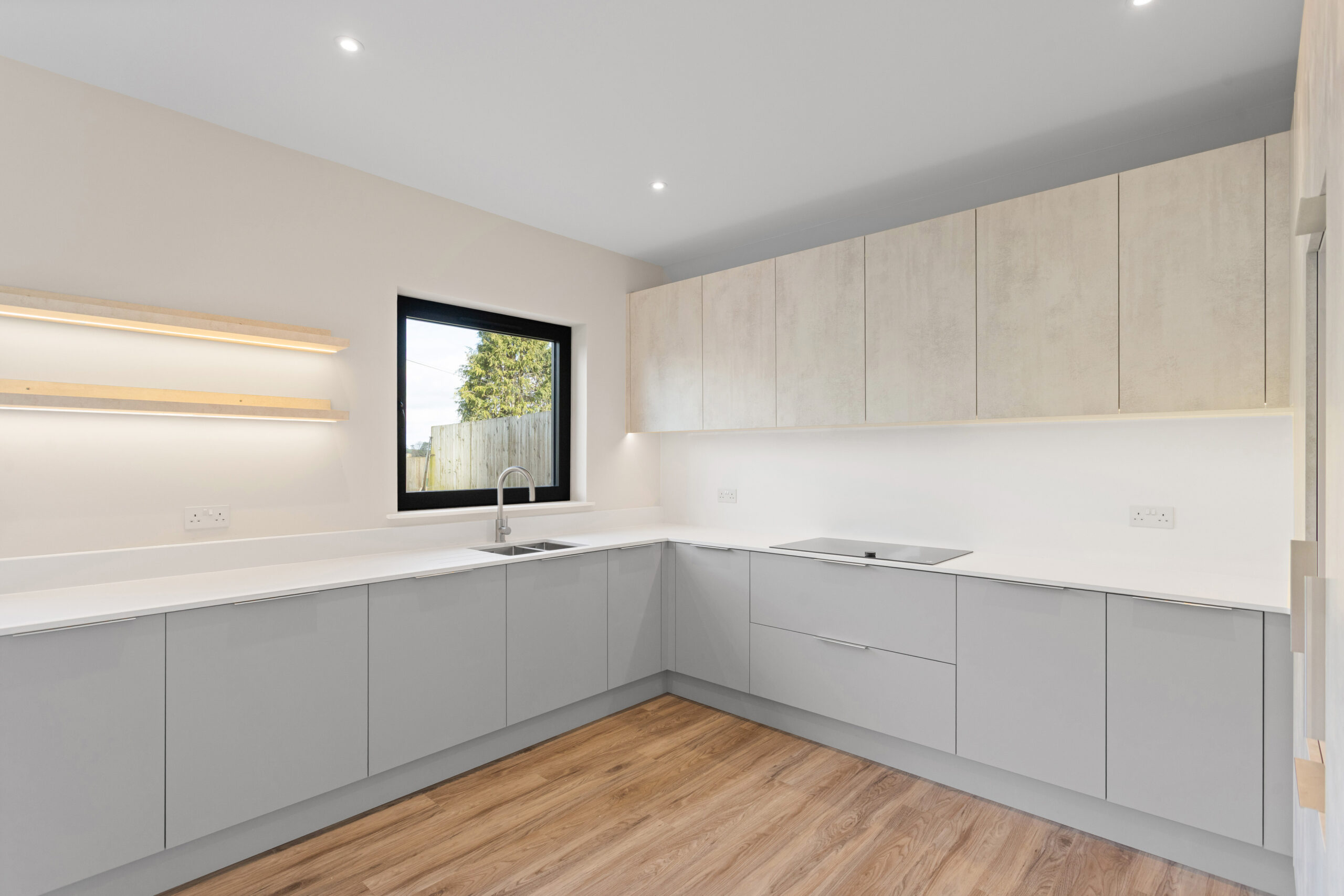 The open plan kitchen, living and dining space to the rear is the heart of this property. Contemporary matte cabinetry in soft neutral tones is paired with sleek worktops and integrated appliances, creating a clean, streamlined look. Under cabinet lighting and recessed spotlights add warmth and depth, while the generous U shaped layout offers both functionality and social flow.