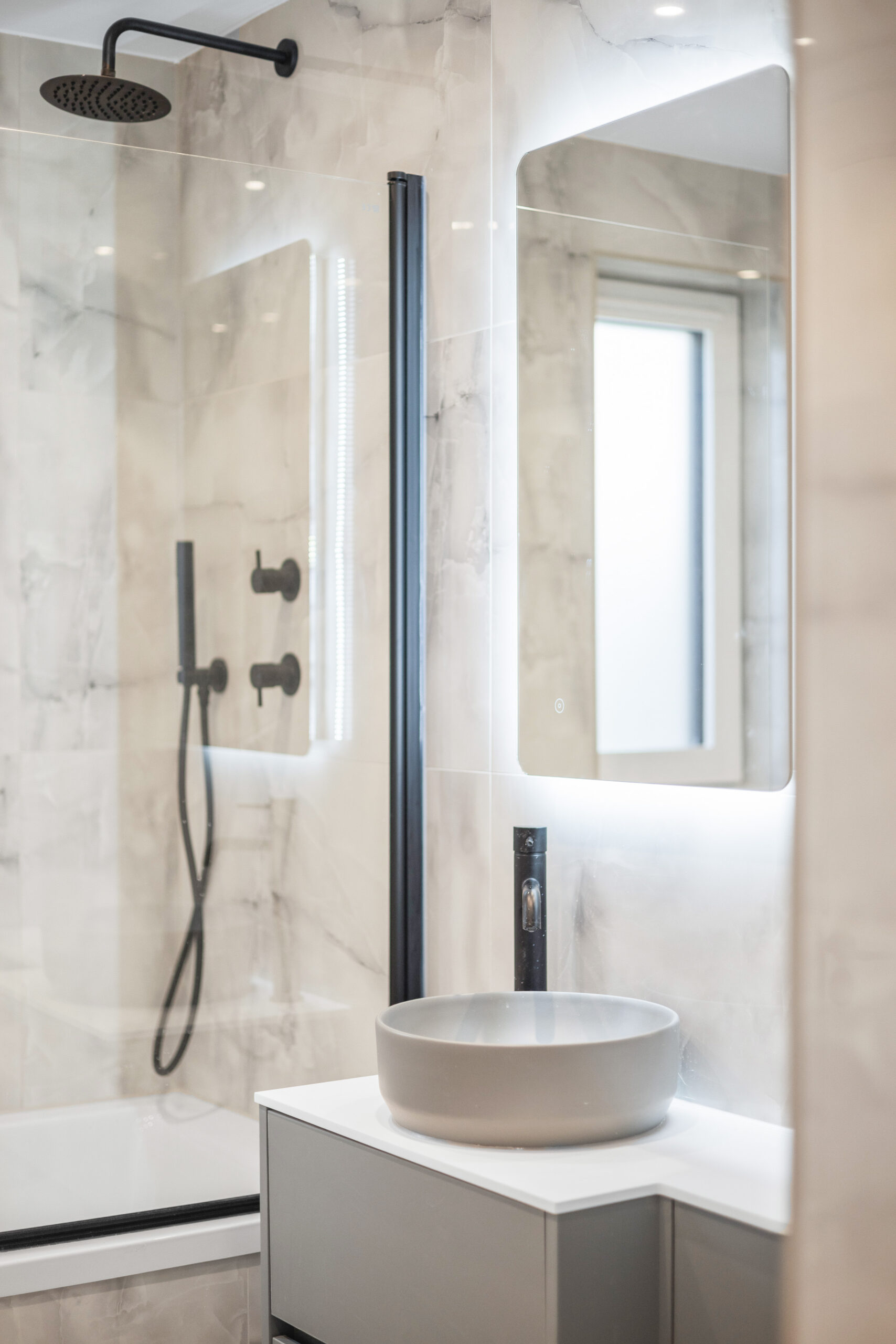 Back inside, the ground floor is completed by the stunning family bathroom, fully tiled from floor to ceiling in marble effect finishes. A contemporary bath with overhead shower, sleek vanity unit, LED mirror and striking black fixtures create a space that feels luxurious and spa like. The quality of finish here is evident, no expense has been spared.