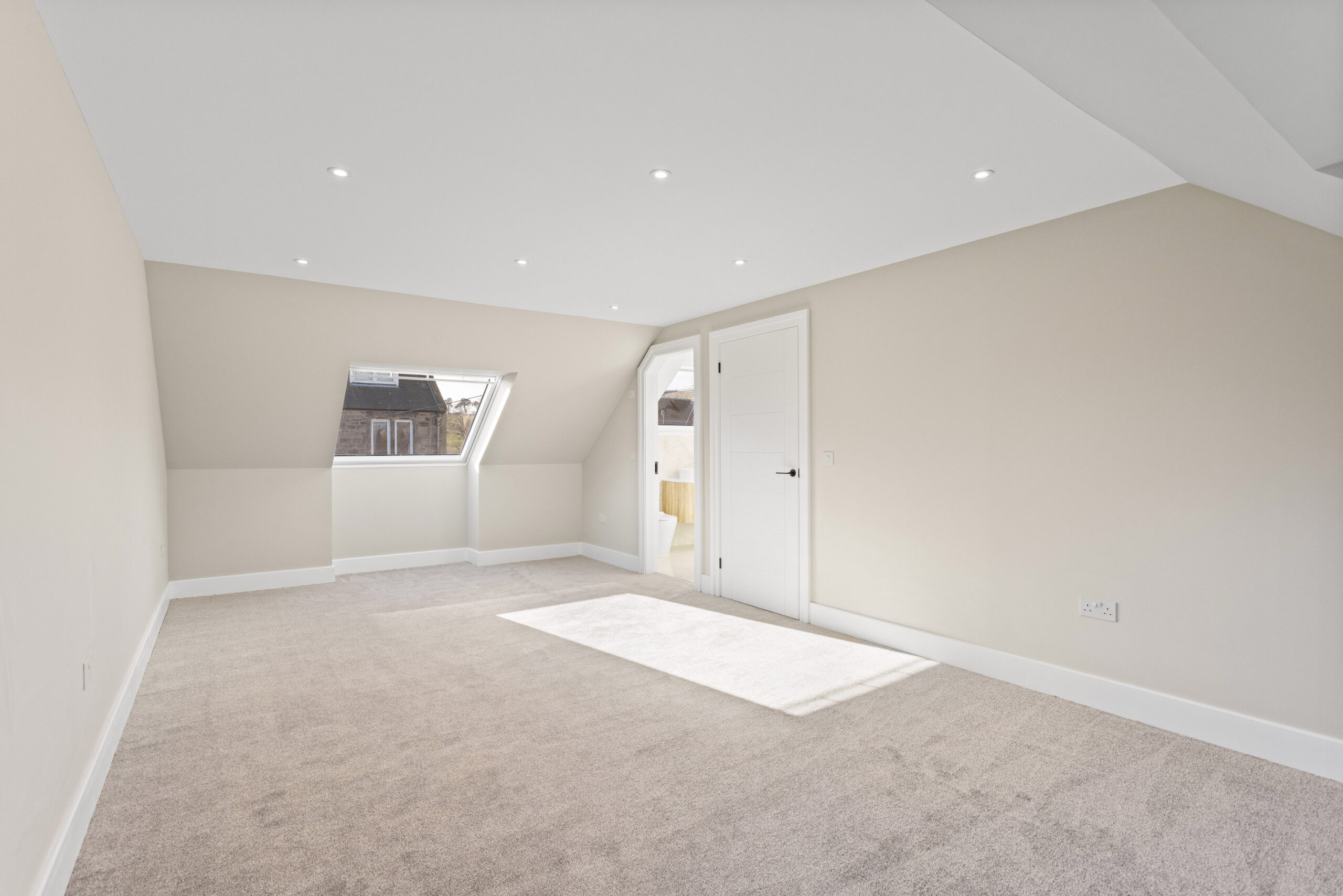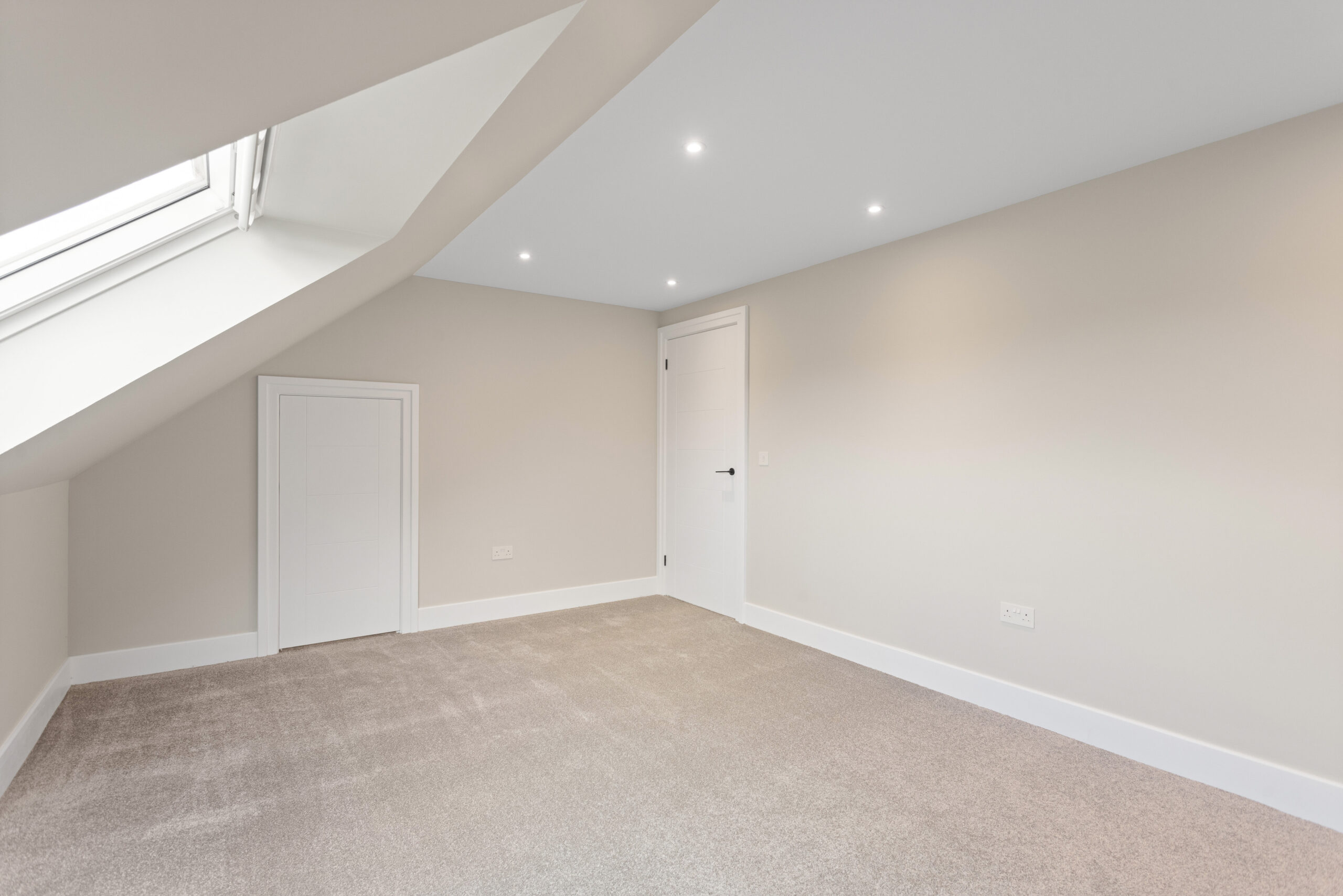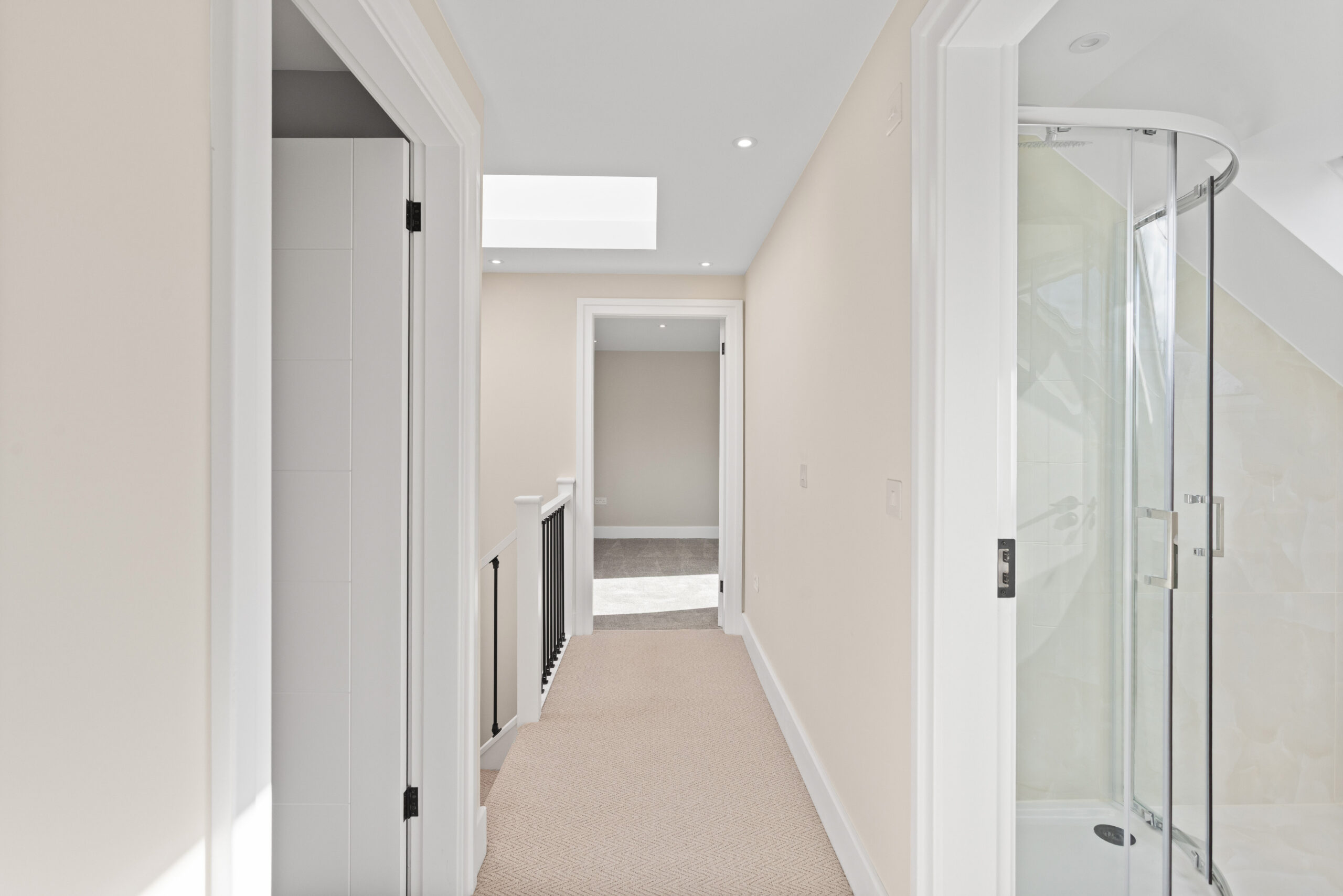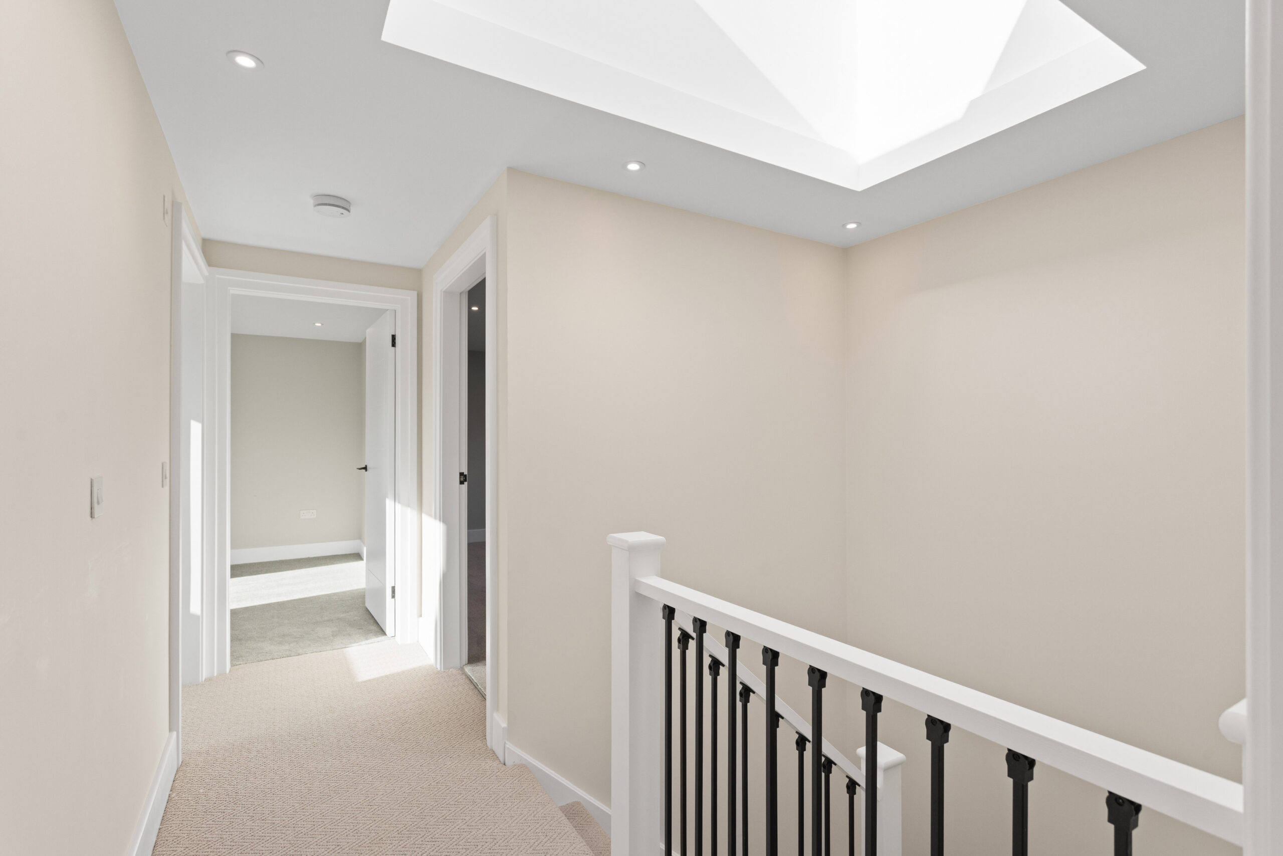 Ascending the staircase, finished in a beautiful herringbone style carpet, the attention to detail continues. At the top of the stairs, a dramatic overhead rooflight floods the upper hallway with natural light, enhanced further by surrounding LED spotlights. The result is bright, airy and architecturally impressive.