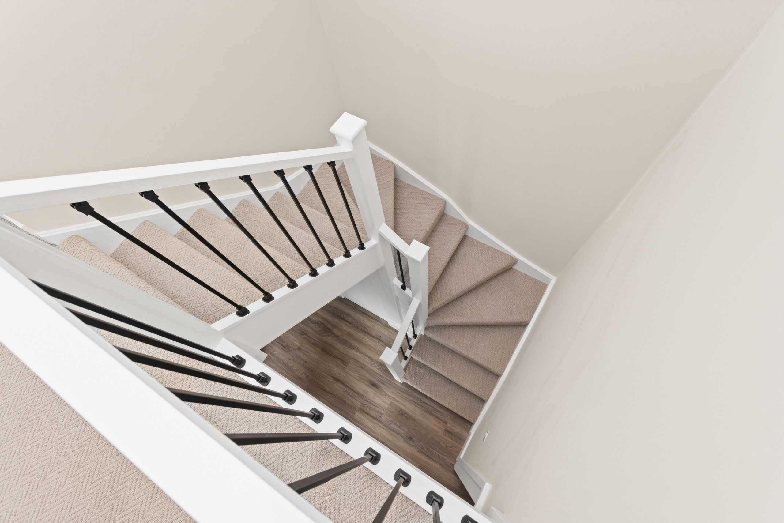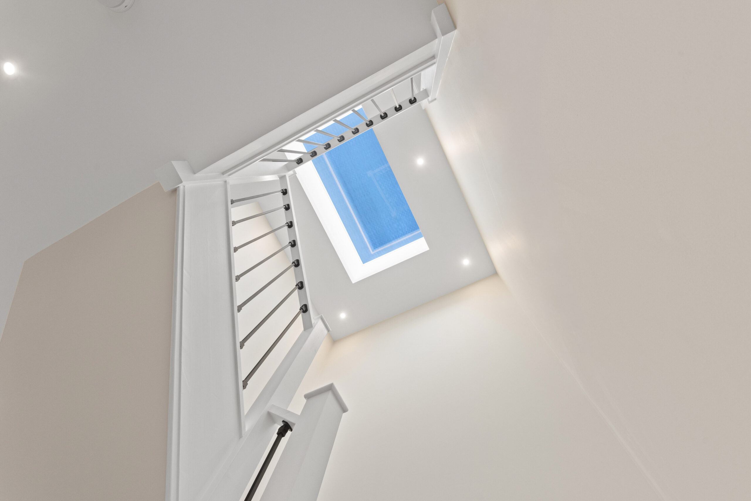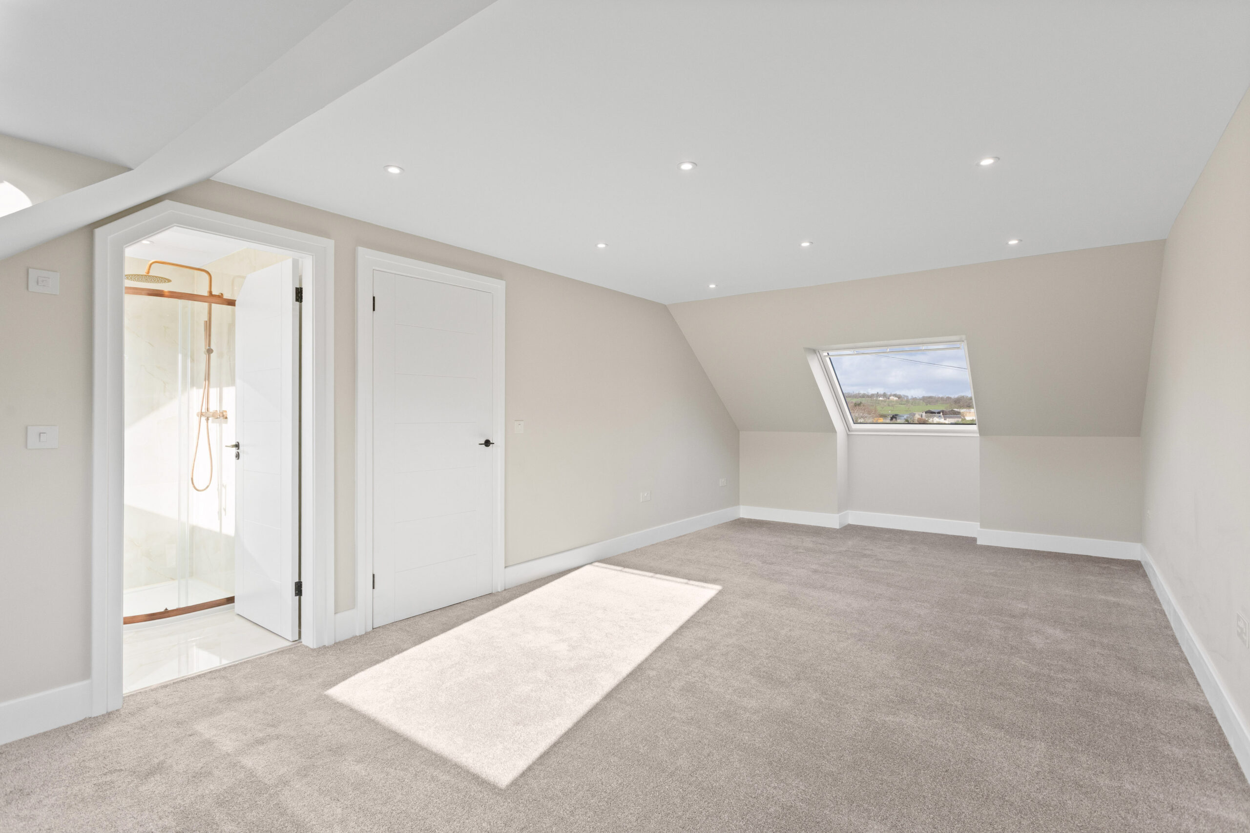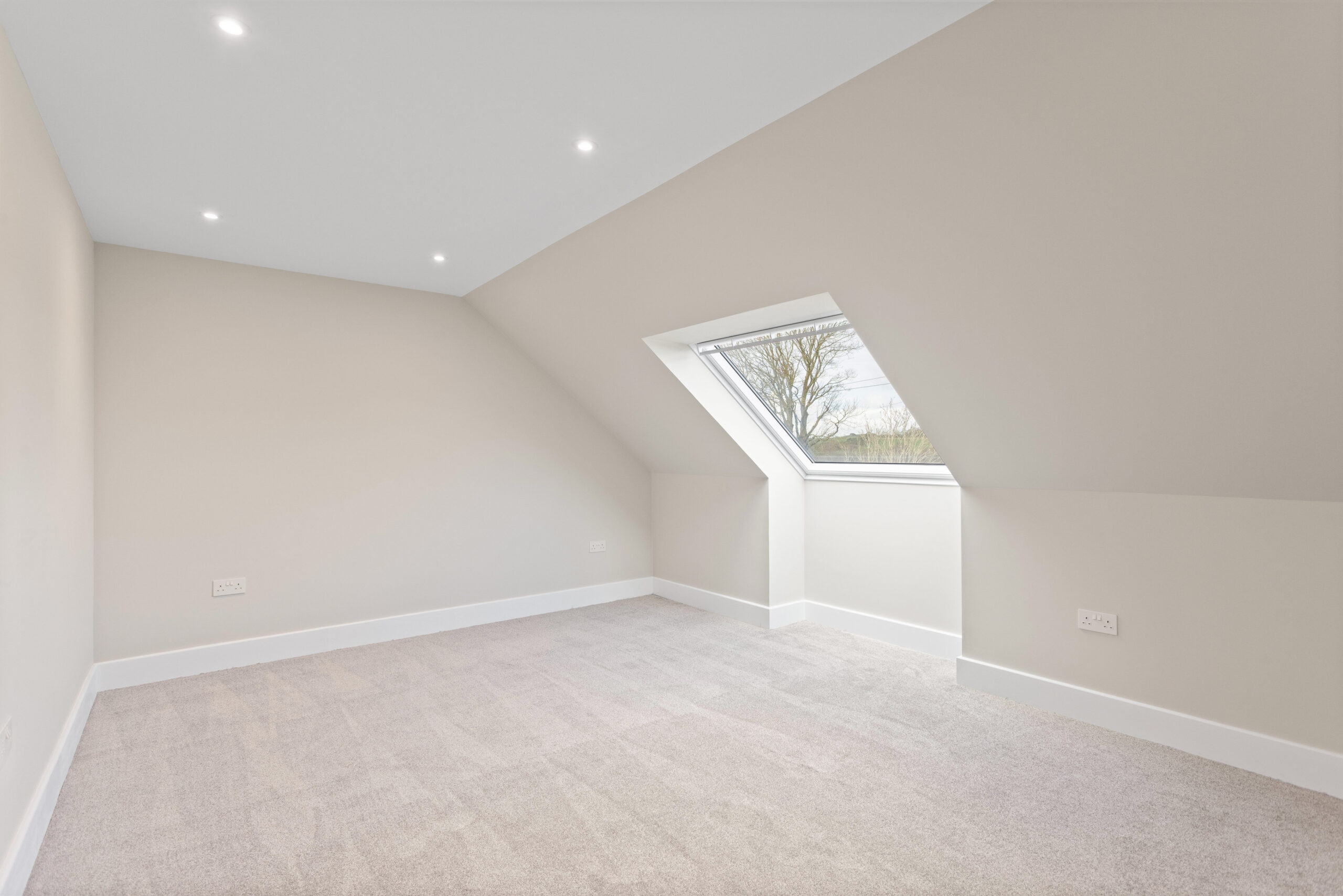 Ascending the staircase, finished in a beautiful herringbone style carpet, the attention to detail continues. At the top of the stairs, a dramatic overhead rooflight floods the upper hallway with natural light, enhanced further by surrounding LED spotlights. The result is bright, airy and architecturally impressive.