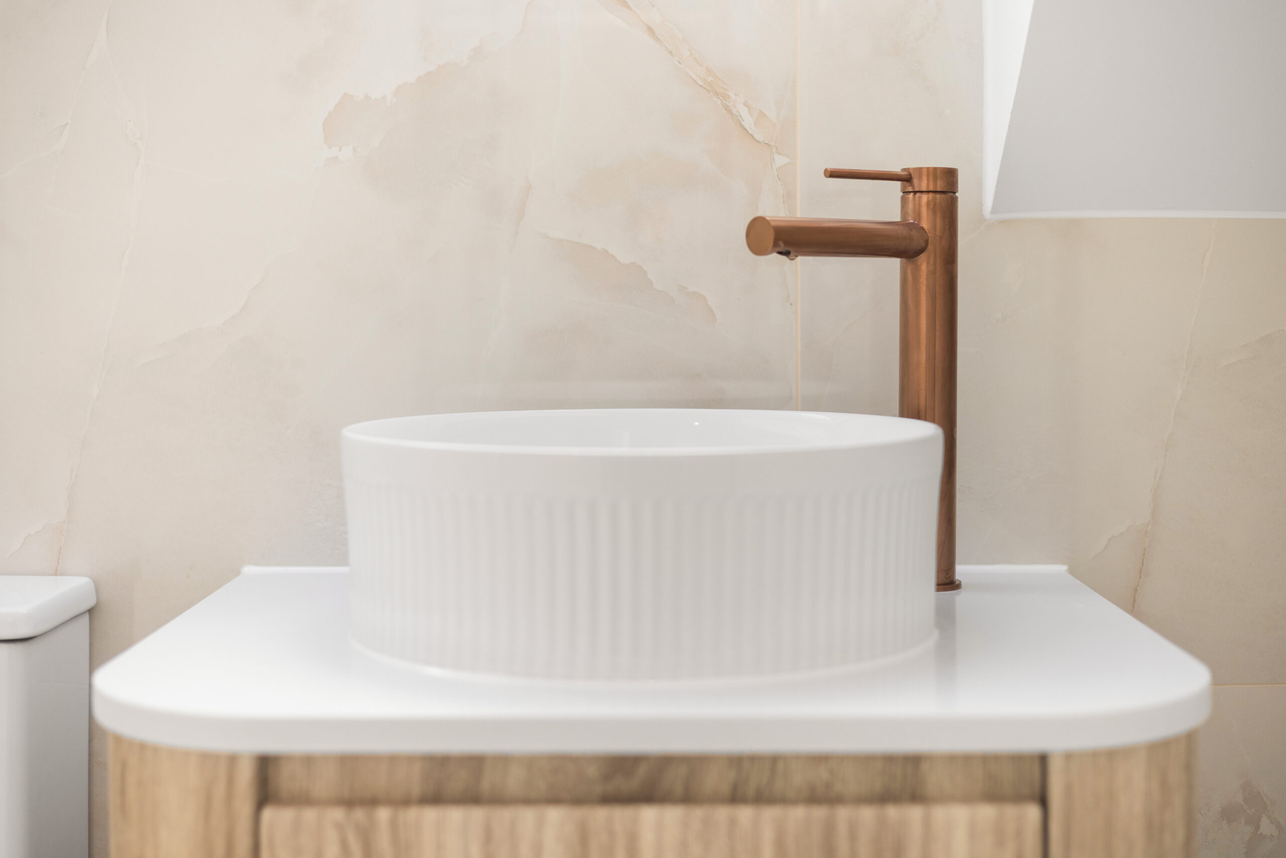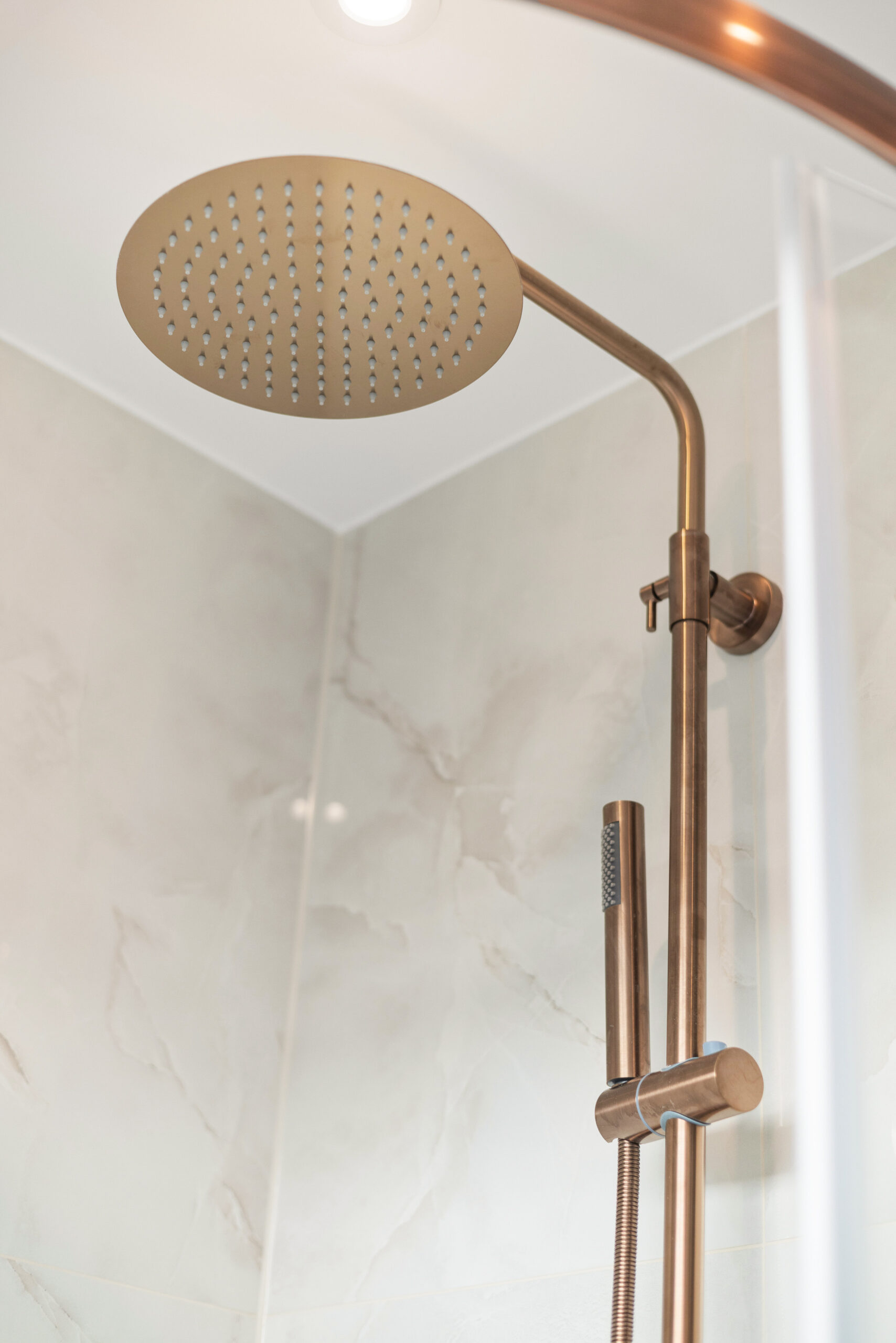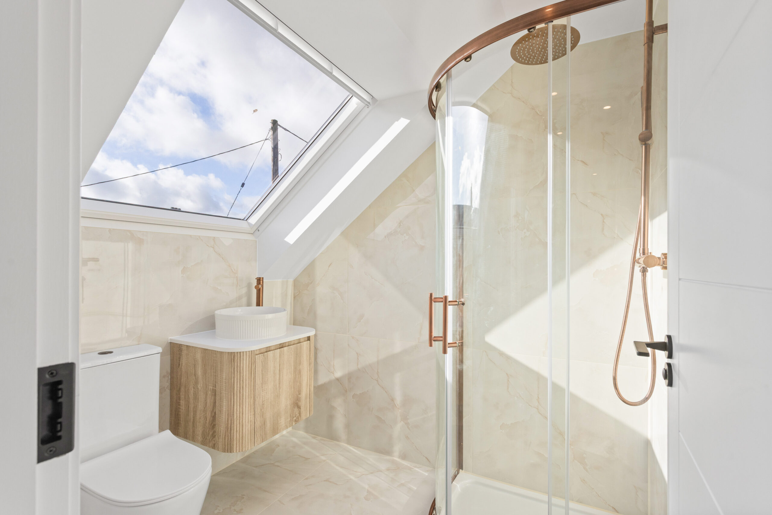 The accompanying en-suite is equally impressive, fully tiled from floor to ceiling with elegant rose gold detailing throughout. From the shower enclosure trim to the taps and fixtures, the warm metallic accents create a unique and sophisticated finish. Complete with shower, WC and contemporary basin, this is a beautifully curated private sanctuary.