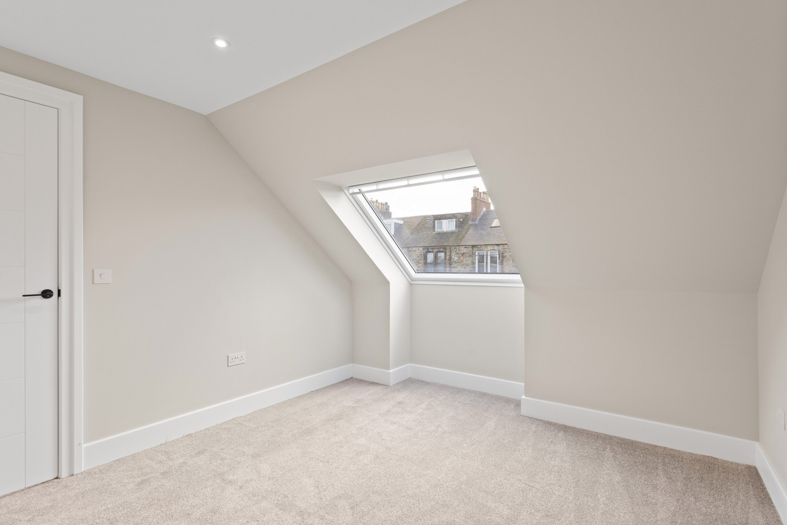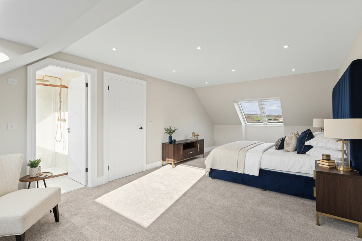 To the left lies the principal bedroom suite, an expansive retreat running the full length of the property. This remarkable space easily accommodates a super king size bed, additional furnishings and wardrobes while still feeling open and restful. Dual aspects to the front and rear allow natural light to pour in, with large Velux windows framing views across both elevations.