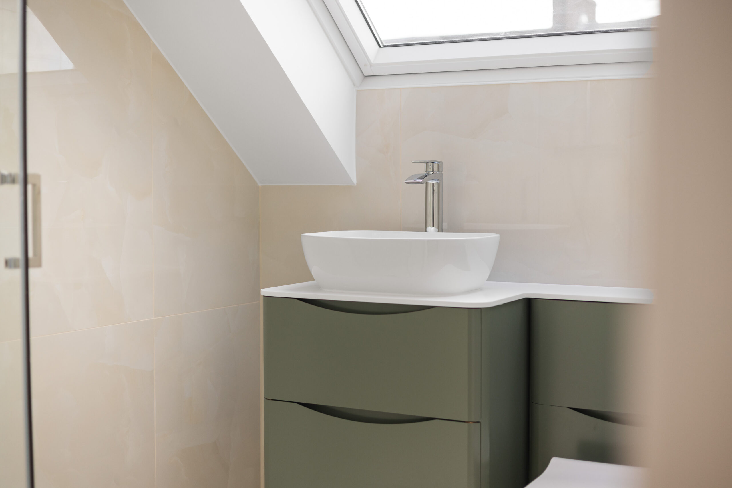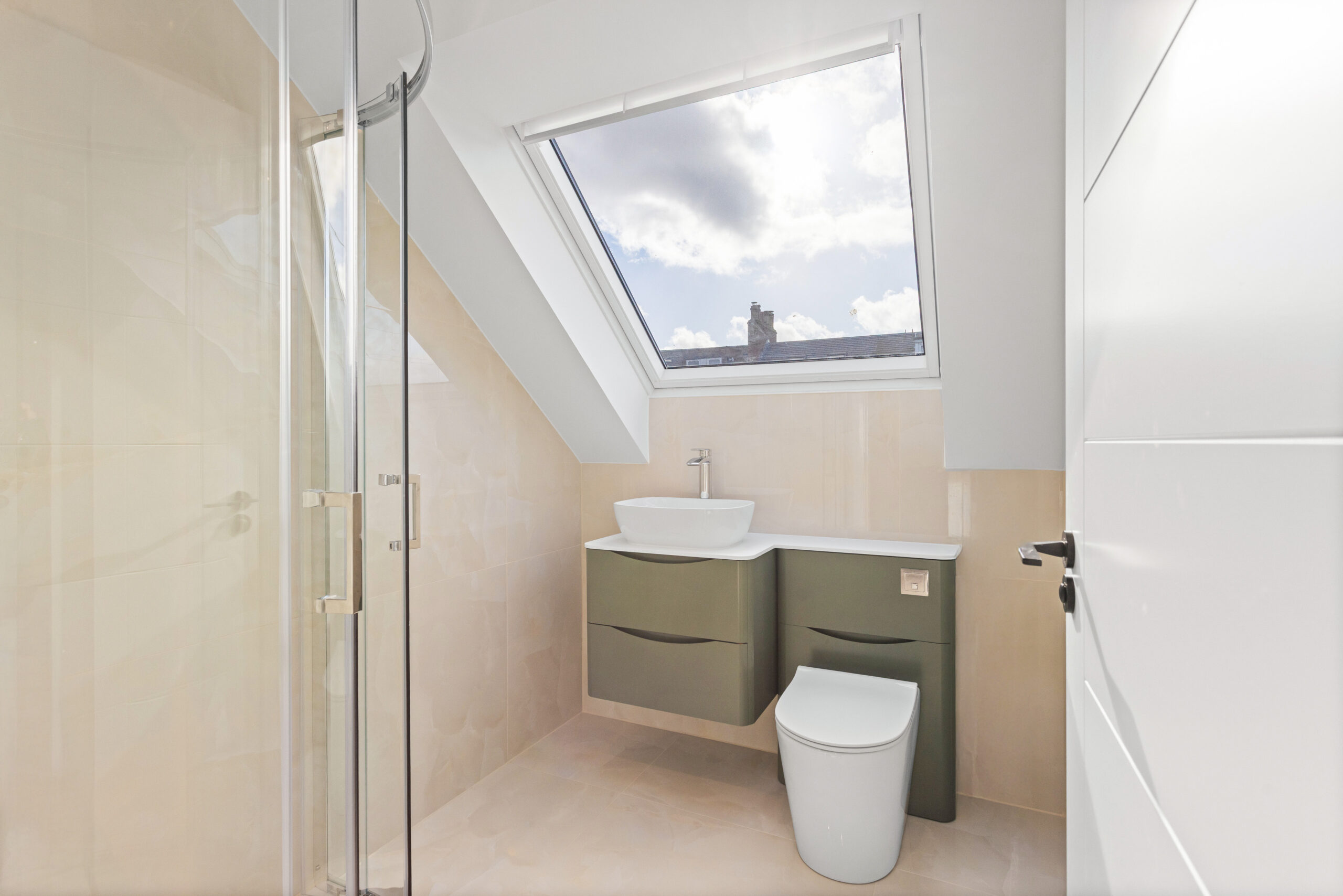 Further along the hallway sits the second family bathroom upstairs, again finished in glossy neutral tiles, featuring a striking dark green vanity unit that adds depth and personality to the space.
