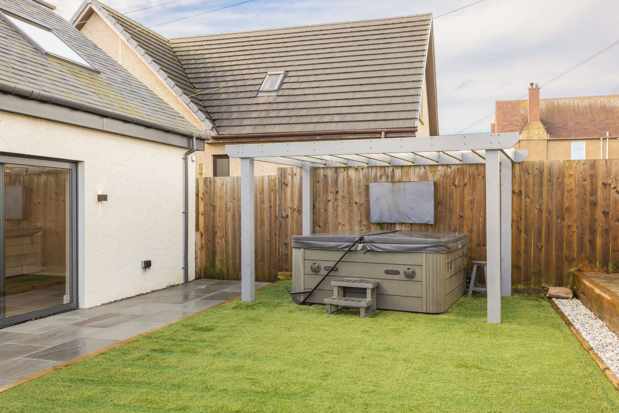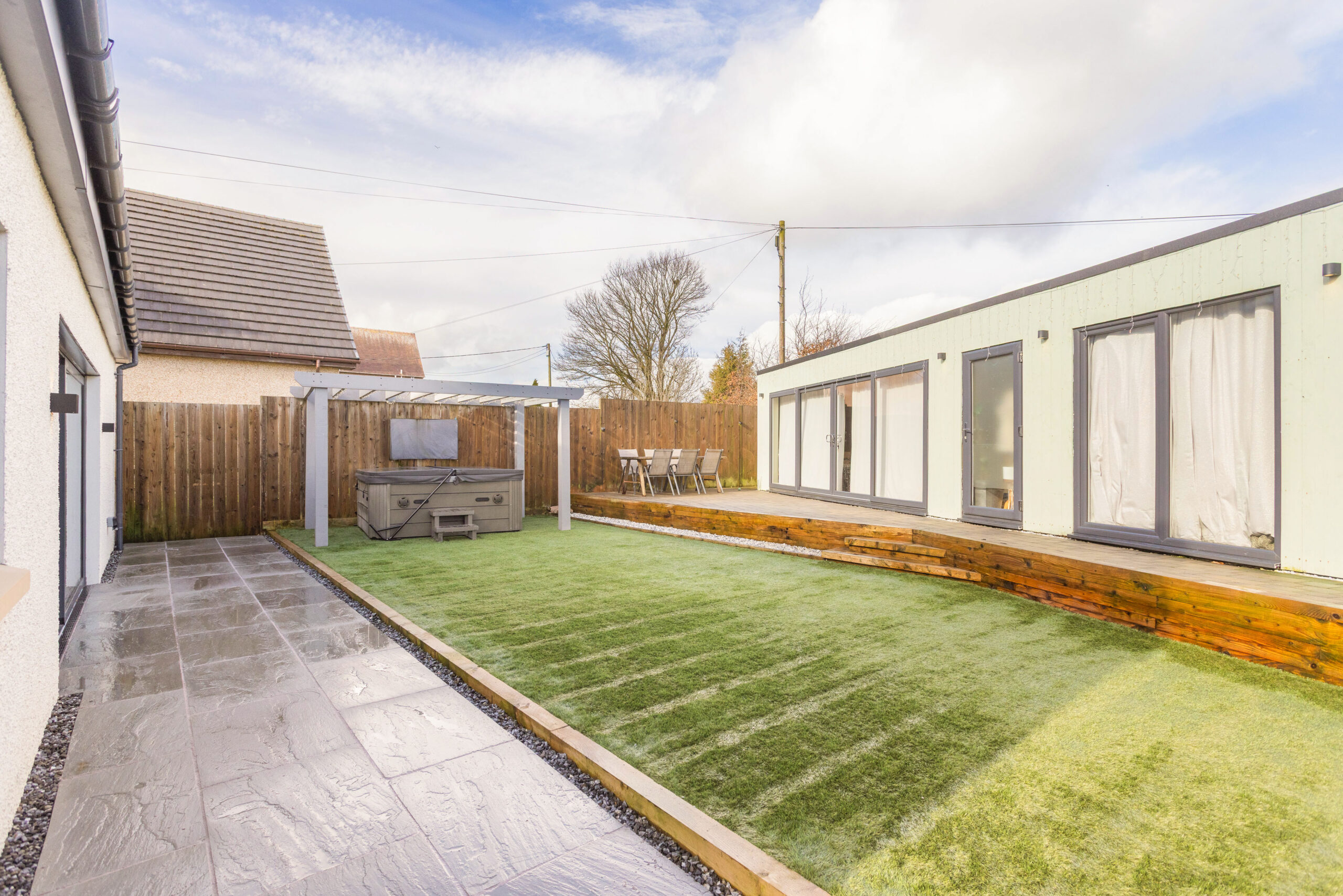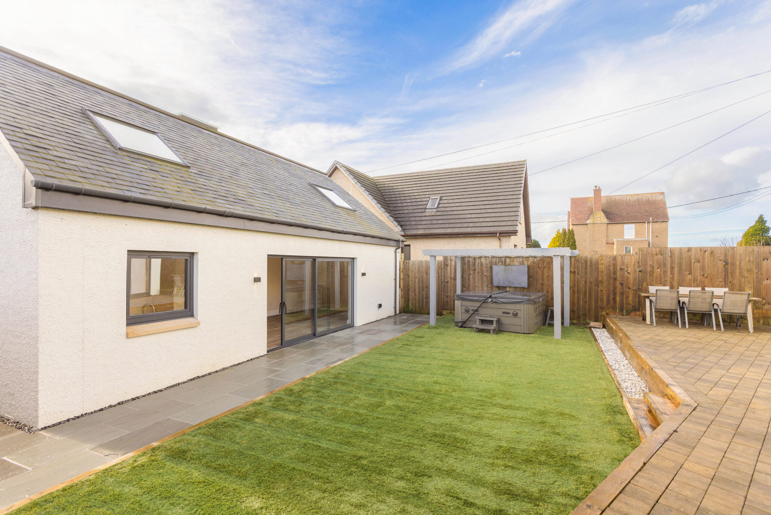 Outside, the garden has been designed with lifestyle in mind. A low maintenance combination of sandstone tiling and artificial lawn provides year round usability, while the absence of neighbouring properties behind allows uninterrupted views across open farmers’ fields, offering privacy and a wonderful sense of tranquillity.