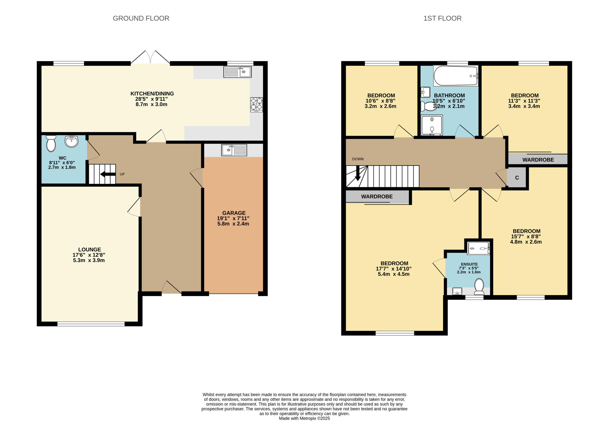 Completing the downstairs layout is a spacious and well-finished WC. It features a large mirror, partial tiling and excellent storage, practical, neutral and ready for the new owner’s personal touch. The large integral garage provides further flexibility, with internal access from the main home and generous storage, the area currently features a utility space, as well as potential for conversion into a home gym, or workshop space.