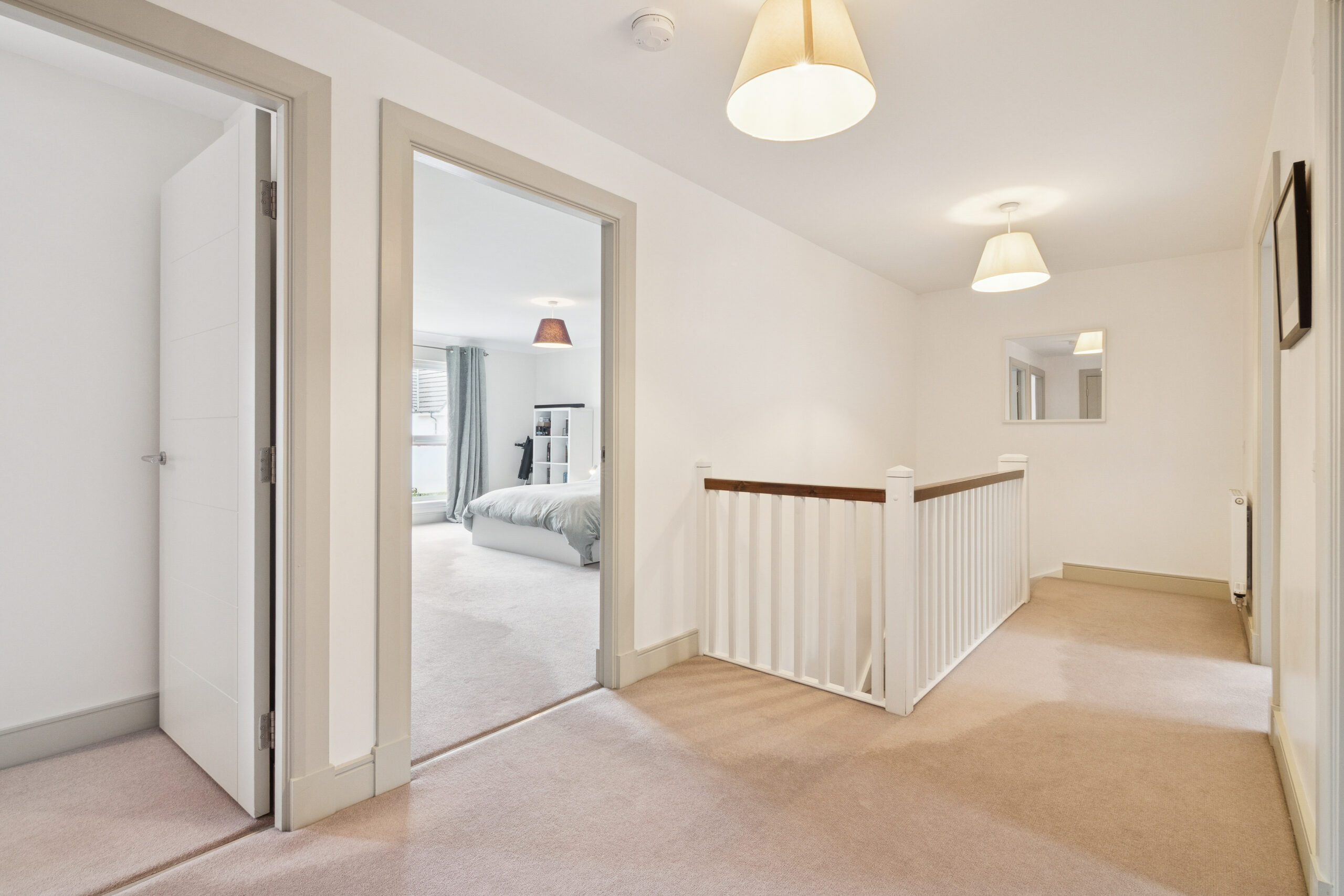 Upstairs, the sense of space continues. The bright, airy landing leads to four beautifully proportioned bedrooms, all finished in fresh, neutral tones. The main bedroom is a superb size, comfortably accommodating a super king bed with ample room for freestanding furniture. It also benefits from large fitted wardrobes and a stylish en-suite complete with walk-in shower and sleek, modern finishes. Bedrooms two and three both feature fitted wardrobes, offering excellent storage, while the fourth bedroom big enough to fit a double bed provides versatility as a home office, nursery or guest room.