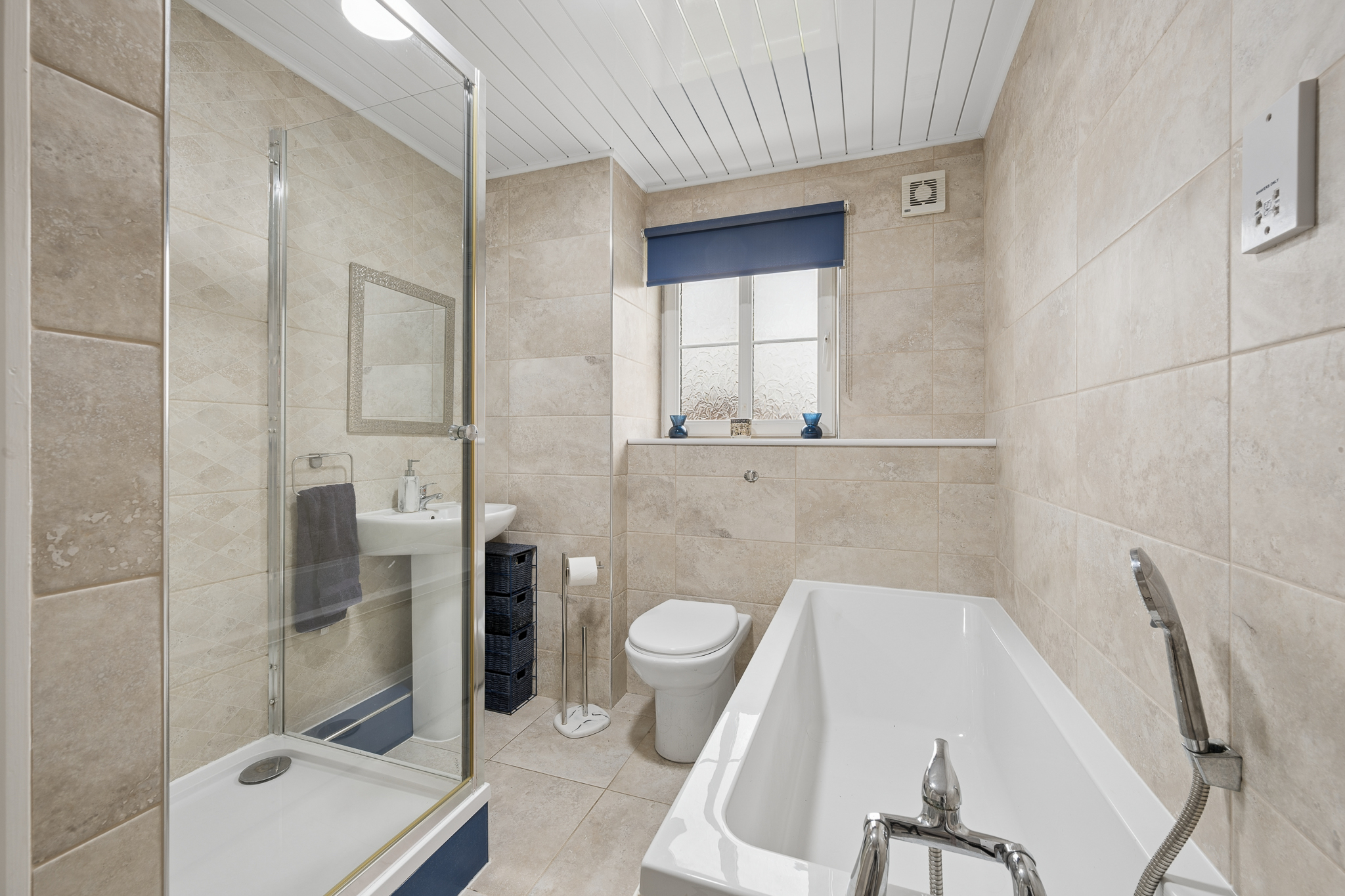 The main bathroom is a particularly attractive feature of the home, offering a spacious four piece suite comprising a bathtub, separate standing shower, WC and wash hand basin. The room is fully tiled, finished with neutral tones and chrome accents and includes additional built in storage.