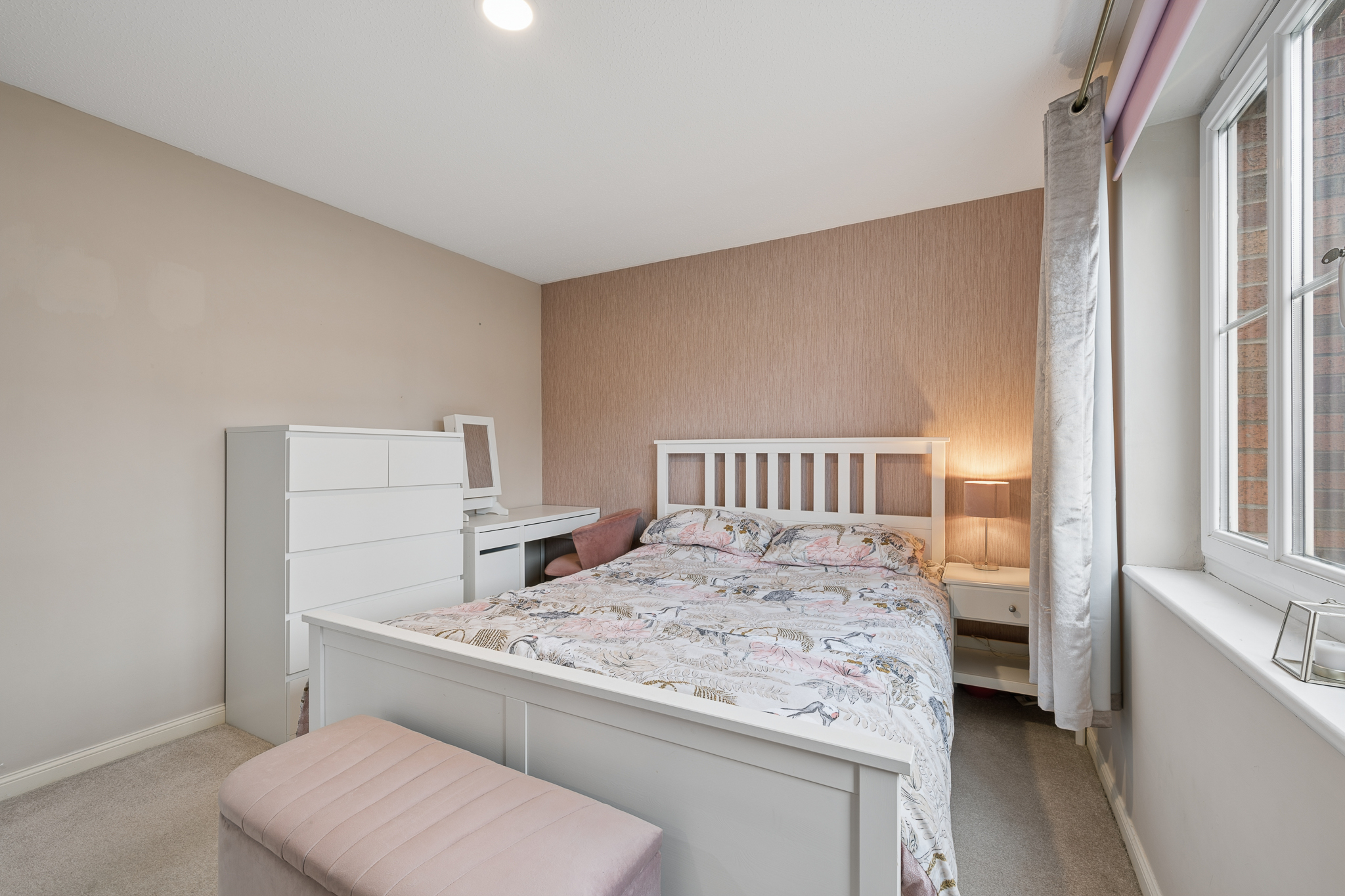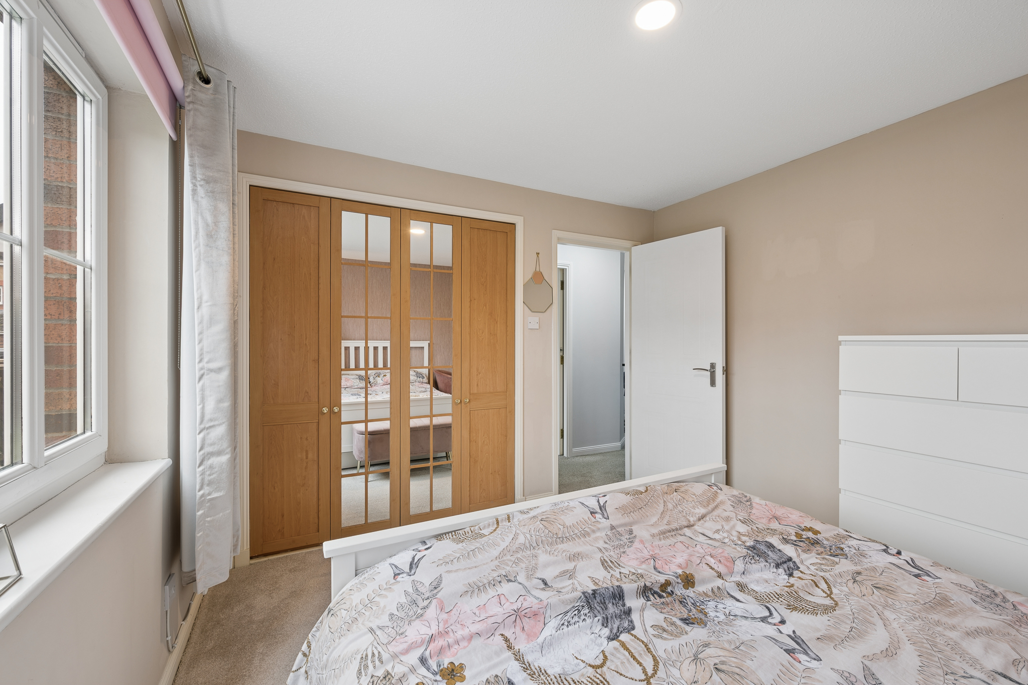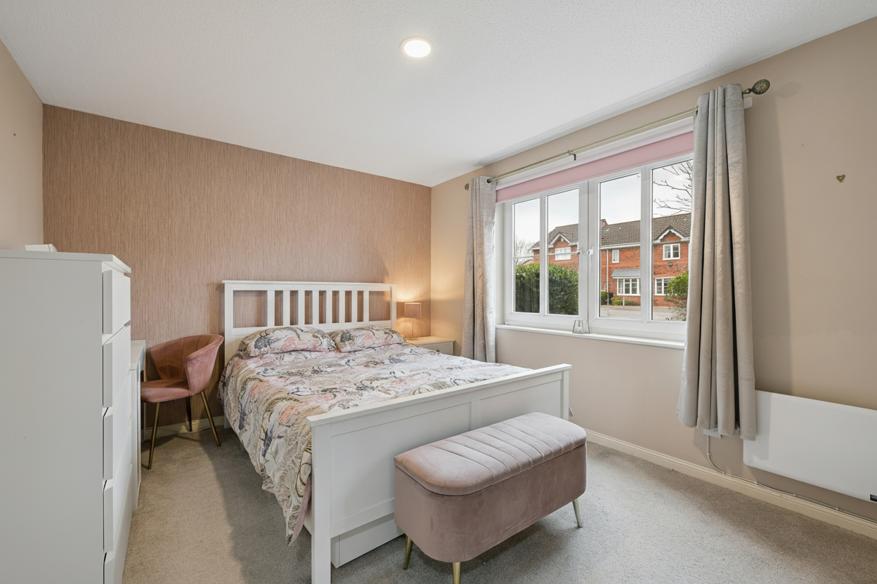 Bedroom one is a generously sized double room, comfortably accommodating a king size bed along with bedside cabinets and a chest of drawers. A fitted wardrobe provides excellent storage, while the large window allows in plenty of natural light. Bedroom two is another well proportioned double room, currently arranged as a daybed and home office and also benefits from its own fitted wardrobe, making it a versatile space suitable for guests, working from home or additional storage.