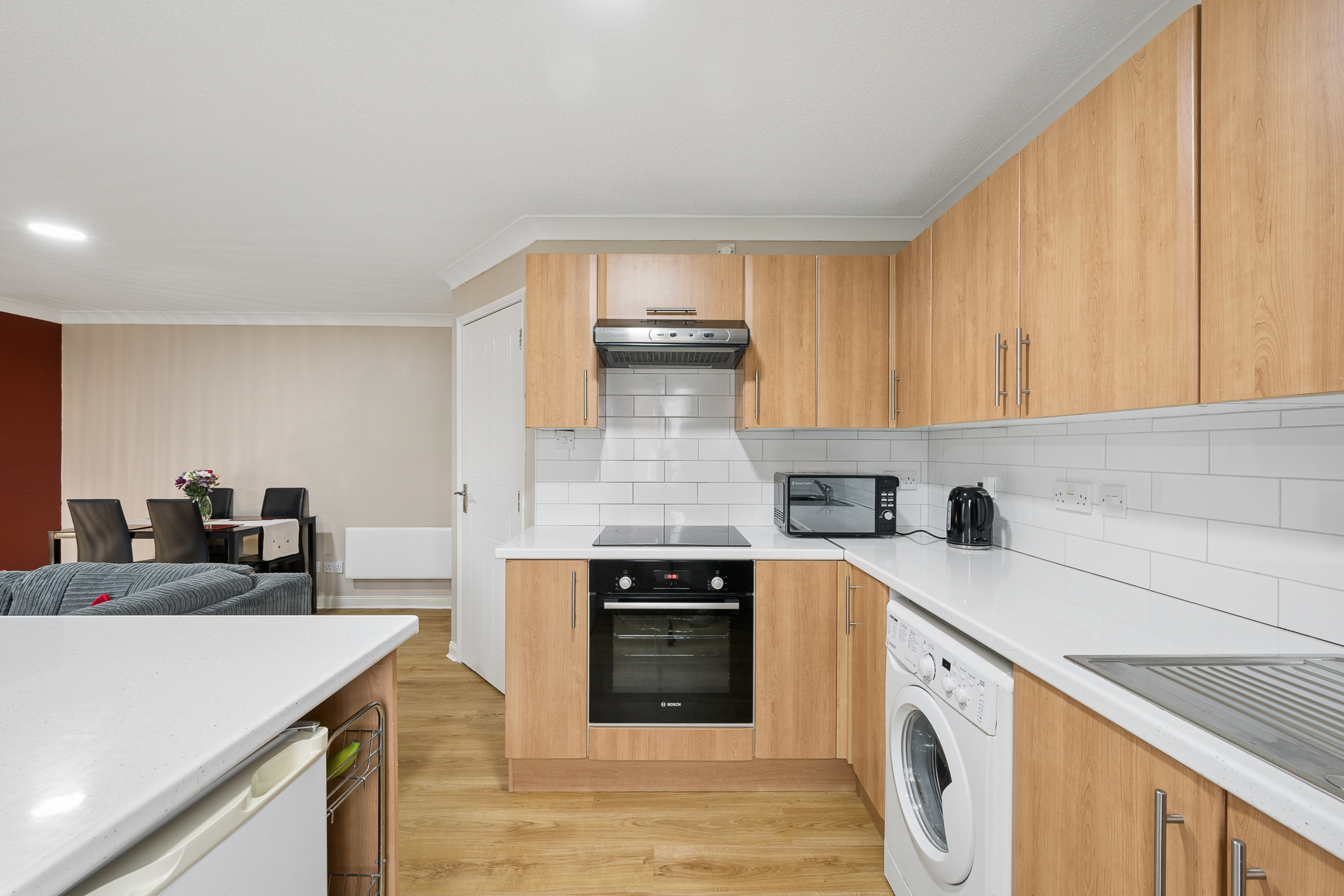 The kitchen sits neatly within the open plan layout and is well equipped with everything required for modern living. It features a four point induction hob, integrated oven, splashback tiling and wood effect cabinetry, along with under counter space for a washing machine and fridge freezer. Chrome finishes complete the space, giving it a clean and practical finish.