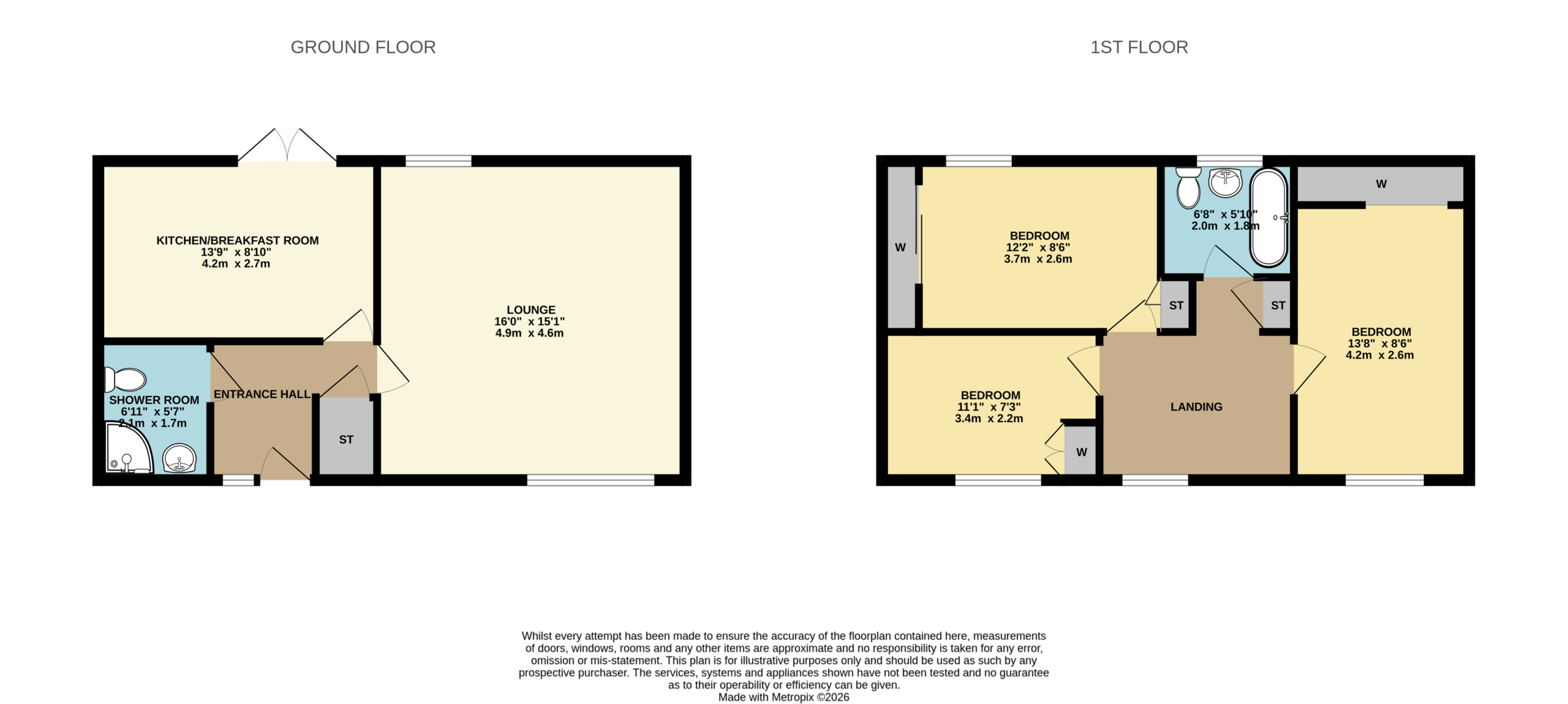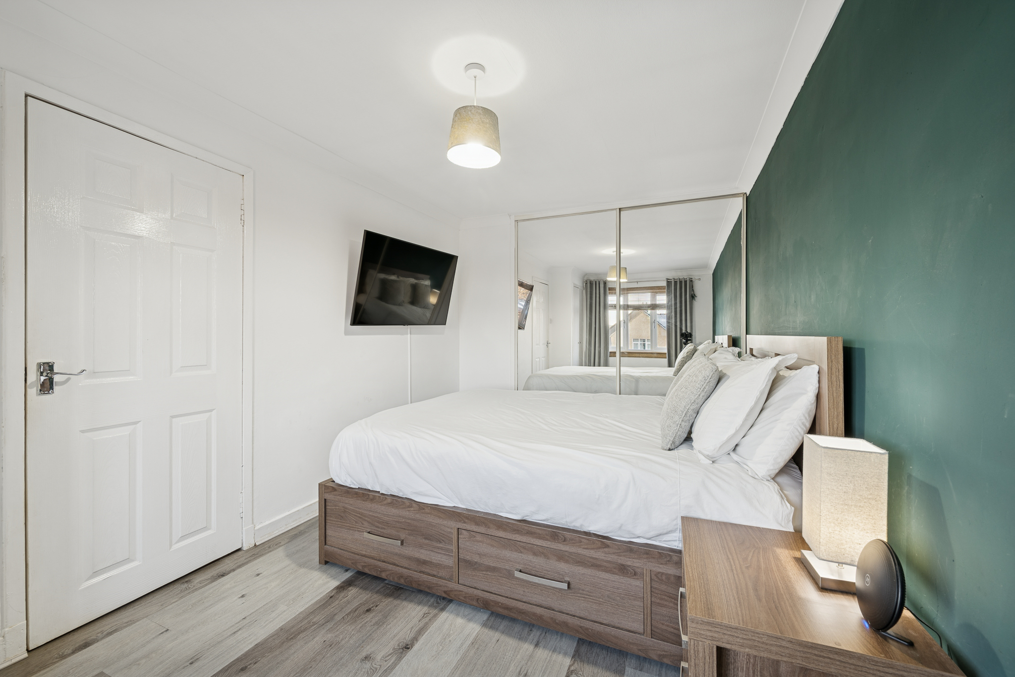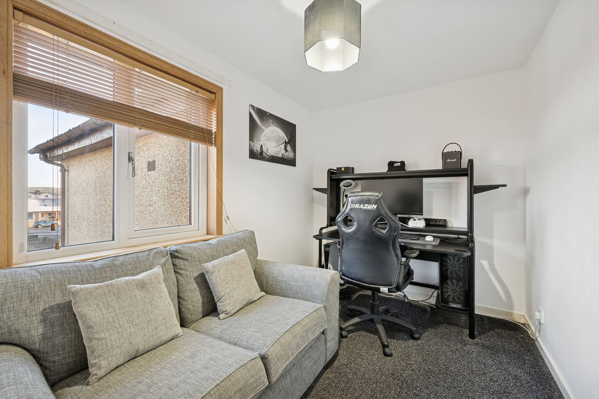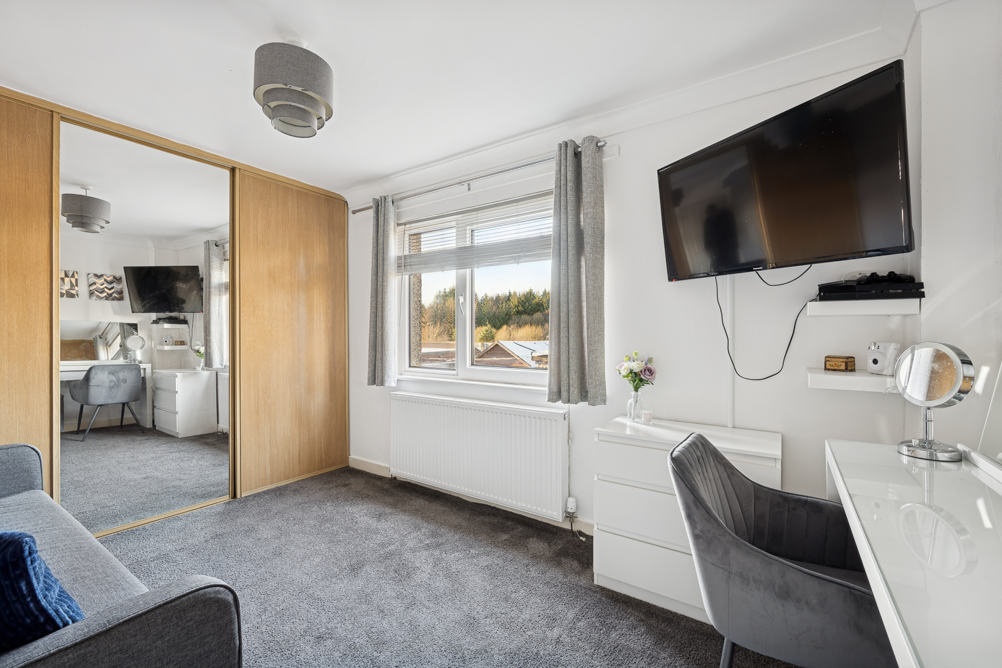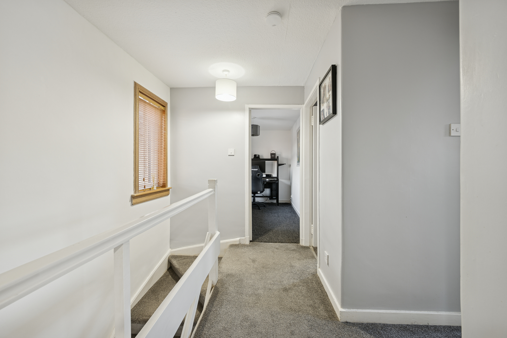 Upstairs, the spacious landing benefits from a large linen cupboard offering excellent storage. The principal bedroom comfortably accommodates a king size bed with bedside cabinets and features a large fitted wardrobe with sliding doors, along with a front facing window that brings in plenty of natural light. Bedroom two is another generous double room, capable of hosting a king size bed and benefits from a large fitted wardrobe as well as an additional storage cupboard. Bedroom three is currently used as a home office but can comfortably accommodate a single bed and also benefits from its own fitted wardrobe, making it a versatile space.