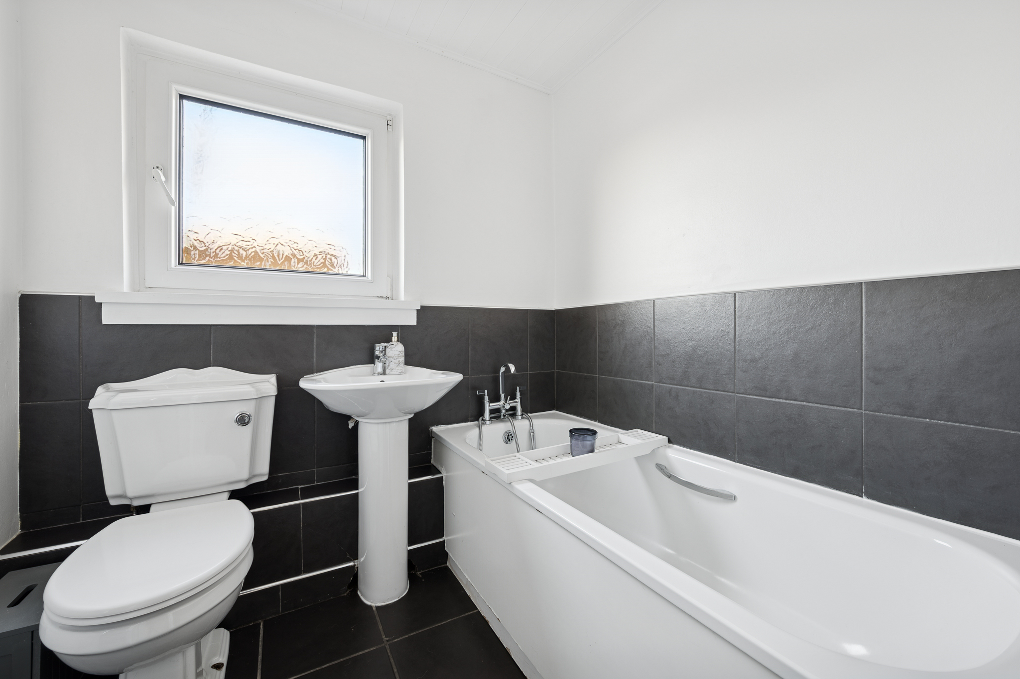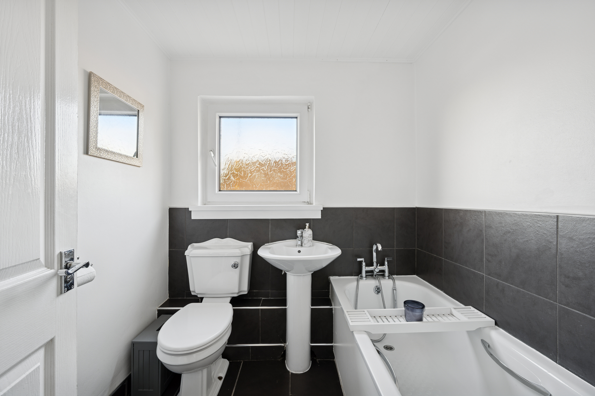 The main family bathroom is half tiled and fitted with a three piece suite, including a bathtub and chrome heated towel rail, providing a clean and functional finish.