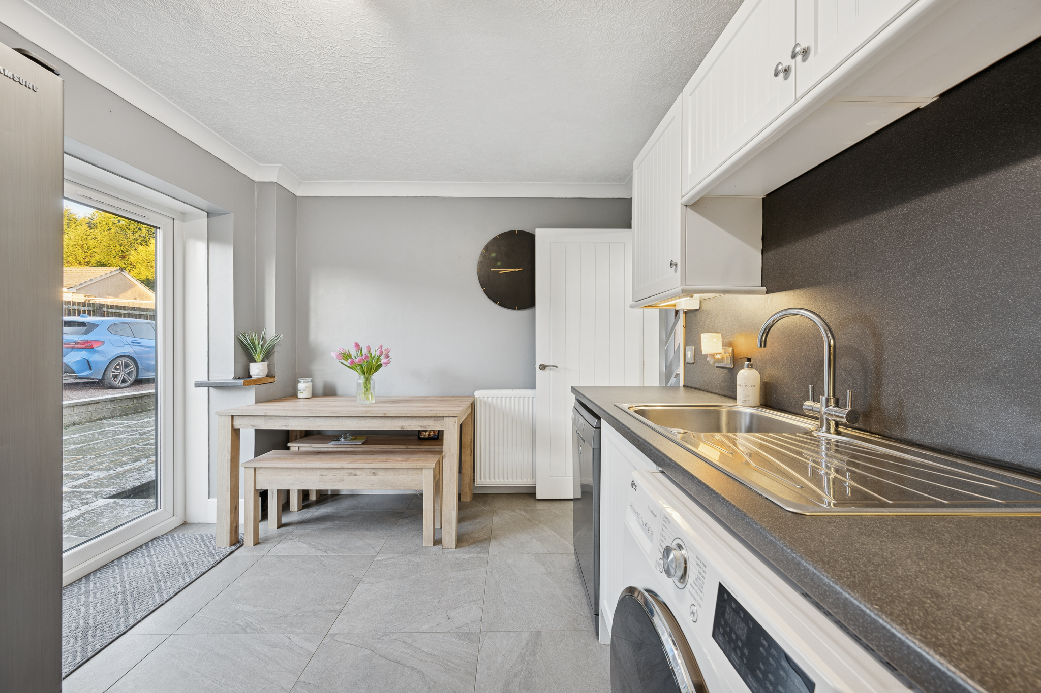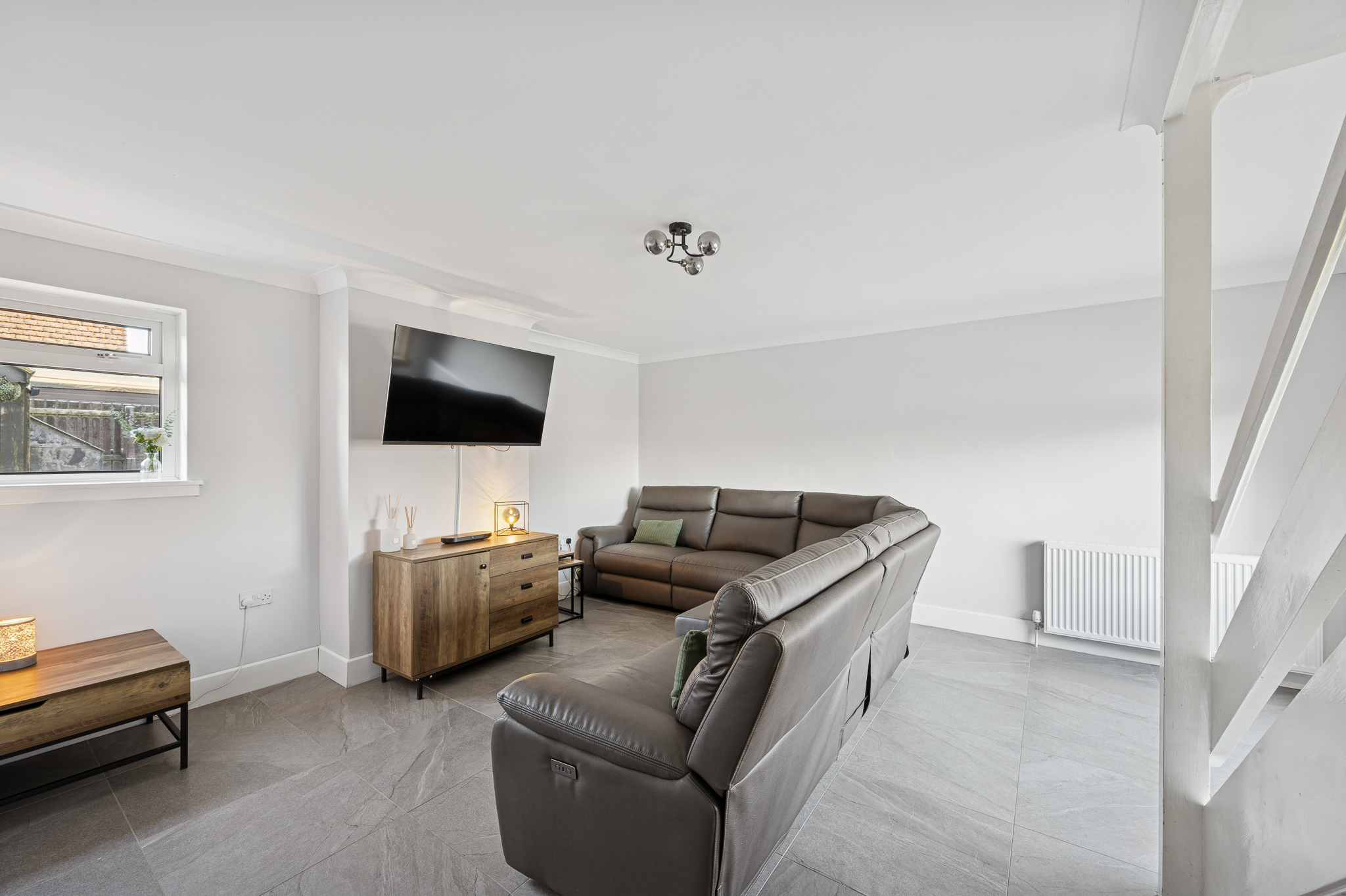 On entering the home, you are welcomed into a bright and inviting hallway. To the right hand side is the spacious lounge, which comfortably accommodates two large sofas and a media wall, with additional storage neatly tucked beneath the staircase. A large front facing window allows natural light to flood the room, creating a warm and welcoming space for relaxing or entertaining.