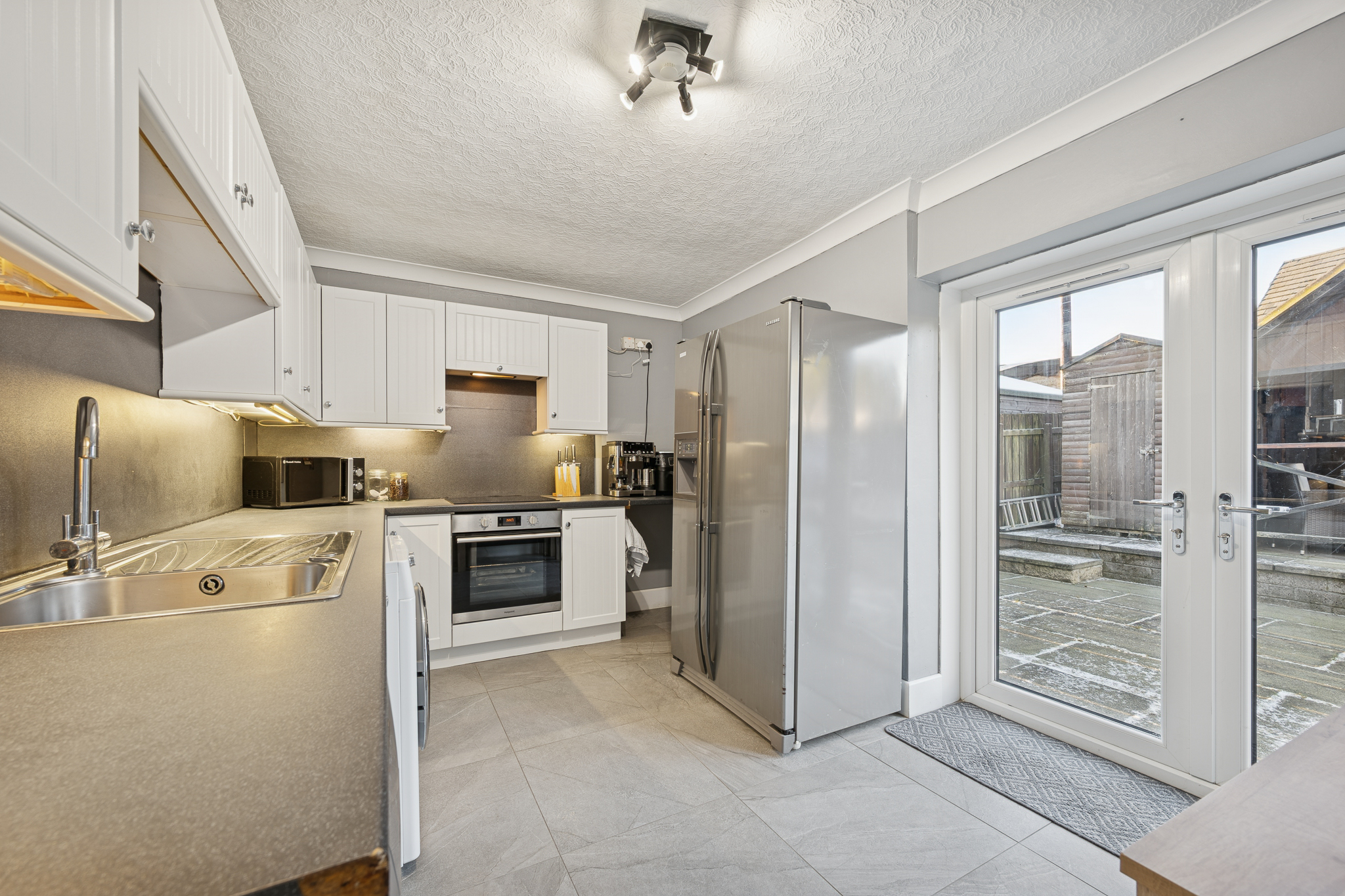 To the rear of the property is the open plan kitchen and dining area. Finished with white cabinetry, sleek worktops and chrome accents, the kitchen features a four point induction hob with integrated oven, space for a washer dryer, dishwasher and ample room for a large fridge freezer. There is generous space for dining making this a practical and sociable area. Patio doors open directly onto the rear garden, providing an easy indoor outdoor flow.